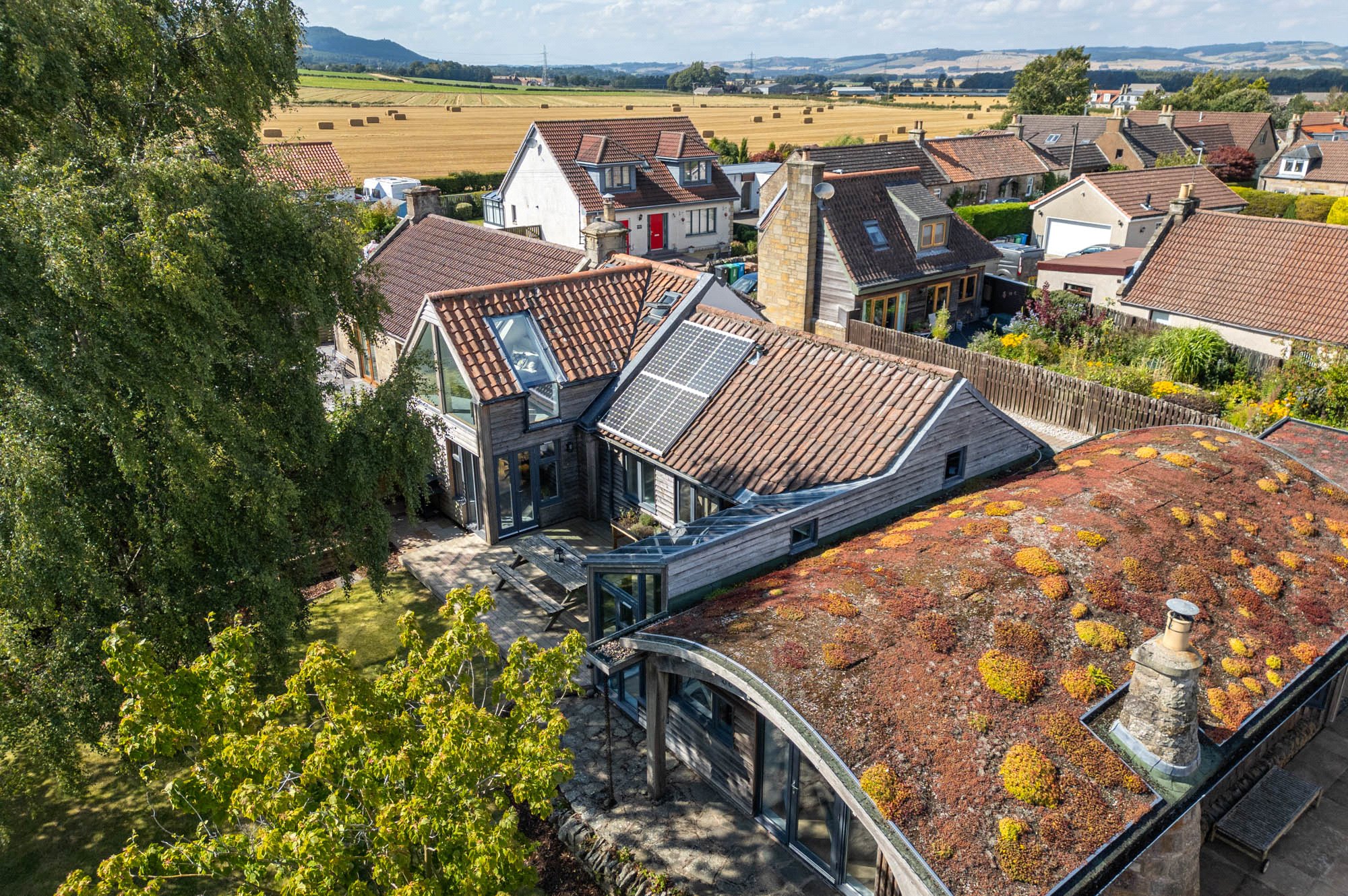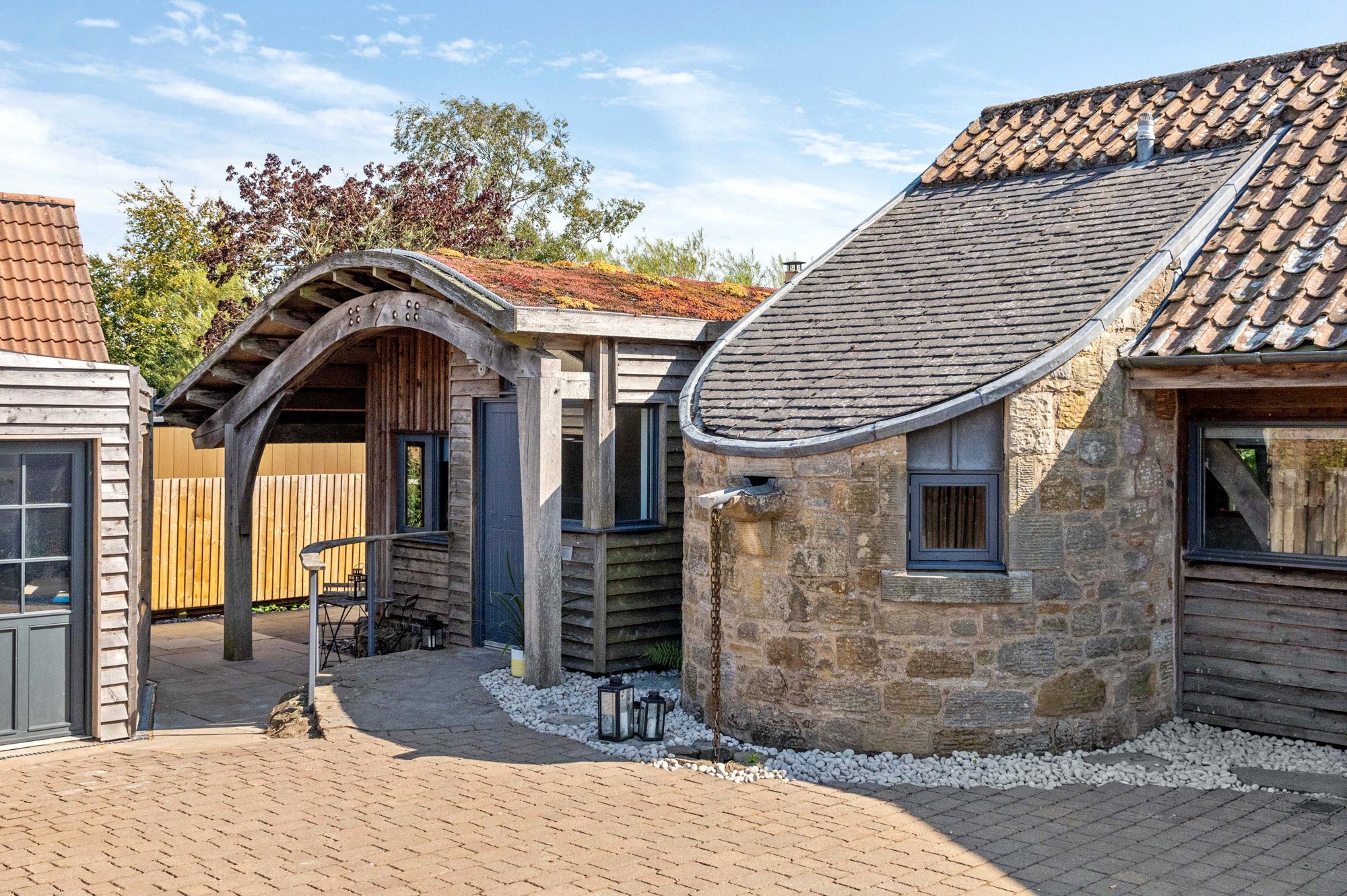2 Bruce Cottages is a truly distinctive home, thoughtfully extended and individually designed to combine striking architectural features with sustainable, eco-friendly living. Constructed with natural, renewable materials, the property exudes warmth and character, with exposed oak frame beams, bespoke stained glass, and impressive floor-to-ceiling glazing that floods the interior with natural light.