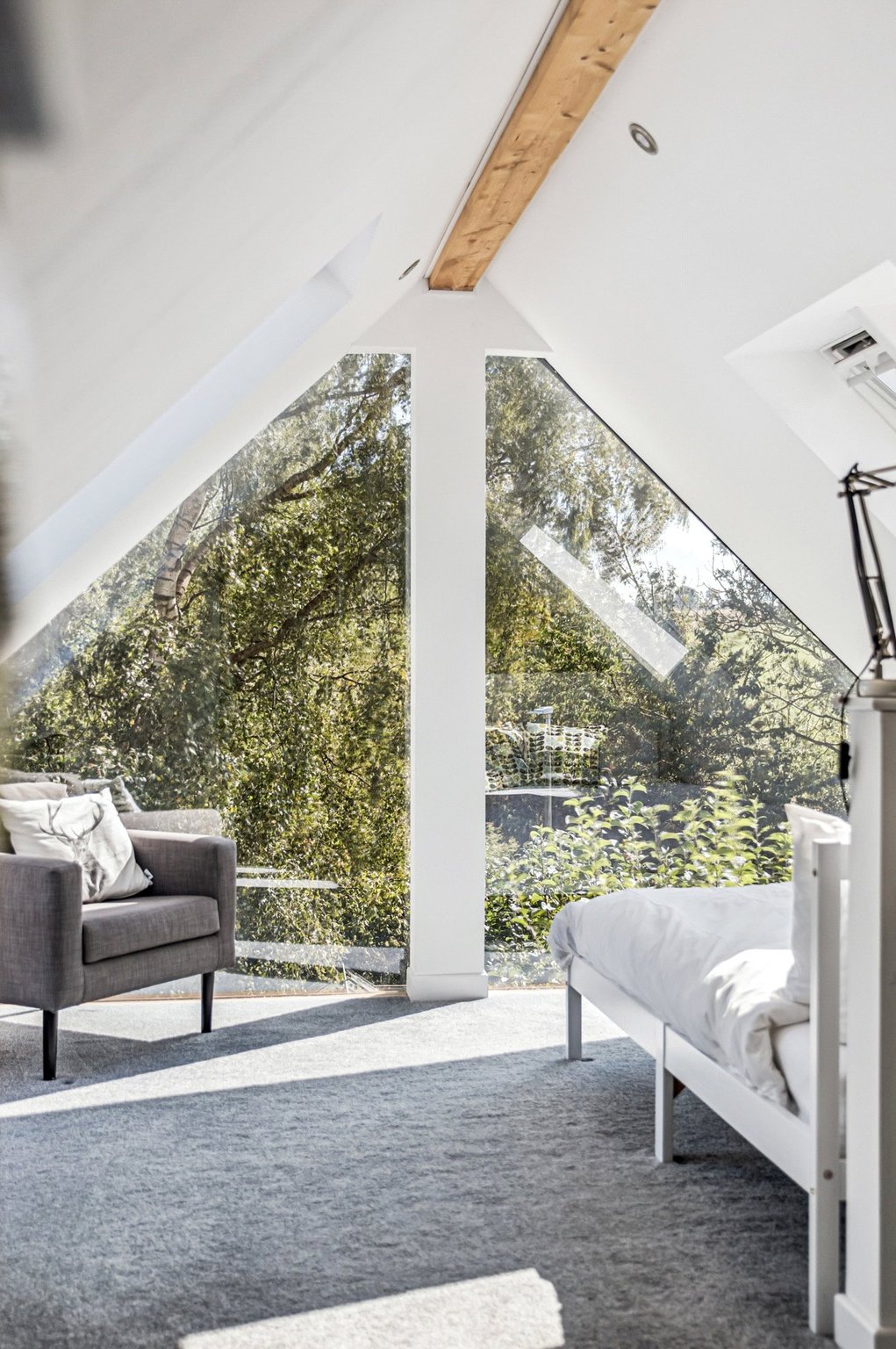 - Lounge: double-height floor-to-ceiling glazing framing garden views, woodburning stove, and stained glass detail