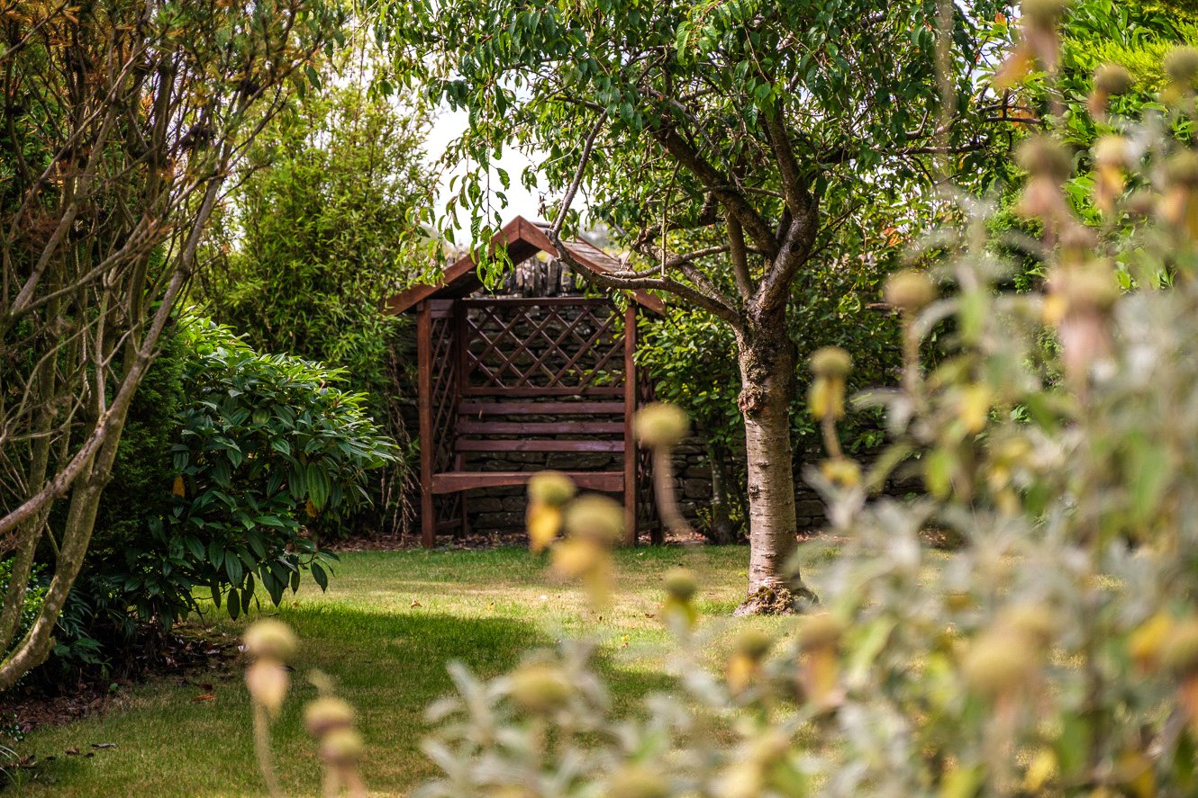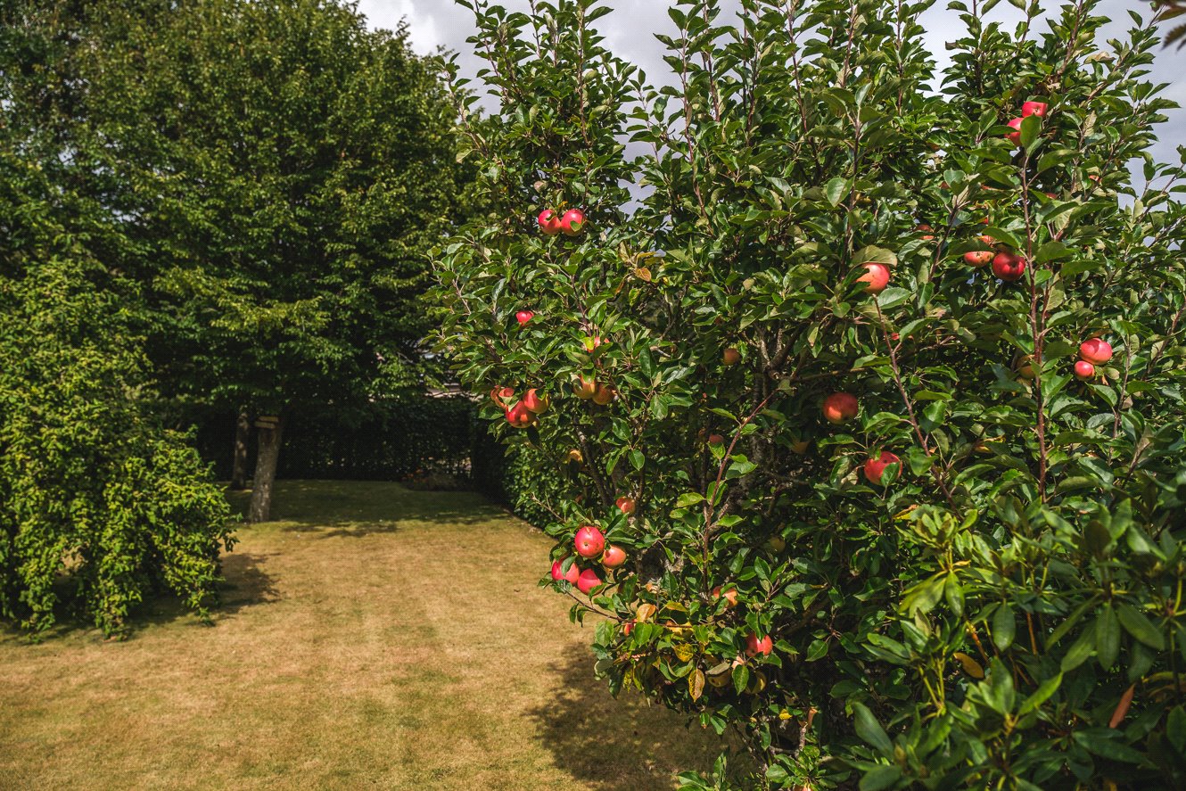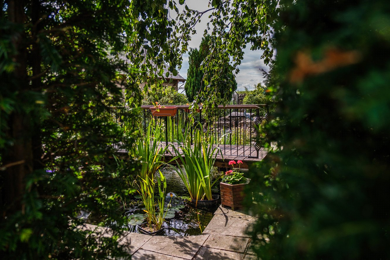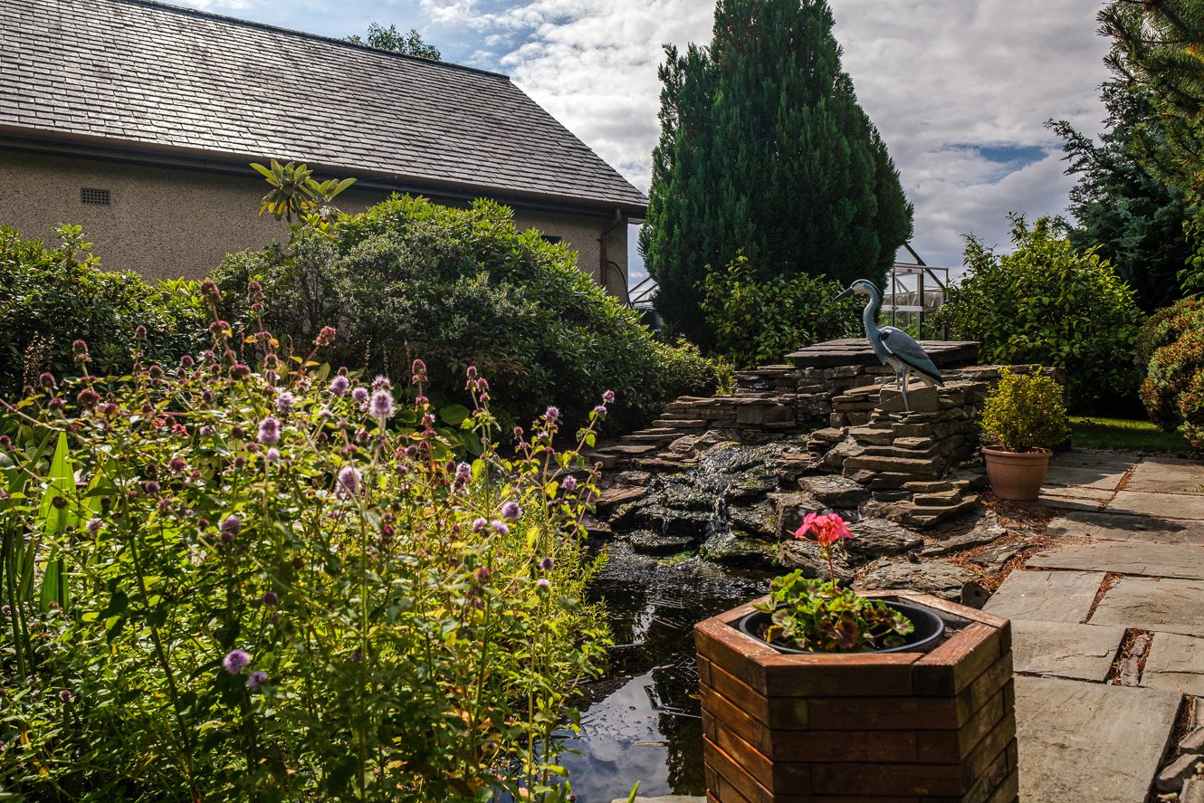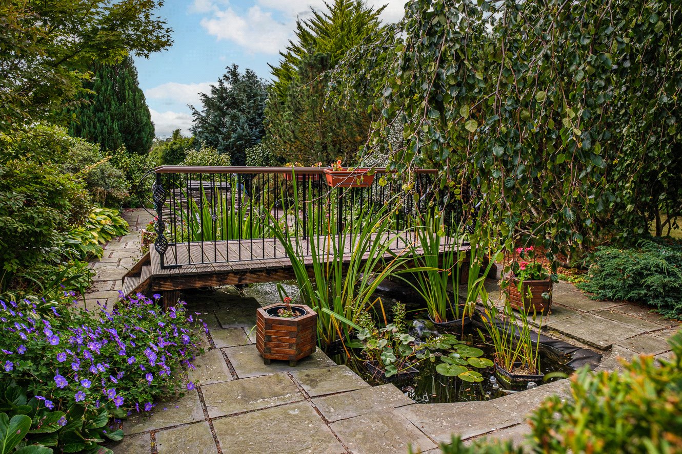 The gardens provide a peaceful setting, beautifully landscaped with mature planting, Discovery apple trees, raised vegetable beds, and two greenhouses. A koi pond with a charming bridge and waterfall feature creates an attractive focal point, offering a sense of calm and privacy.