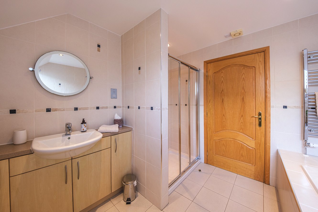 Upstairs, the master bedroom offers a luxurious retreat, featuring a striking vaulted ceiling with exposed beams, a private balcony, a sleek modern en-suite, and extensive built-in wardrobe space. Two additional double bedrooms also benefit from stylish en-suite facilities, each finished with contemporary fittings and elegant tiling. A fourth spacious double bedroom is served by a well-appointed family bathroom, while a fifth bedroom—currently used as a home office—adds further flexibility to the layout.