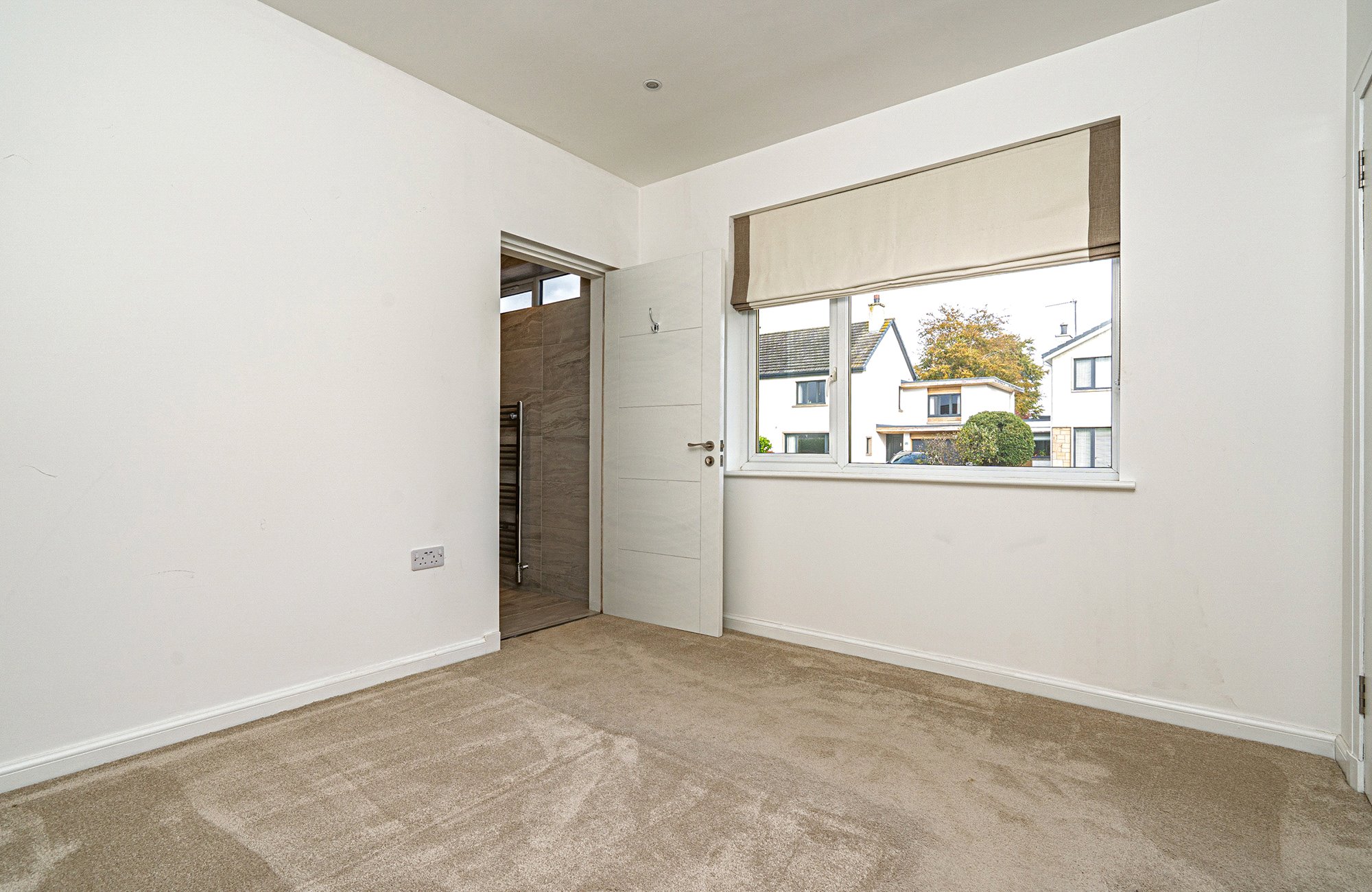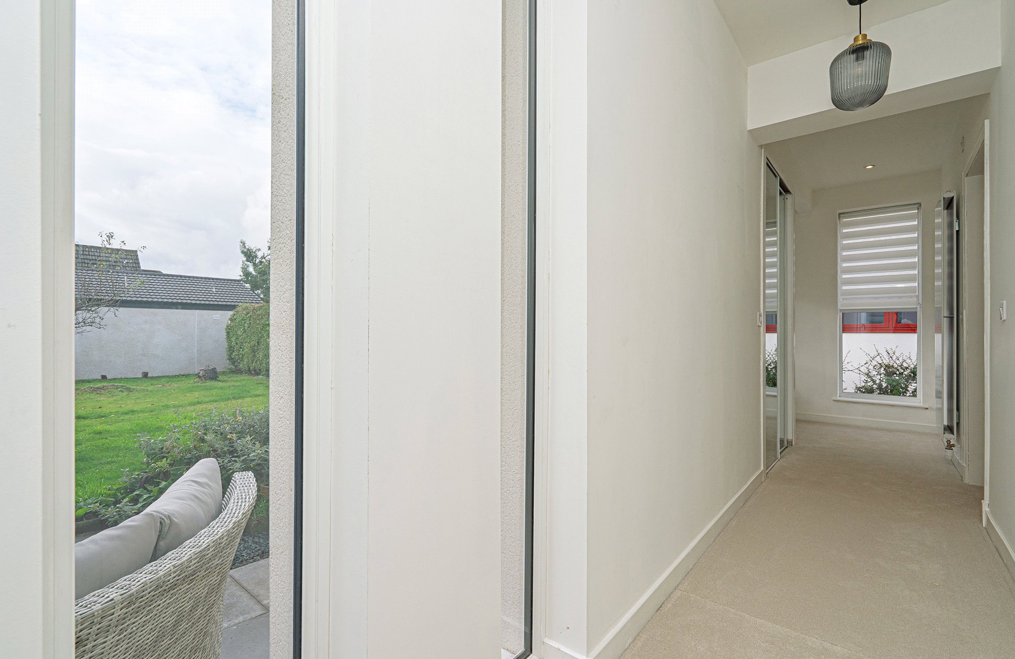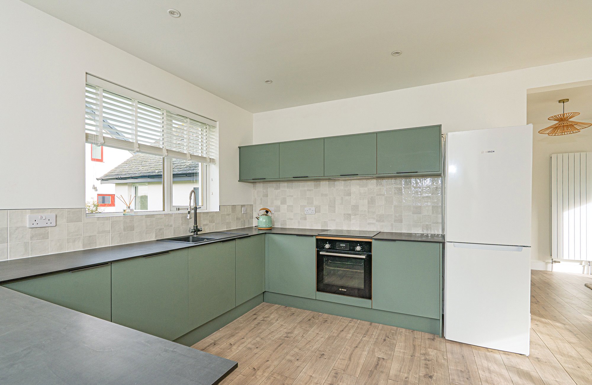 The home features an impressive open-plan living, dining and kitchen area; a bright and welcoming space enhanced by large windows and patio doors that open directly to the garden. A feature wood-panelled wall with an inbuilt electric fire provides a striking focal point, creating a warm and inviting atmosphere. The modern kitchen is well equipped with quality integrated appliances, including an induction hob, extractor, oven, integrated dishwasher, and fridge/freezer. A useful utility room offers additional storage and convenient access to the rear garden. The sale also includes all existing floor coverings and window blinds.