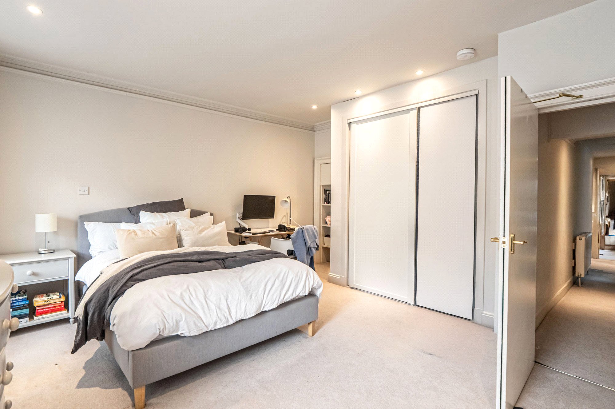 There are three well-proportioned double bedrooms, one of which benefits from fitted wardrobes, and all offering flexibility for use as additional study or home-working space if desired. The contemporary bathroom includes a shower over the bath and is finished to a modern standard. A large hall cupboard provides excellent storage, while light and neutral décor throughout enhances the feeling of space.