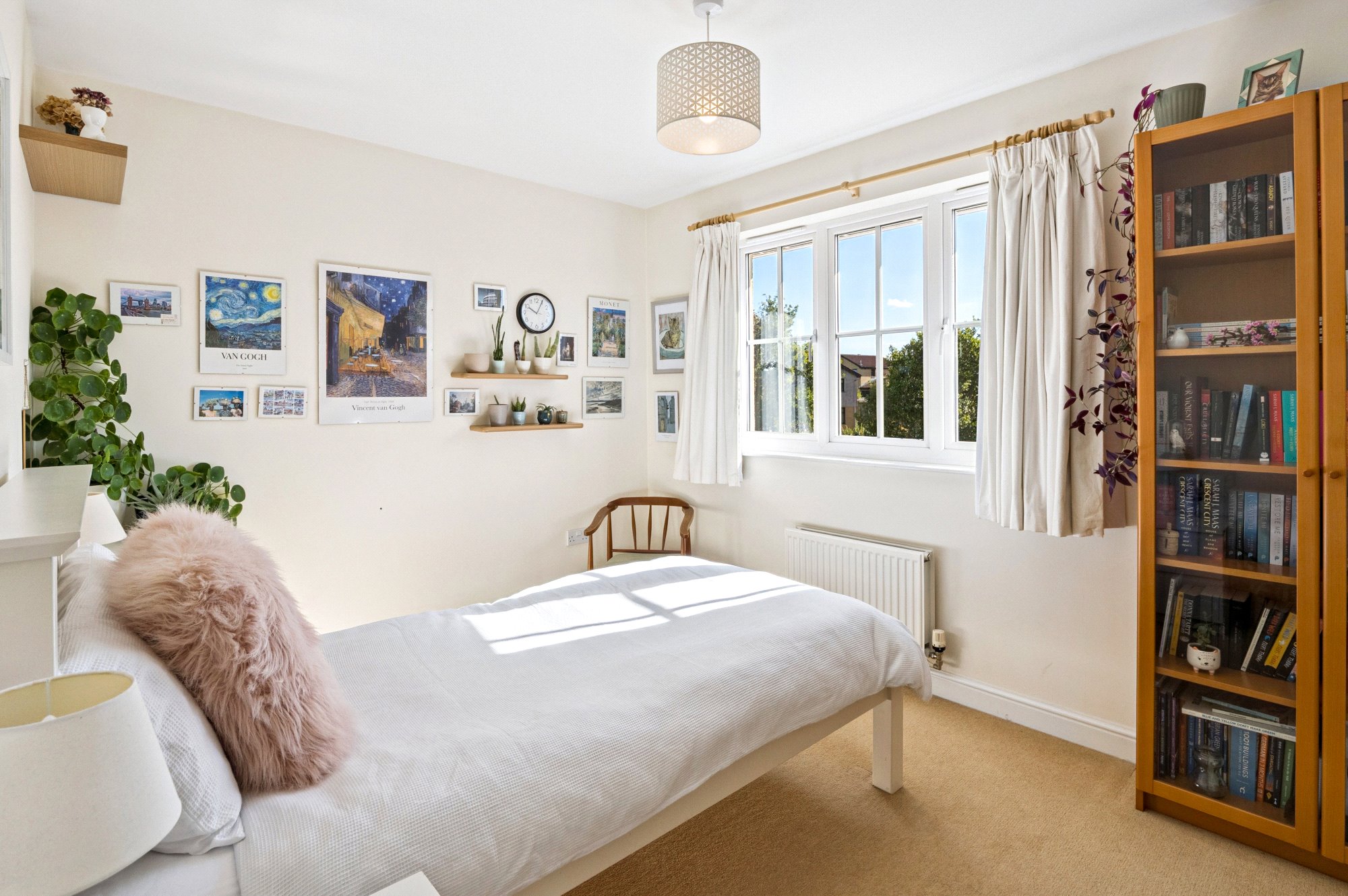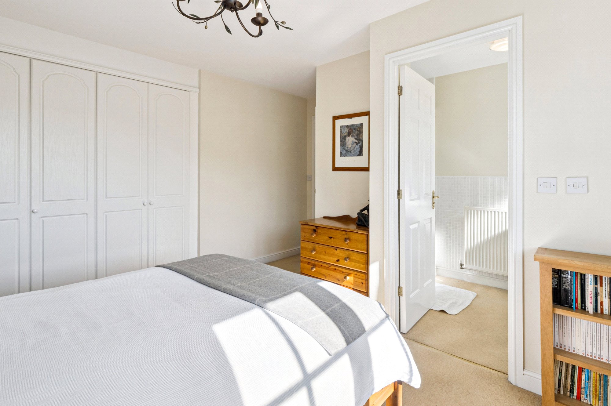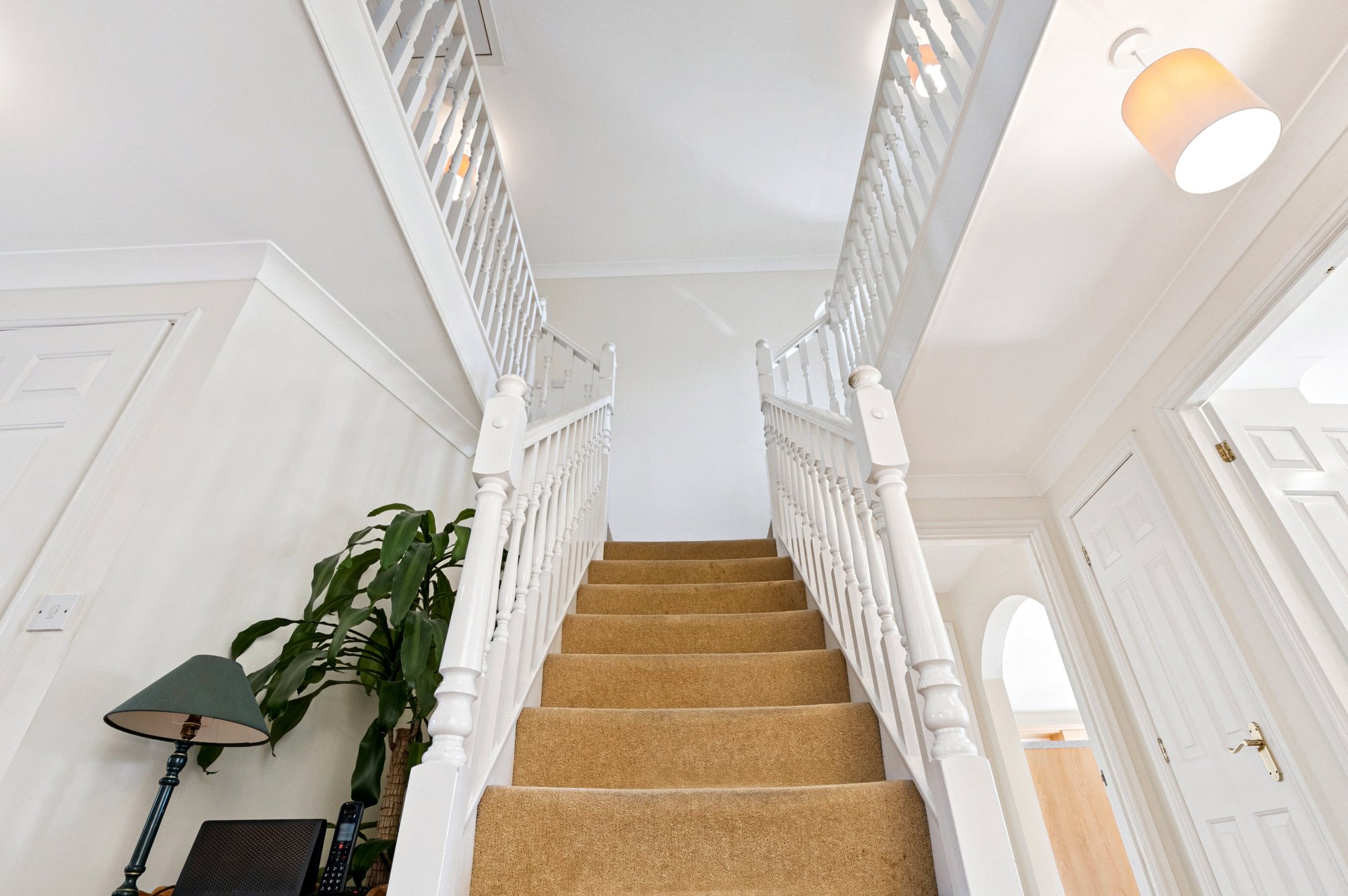 Upstairs, the accommodation is arranged around a spacious central landing. Bedroom one is a luxurious retreat with triple windows, fitted wardrobes, and a modern en-suite shower room. A second double bedroom also boasts its own en-suite, while three further bedrooms provide ample space for family or guests. A stylish family bathroom with separate shower serves the remaining rooms. A study completes the upper level, offering the flexibility of a home office or quiet reading space. A floored attic, accessible by a hatch from the landing, provides additional storage.