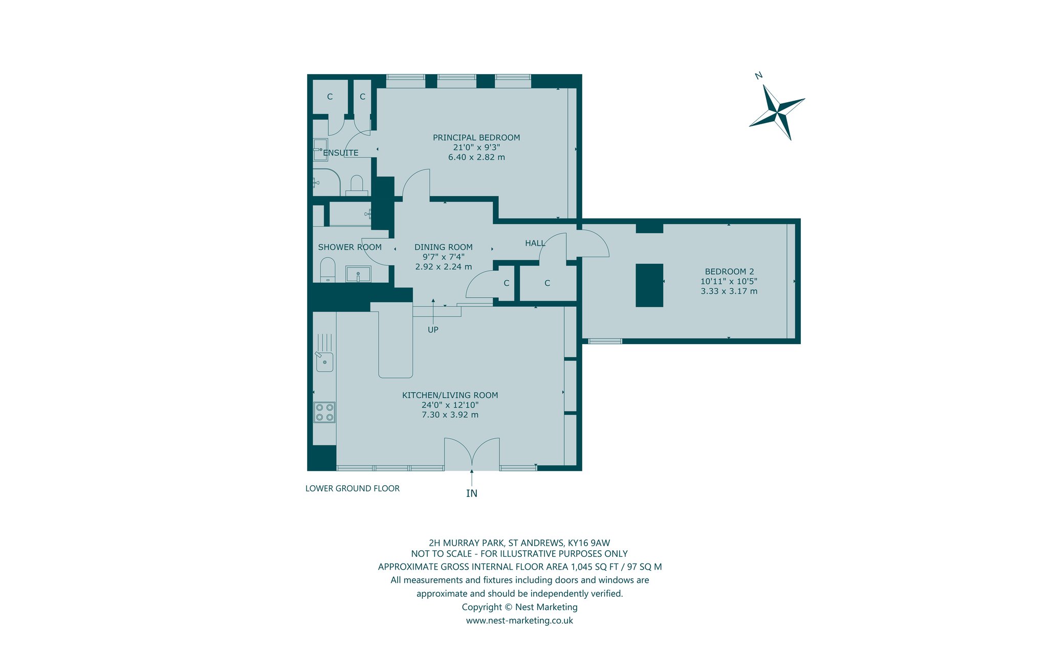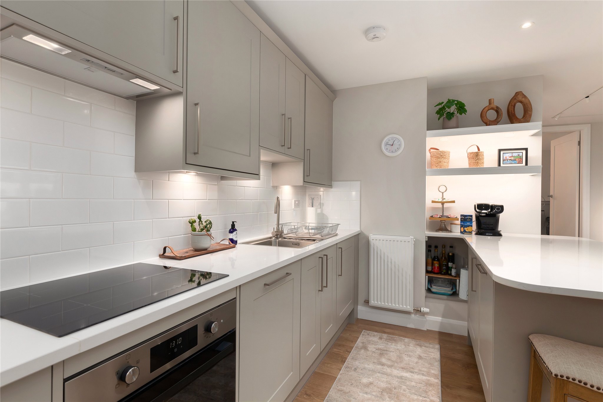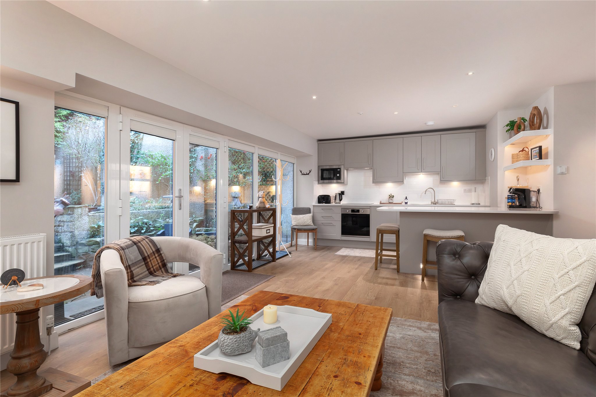 This luxurious two-bedroom lower-ground property, set within the prestigious St Andrews Conservation Area, is distinguished by its elegant interior design and high-spec luxurious finishes. Entered through a private enclosed garden, you arrive into a spectacular south- west-facing living room and kitchen. Flooded with natural light from expansive glazing overlooking the garden, it showcases a refined interior design that includes handsome high-grade waterproof engineered laminate product (Eligna) flooring, a chic grey palette, and soft ambient lighting. A bespoke handcrafted illuminated media wall with shelving set within the living area creates an aesthetically appealing and practical focal point, whilst the layout allows for a comfortable furniture arrangement. Positioned at the opposite end, a sleek contemporary kitchen designed in a one-wall configuration maximises the space, whilst a peninsula counter offers a natural divide between the two areas and serves as an informal place to dine. Grey wall and floor units are complemented by white illuminated worktops, a tiled splashback, and high-spec integrated appliances that include a microwave, oven, hob, and extractor hood. Two carpeted steps then take you to the elevated dining area, offering the perfect setting for entertaining or quiet meals at home. Featuring a sophisticated interior design, plush carpeting, built-in mirrored wardrobes, and an indulgent en-suite shower room with a WC, washbasin built into vanity, and chrome towel radiator, the principal double bedroom is a wonderful retreat. A second sizeable double bedroom continues the impressive interior design that runs throughout this property and a second shower room mirrors that of the en-suite.