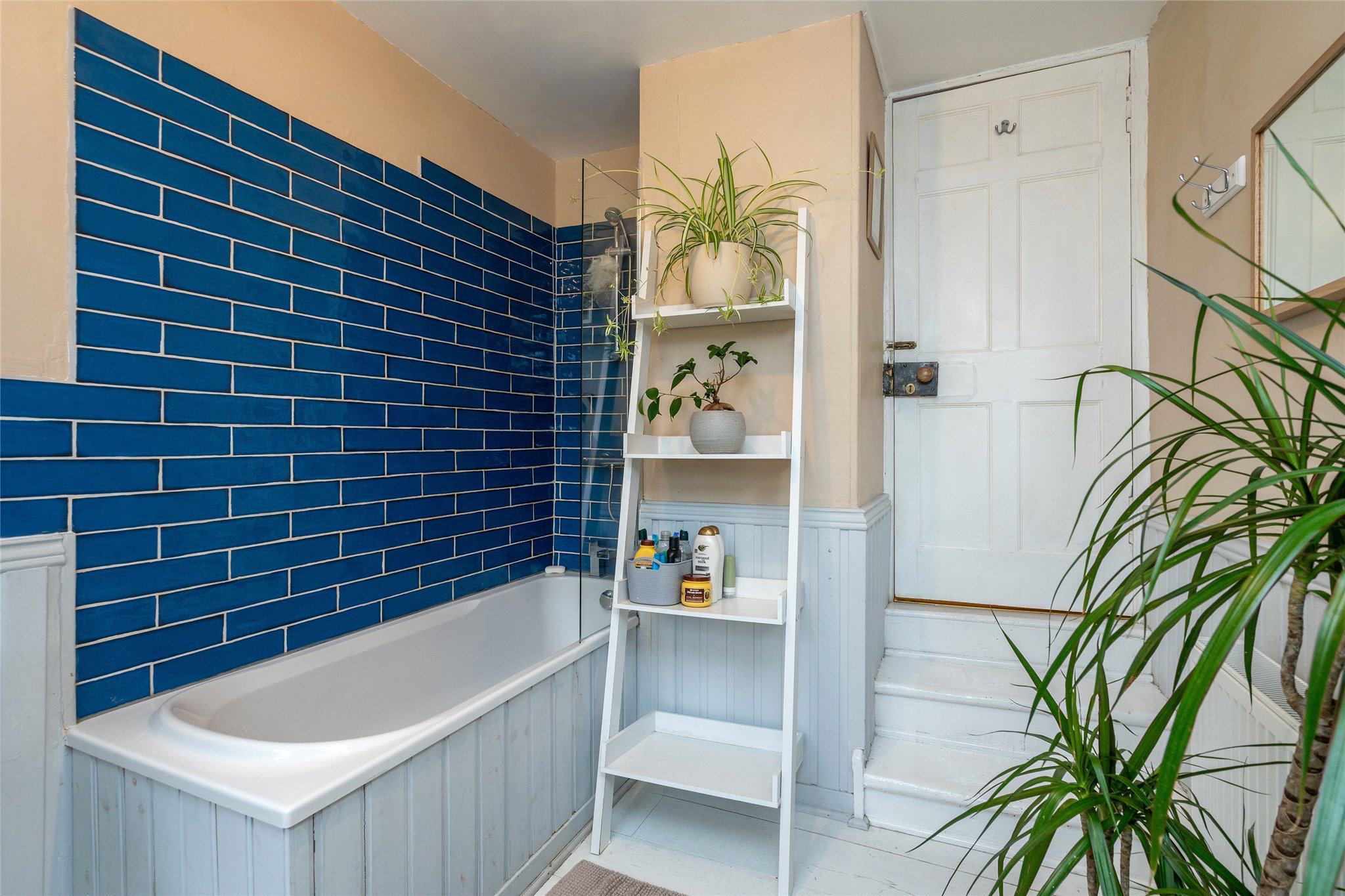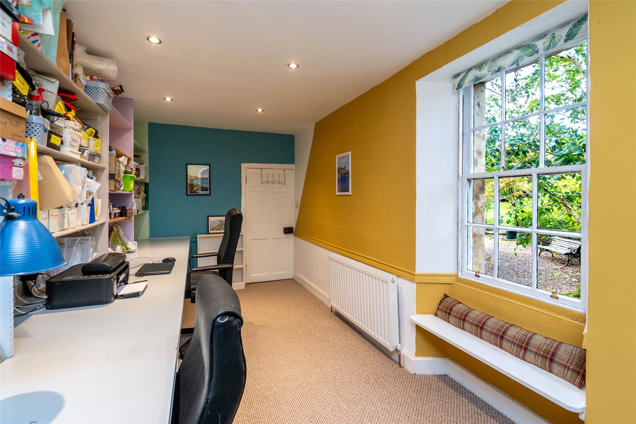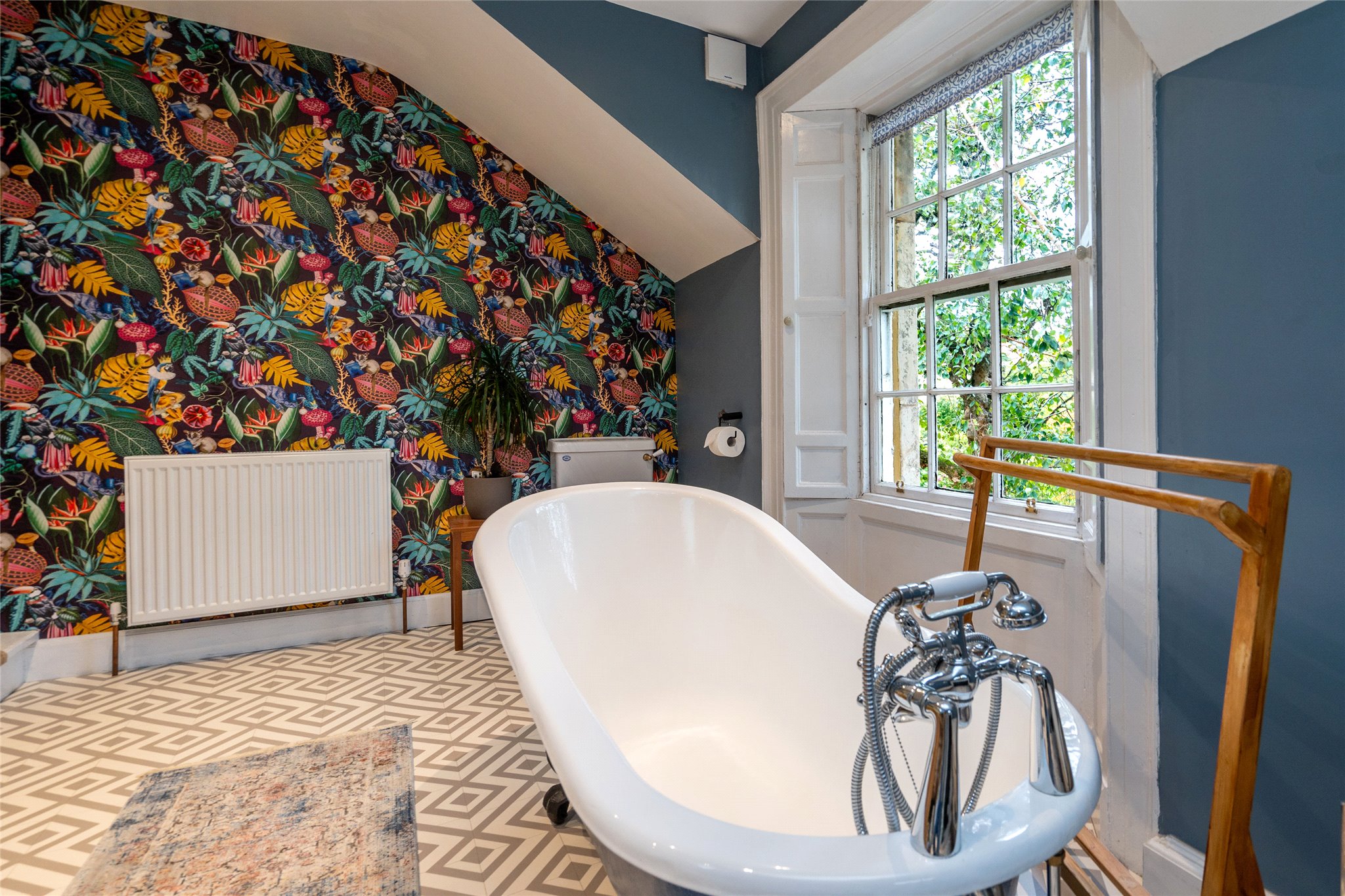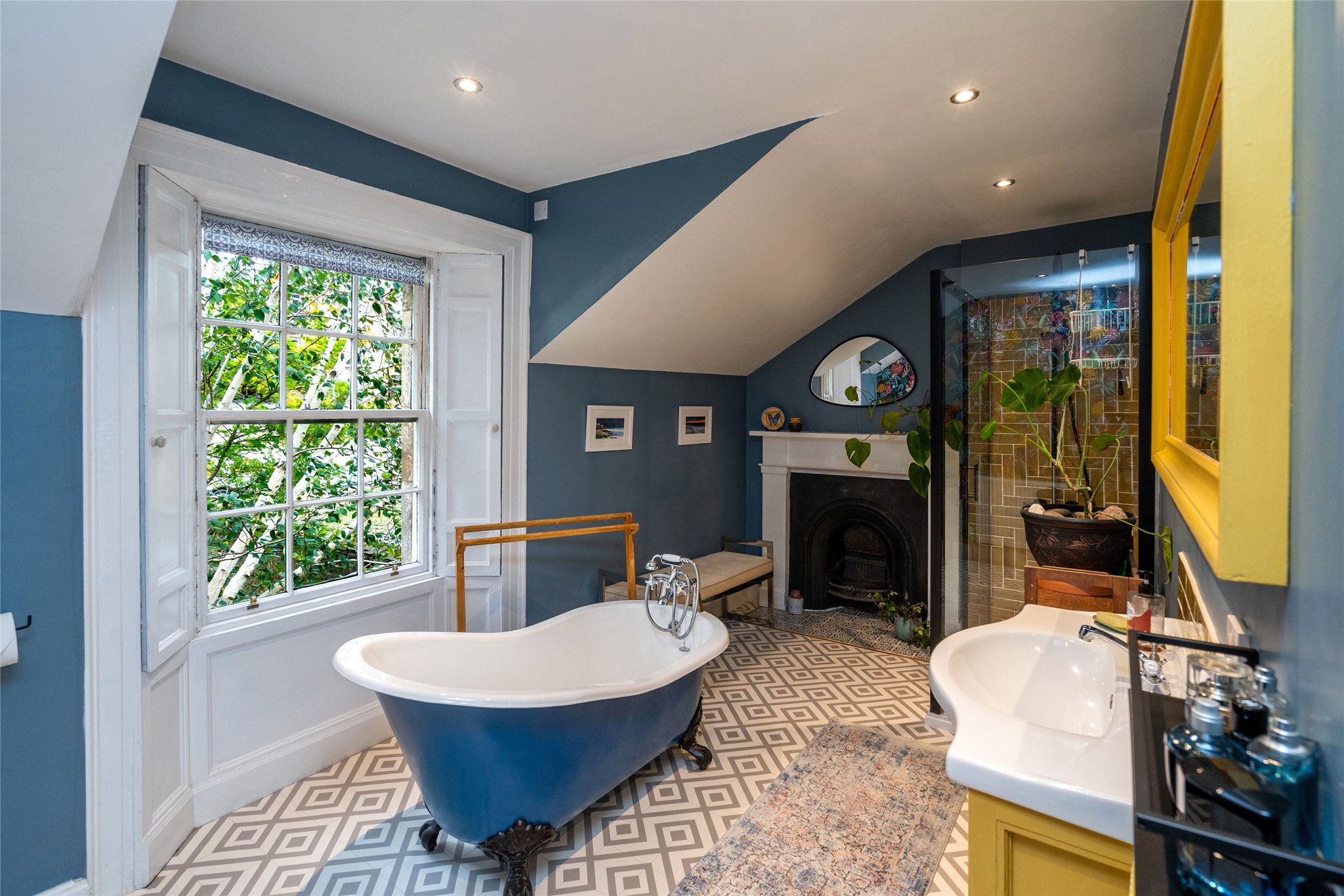 A gated driveway with its original 300-year-old gate welcomes you to the private walled garden. Here, an entrance vestibule adorned with a beautiful tiled floor opens into the ground floor hallway from which runs off a sizeable utility and larder. Stairs then ascend to the first-floor entrance vestibule, showcasing a striking stained-glass feature. From here, you are ushered up into an elegant lounge, where twin south-facing sash and case windows bathe the room in light. Generously proportioned, the space combines refined interior design with period charm, featuring original wooden flooring, tasteful wall finishes, intricate cornicing, a decorative ceiling rose, and a striking cast-iron fireplace that reflects the home’s historic character. Across the hallway, the kitchen impresses with its modern, tasteful aesthetic and has been upgraded to a high standard. Appliances include a recently purchased induction range cooker with a fan oven with an extractor hood, and the kitchen has high storage capacity. The dining room, also south-facing, offers a refined setting for formal entertaining or family meals. It retains beautiful period details, including a ceiling rose, wooden flooring, and a cast-iron fireplace set within an ornate tiled mantelpiece. A charming library and a quiet study provide ideal spaces to relax, read, or work from home in peace, whilst a well-appointed double bedroom and a sleek contemporary shower room complete the first floor. The second floor hosts a truly spectacular principal suite. Elegantly decorated and south-facing, it features an original fireplace and a dressing room. The luxurious en-suite bathroom is a standout feature, complete with its own open fireplace, a freestanding roll-top slipper bath, separate shower enclosure, washbasin built into vanity, and WC. Also on this floor are three additional well-appointed double bedrooms, each thoughtfully designed to provide comfort and style. All retain original fireplaces, adding character and warmth to the spaces. Perfect for family members or visiting friends and relatives, these generous bedrooms continue the home’s seamless blend of period charm and modern comfort. They share access to a light and airy family bathroom with WC, washbasin, and bath with a modern shower unit. The attic is floored, offering a variety of possibilities and providing access to a carpeted games room, ideal for young adults to enjoy.