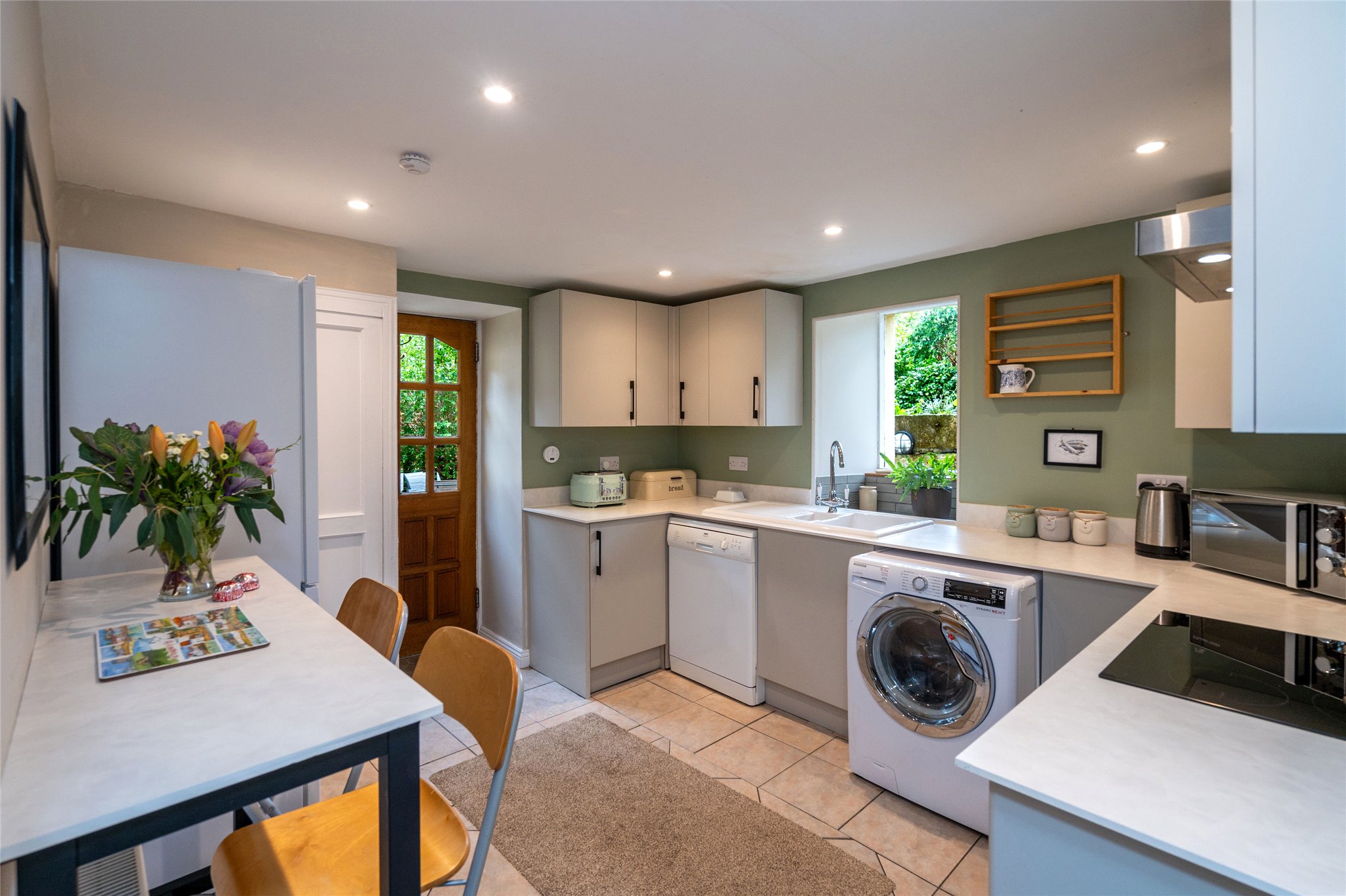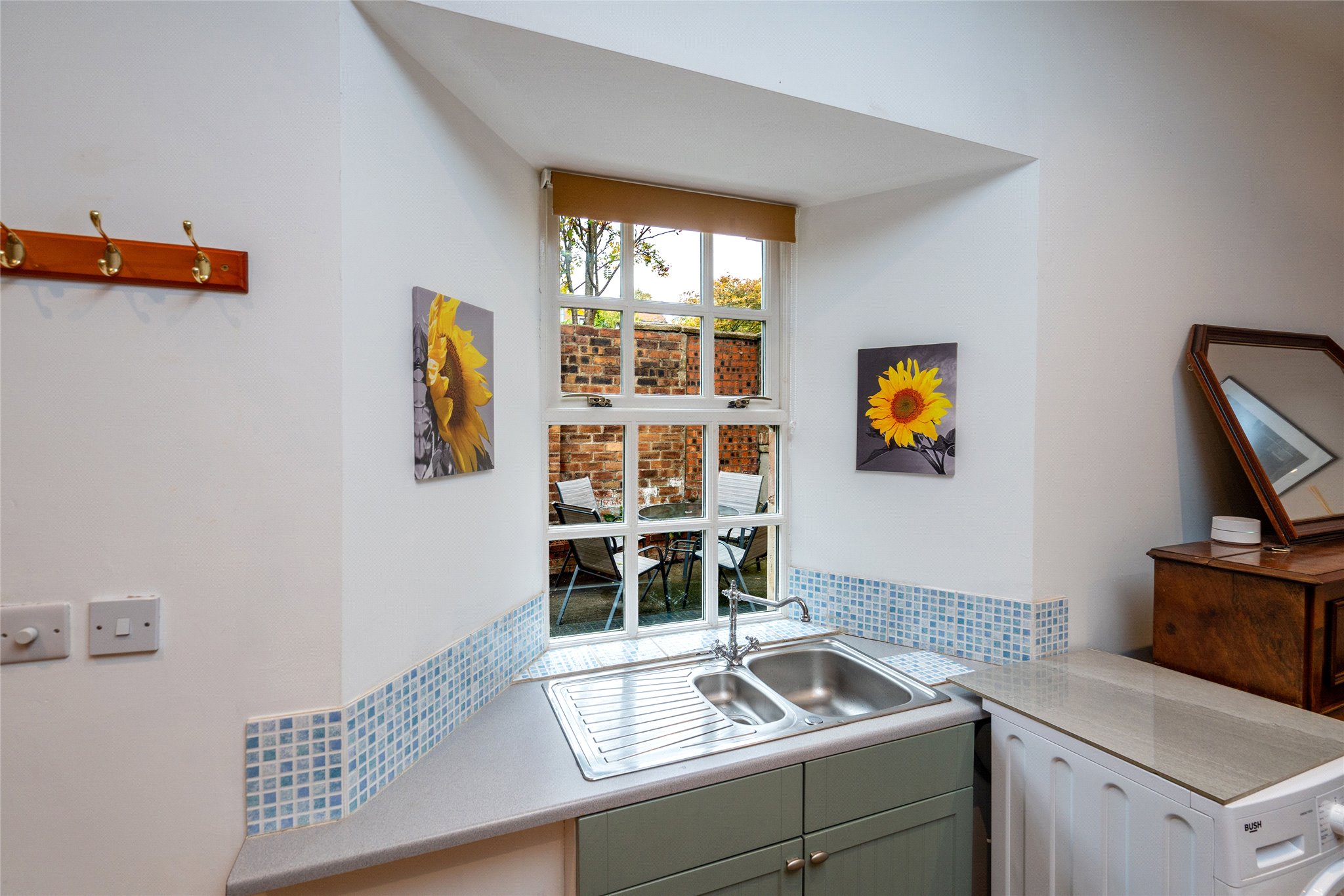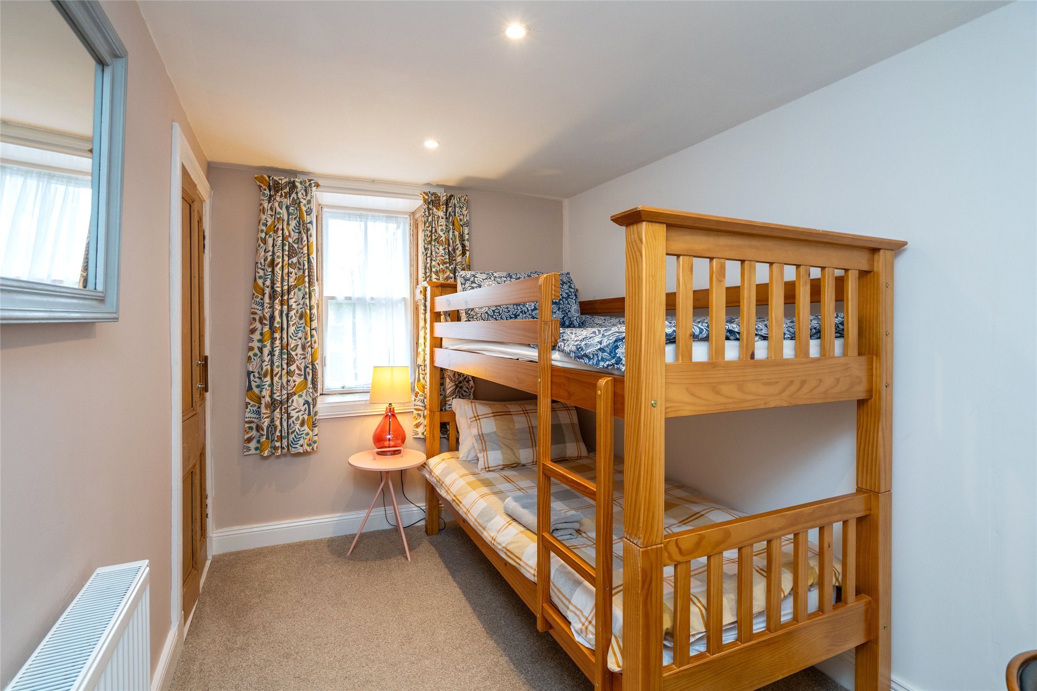 The recently upgraded breakfasting kitchen, which benefits from direct courtyard access, features stylish soft-grey cabinetry with matte black fittings, white worktops, and a classic tiled splashback. High-spec appliances include a fan oven, induction hob, and extractor hood. Each of the three south-facing bedrooms is tastefully decorated to provide a restful and inviting retreat. The king and double rooms are of a very comfortable size. They share a beautifully appointed bathroom complete with a luxurious freestanding bath, separate shower enclosure, WC, and washbasin.