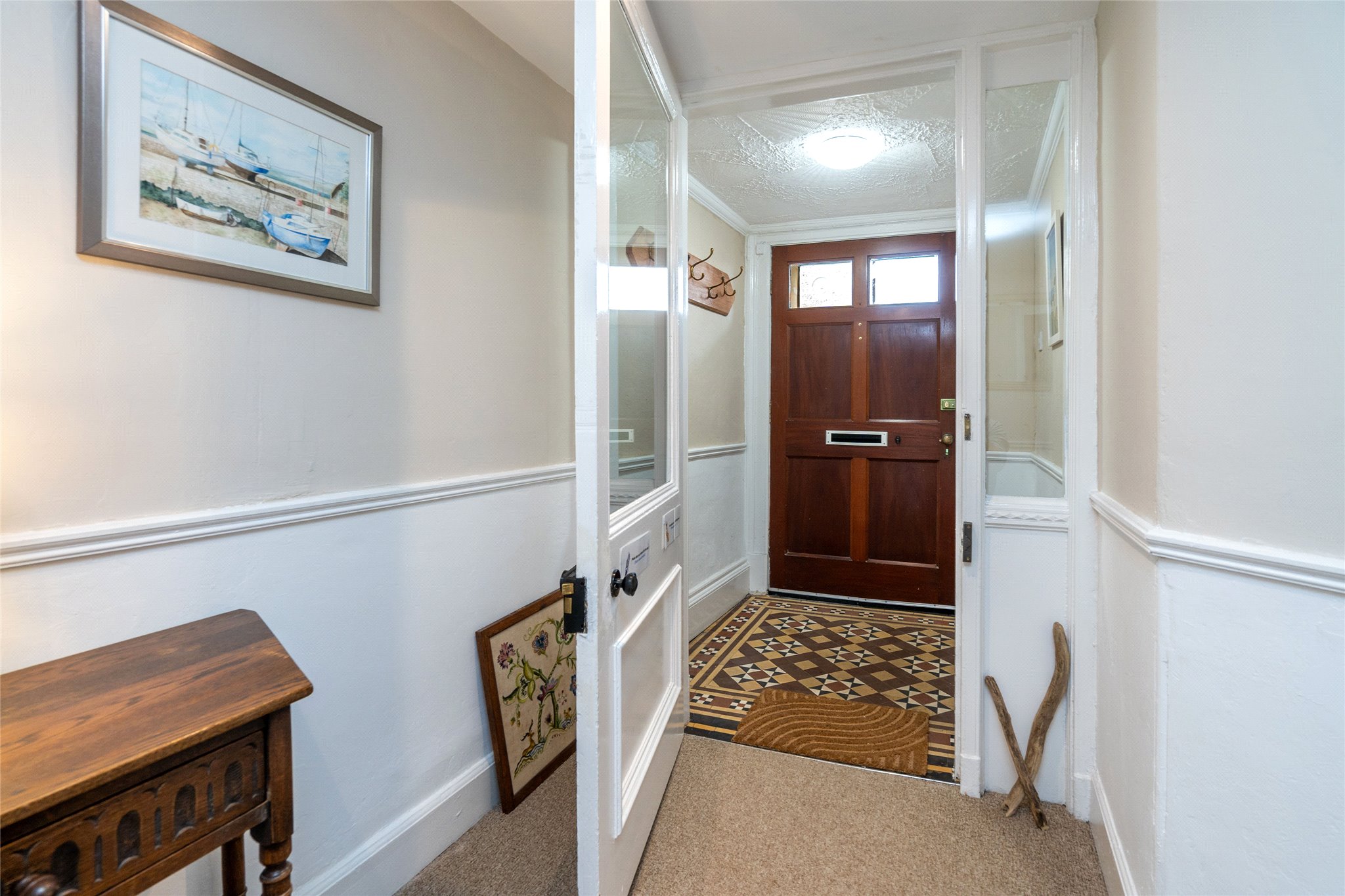 The entrance opens into a welcoming vestibule showcasing an original tiled floor and leading to an elegantly appointed hallway with soft coastal tones and new plush carpeting. A bright and generously proportioned south-facing sitting room lies to the right, bathed in natural light from twin sash recessed windows framed by working shutters and comfy window seats. With exposed beams, an open cast iron fireplace set in a rich mahogany surround, carpeting, and a calming colour palette, the room provides a cosy yet refined space ideal for relaxation and informal dining. The property is warm and cosy due to recently upgraded insulation.