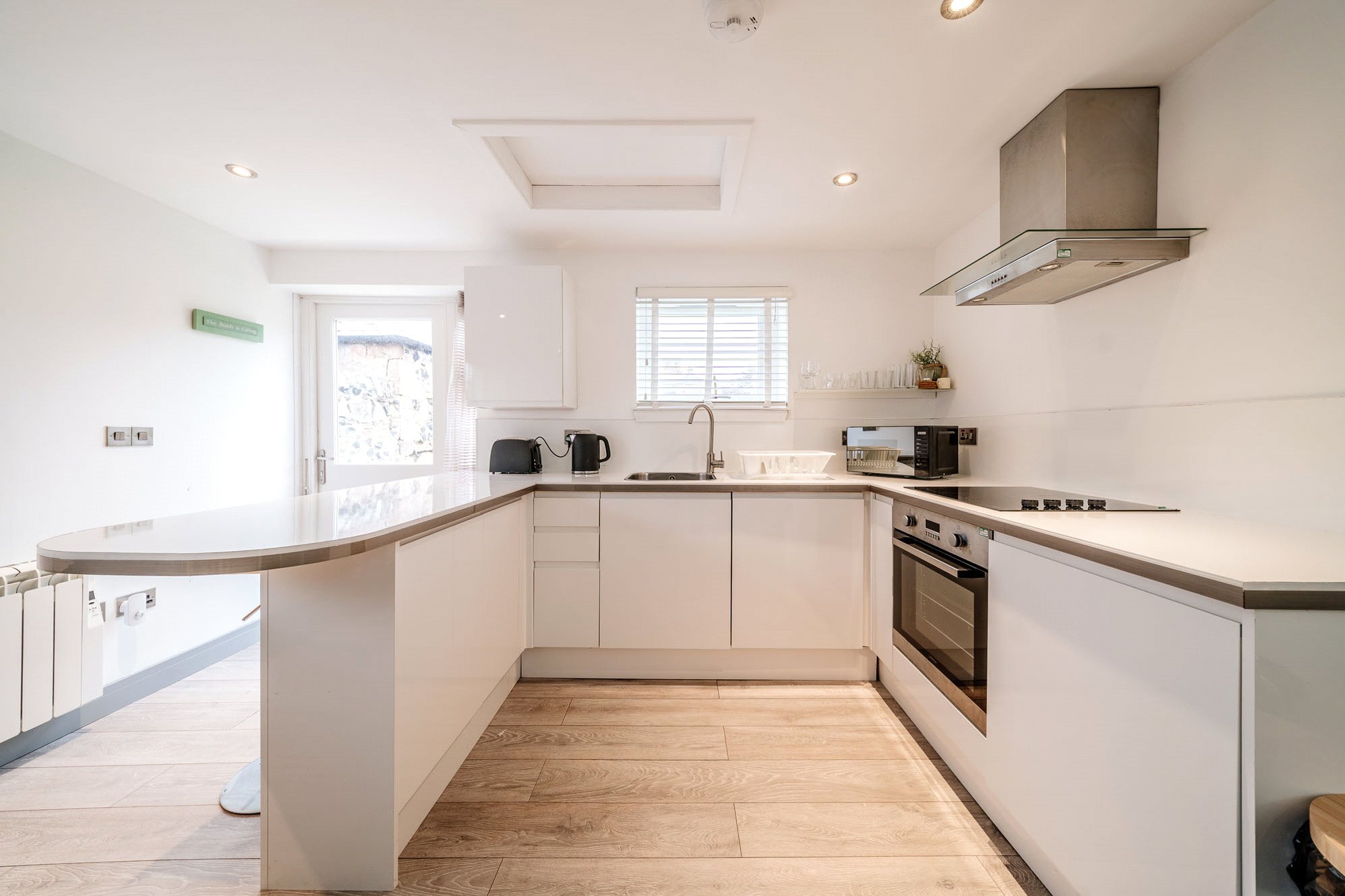 Once a former public building, the property has been completely transformed and now provides bright, open-plan living ideal for modern lifestyles or as a delightful seaside getaway. The main living space incorporates a sitting and dining area with hardwood flooring and neutral décor, creating a fresh, inviting atmosphere. The adjoining modern kitchen features sleek fitted units, an electric hob and oven, and generous storage space, with a glazed door providing direct access to the outside.
