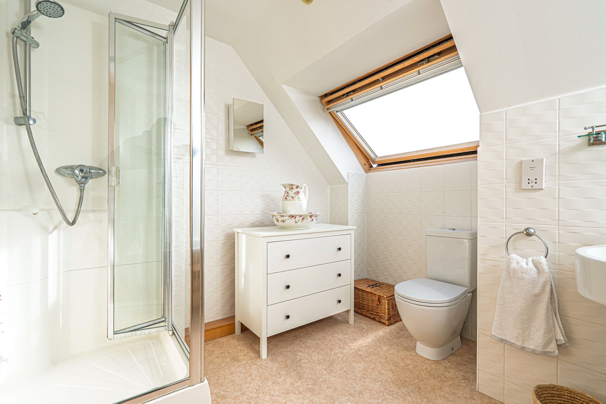 Upstairs, a bright landing with Velux window leads to three well-proportioned double bedrooms, two of which benefit from built-in storage. A large family bathroom with separate shower adds to the practicality of the layout.