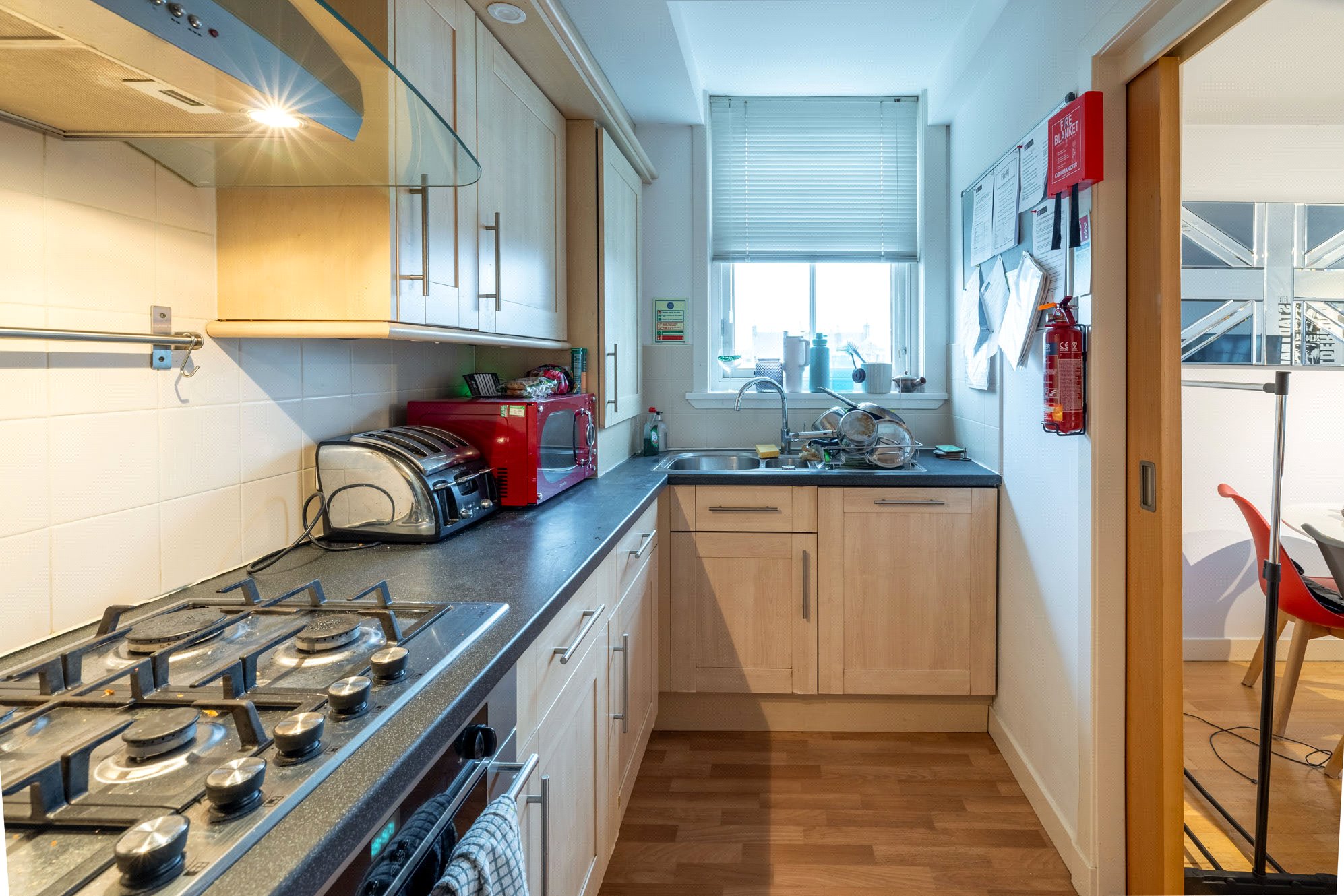 The open plan kitchen and generous dining sitting room, with dual outlook over the historic West Port and City Road, is the stunning centrepiece. The fitted kitchen is well equipped with integrated appliances including a five-burner gas hob, electric oven, fridge-freezer and dishwasher.