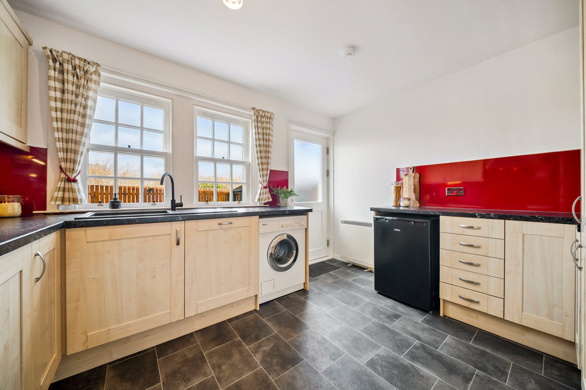 The entrance door opens into a vestibule and hallway. There is a modern fitted kitchen and W.C. on the ground floor, both of which were completed to a high standard 3 years ago. The entrance hallway leads into a spacious open-plan sitting and dining room which extends the full depth of the house, enjoying excellent natural light from dual-aspect windows and providing clearly defined areas for relaxation and dining, also with feature wall mounted electric fire. Dual aspect windows flood the room with natural light. The modern fitted kitchen offers a substantial amount of floor and wall units with under unit lighting, and includes an integrated oven, new induction hob, extractor fan, dishwasher, washing machine, fridge freezer and additional freezer unit.