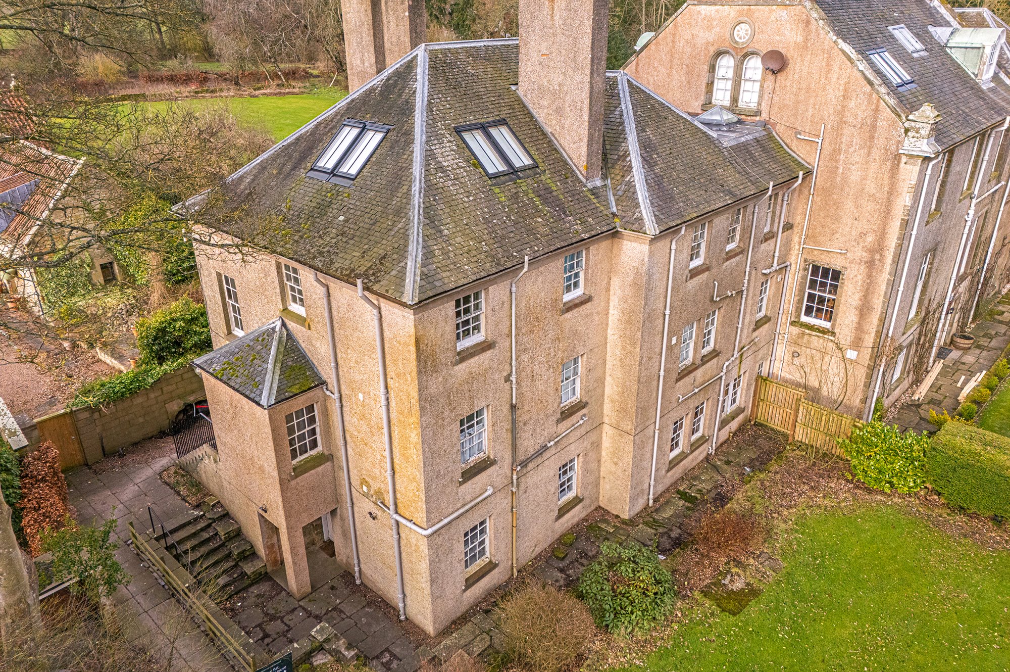Occupying the lower ground floor of the southeast wing, the garden flat is accessed via an external flight of steps leading to the front door. The accommodation includes a spacious lounge with a gas fire and French door opening to a patio, a dining kitchen, three bedrooms and a well-appointed bathroom. A useful external store cupboard sits directly opposite the entrance within the communal hall. Shared garden grounds, used by only two other properties, provide a pleasant lawned area bordered by hedging and the driveway.