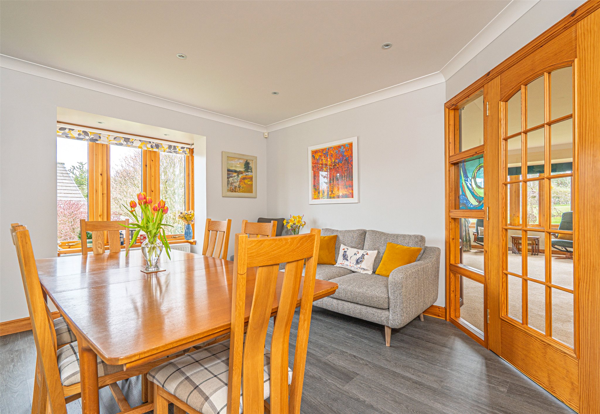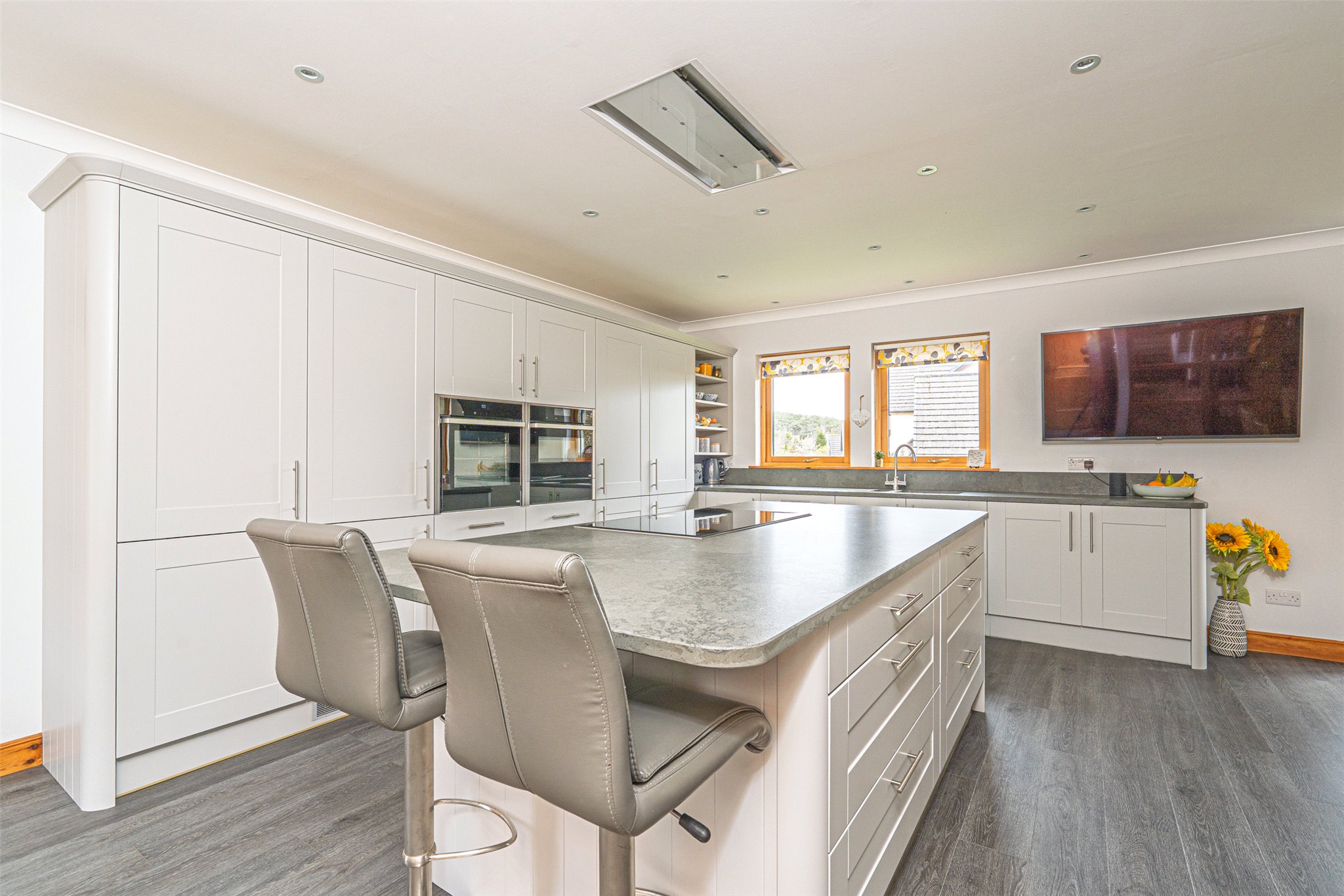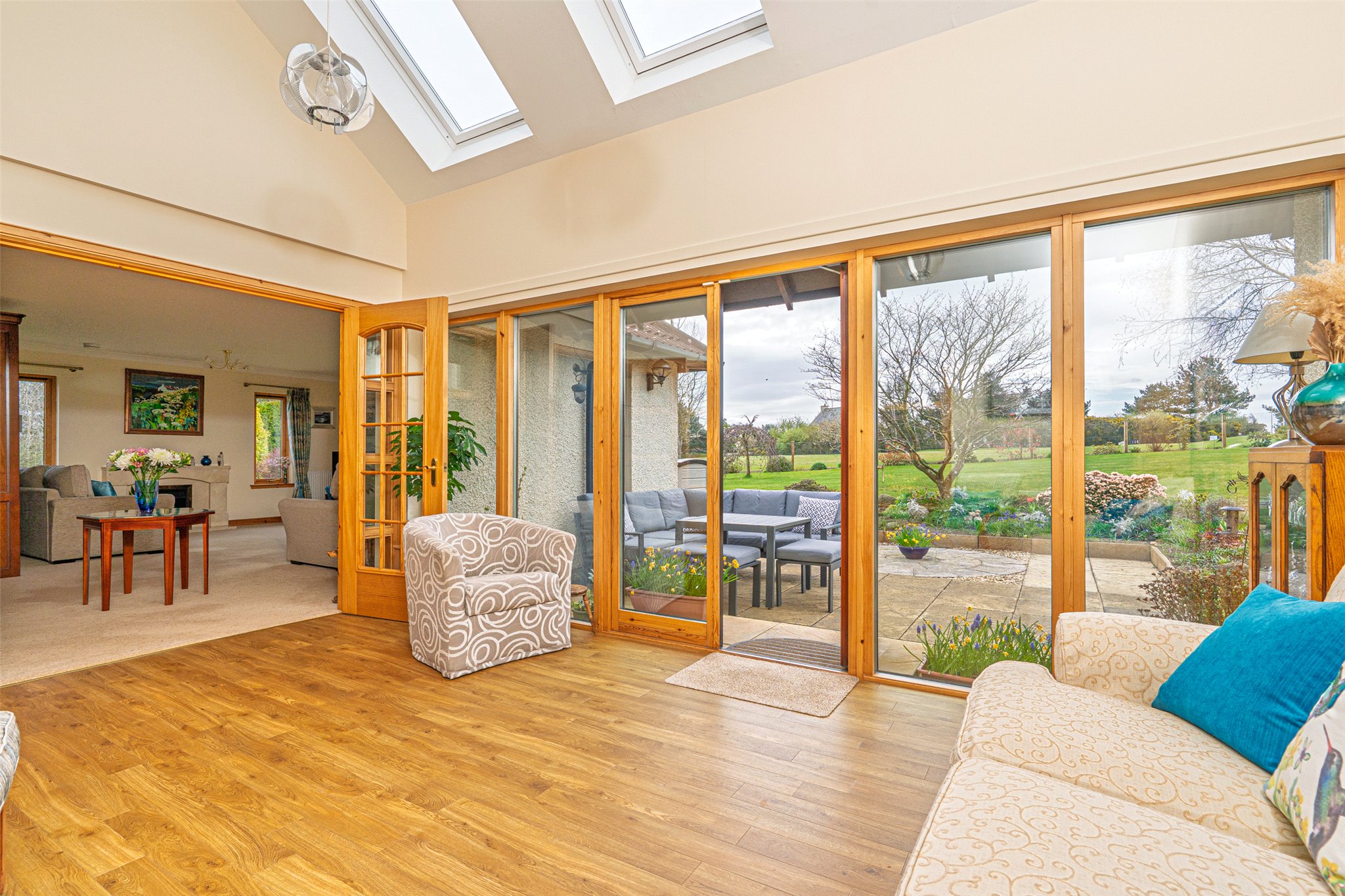 Internally, the property is presented in excellent order throughout. A welcoming entrance porch opens into a bright and spacious reception hall, leading to a large bay-windowed lounge with feature fireplace. French doors connect the lounge to both the sun room, flooded with natural light via Velux windows and featuring its own set of French doors leading to the rear garden and the contemporary living/dining kitchen is an exceptionally versatile and generously proportioned space, designed to accommodate three distinct zones: a well-appointed kitchen area, a dedicated dining space, and a comfortable seated area. With generous storage and high-quality integrated appliances, it functions as a true everyday living room. A welcoming space where the family relaxes in the evenings to watch TV, and where guests naturally gather to sit and chat.