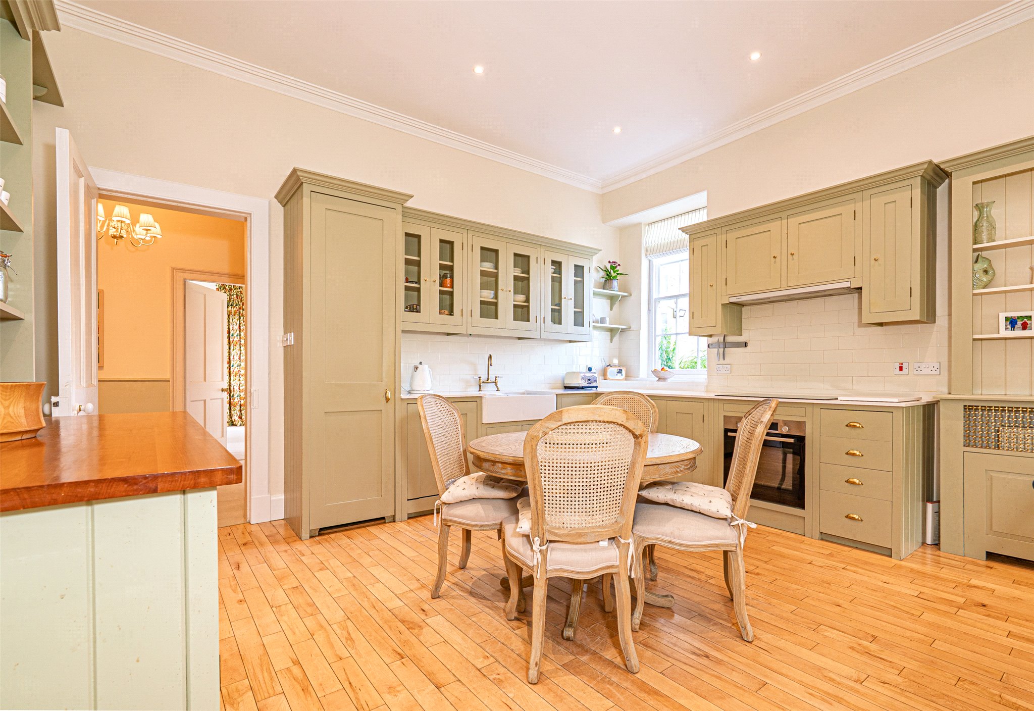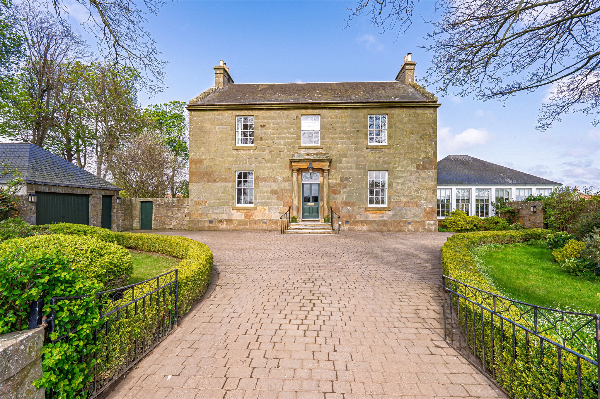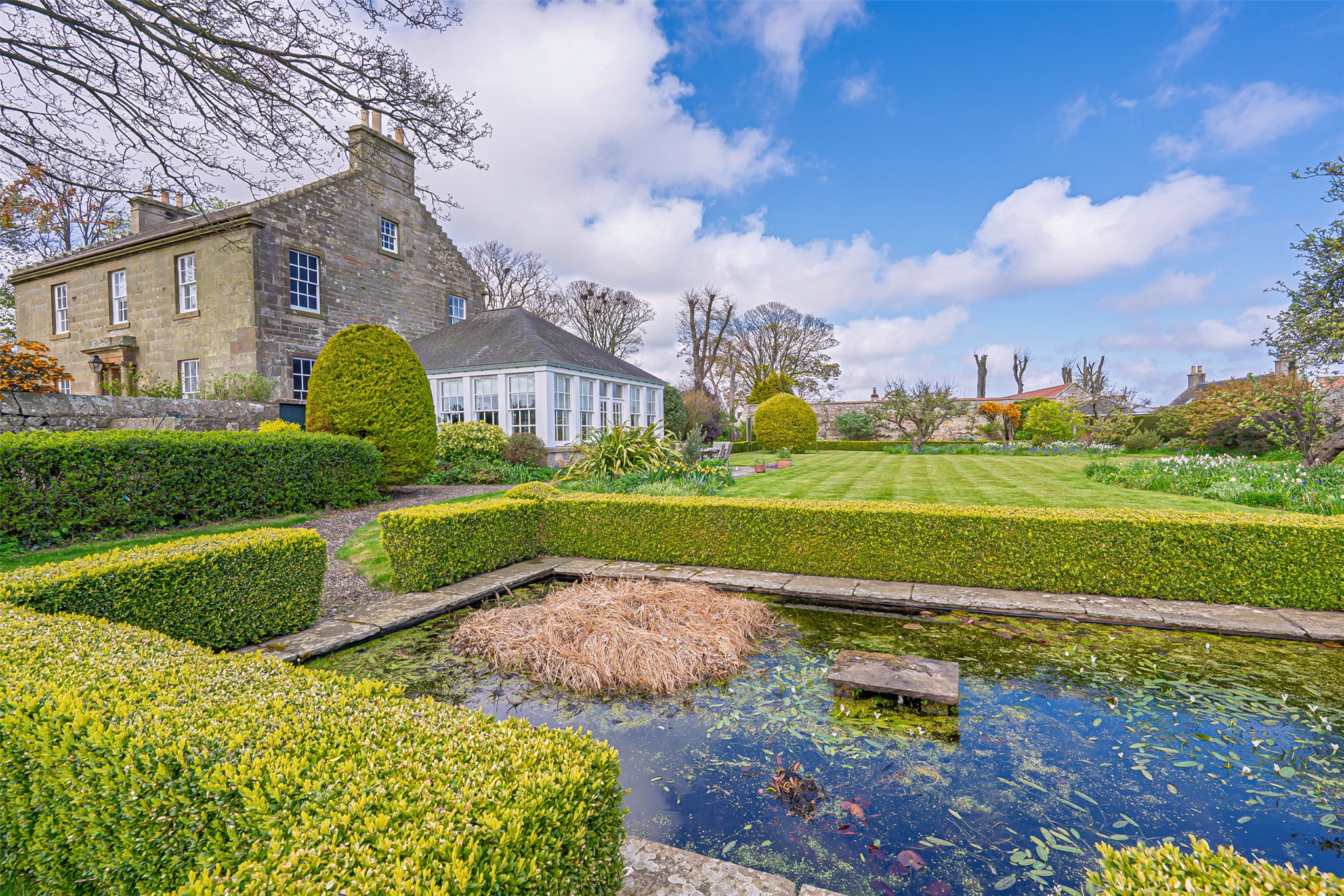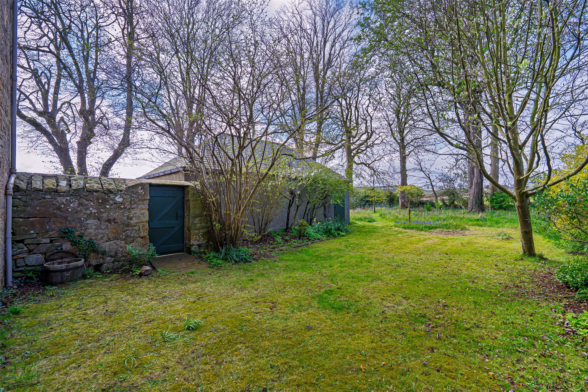 Externally, Kirk House is set within exceptional gardens and grounds that enjoy sun throughout the whole day and comprise three distinct areas. To the east lies the exquisite, sheltered walled garden, mainly laid to lawn and planted with a superb variety of mature trees, shrubs and specimen plants, along with an ornamental pond, gazebo, terrace and orchard. To the west is a delightful wild garden, dotted with bluebells and mature deciduous trees, creating a peaceful and natural setting. To the front, a neat, blocked driveway provides ample off-street parking and access to the garage and workshop, all framed by lawns, hedging and established planting.