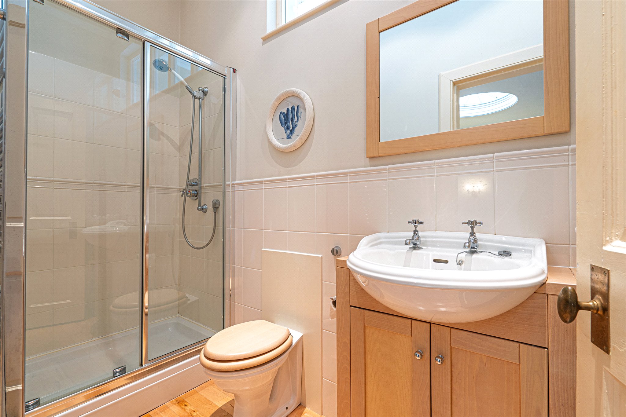 An elegant original staircase rises to the first floor where four well-proportioned bedrooms are arranged around a bright central hall. Bedroom one benefits from a charming en-suite bathroom, while the remaining bedrooms are served by a family shower room. A pull-down ladder provides access to a large attic, which includes a useful studio area, offering further flexibility for hobbies or creative use.