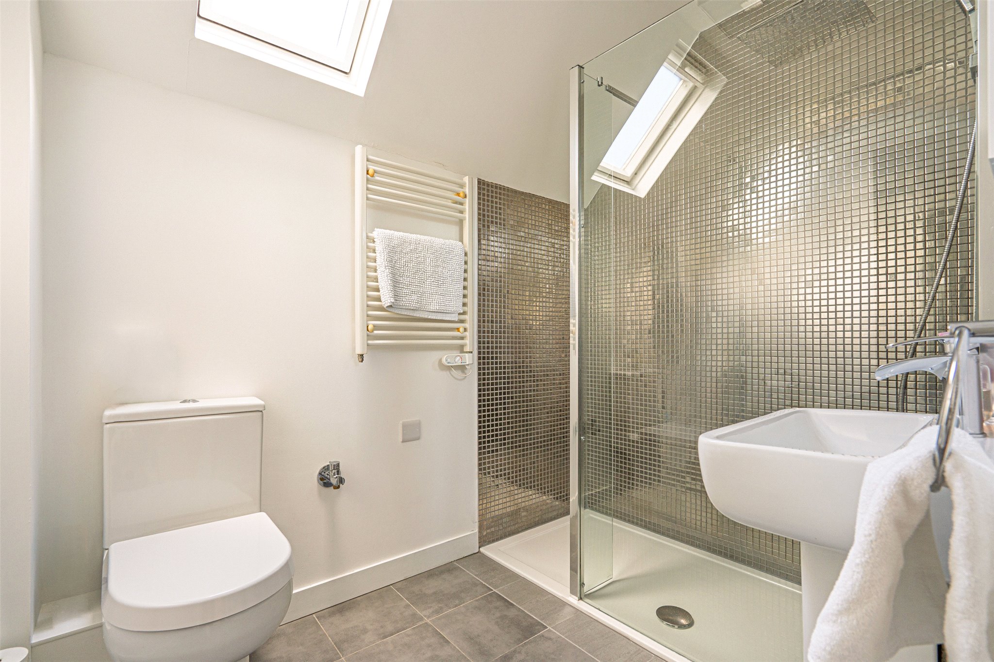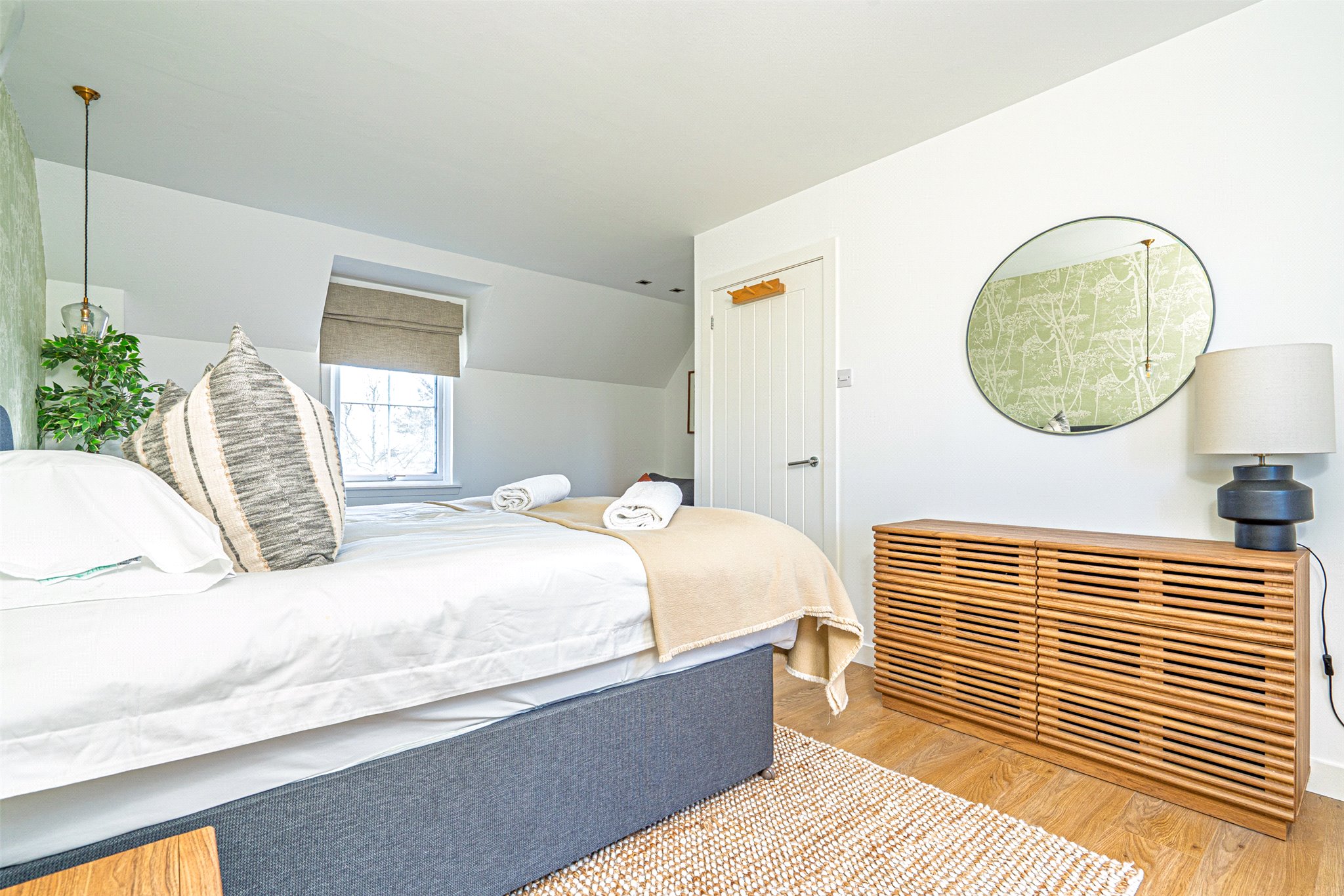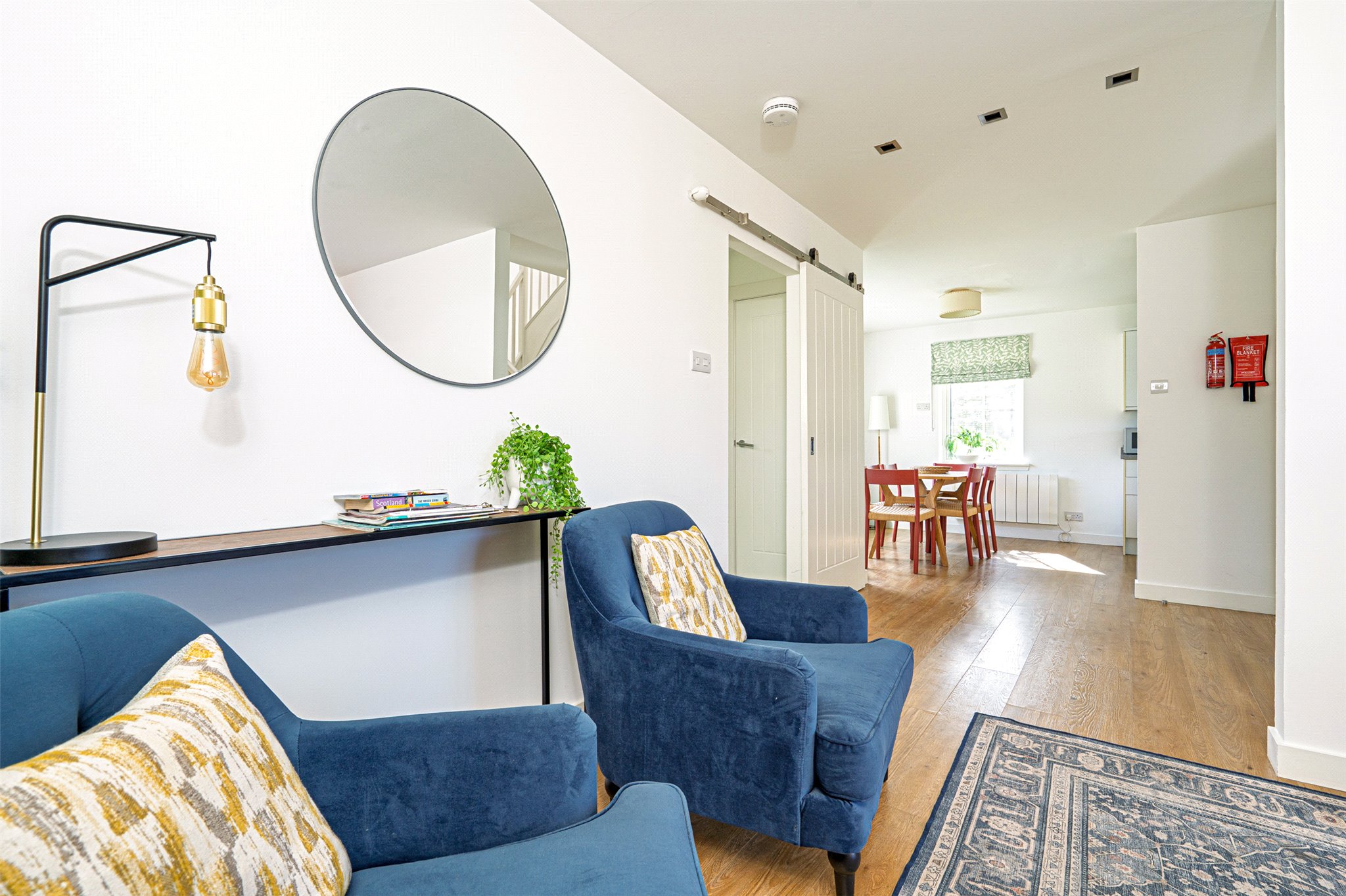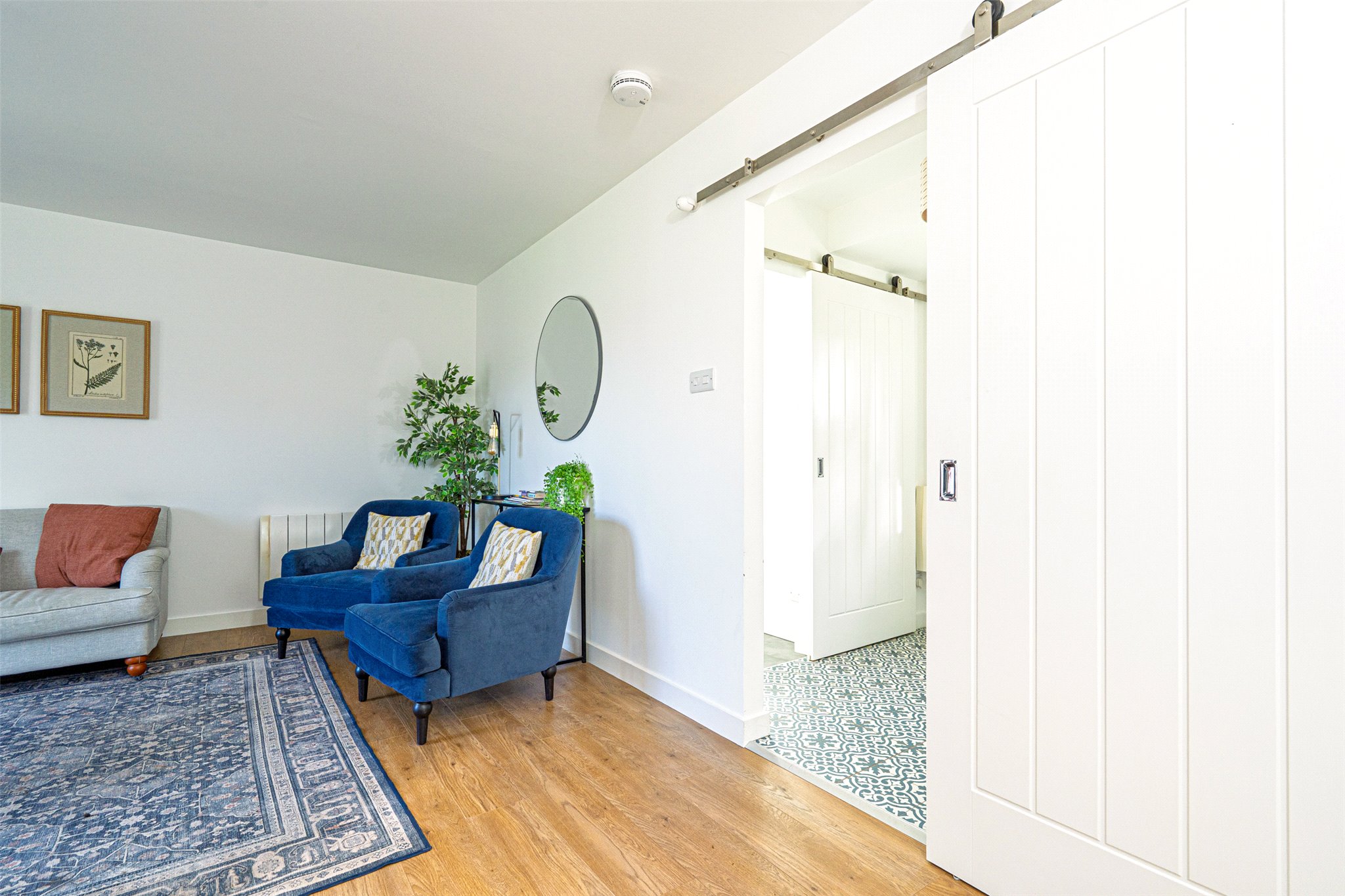 The property features distinctive farm-style sliding doors throughout, adding character and a subtle nod to the building’s rural surroundings. Upstairs, there are two well-proportioned double bedrooms, each tastefully presented, along with a modern shower room and separate WC. The layout makes excellent use of space while maintaining a comfortable, contemporary feel. The property was originally a three-bedroom home, with the smallest bedroom having been merged into what is now a larger principal suite. Should a buyer require, there is potential to convert the accommodation back to three bedrooms, subject to the appropriate planning consents.