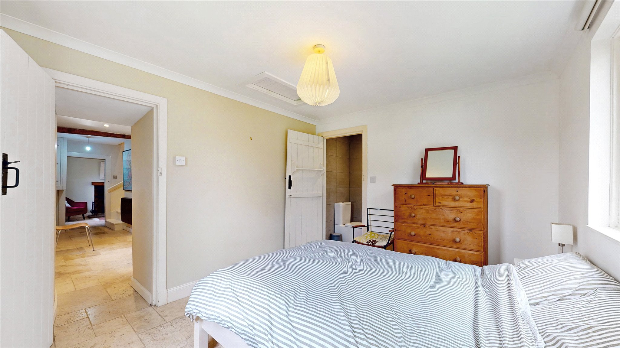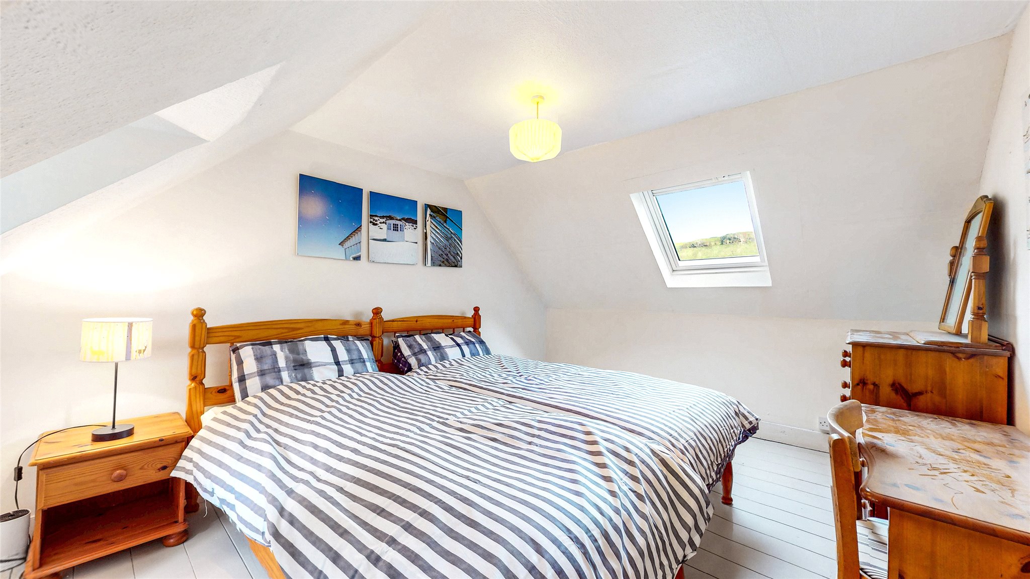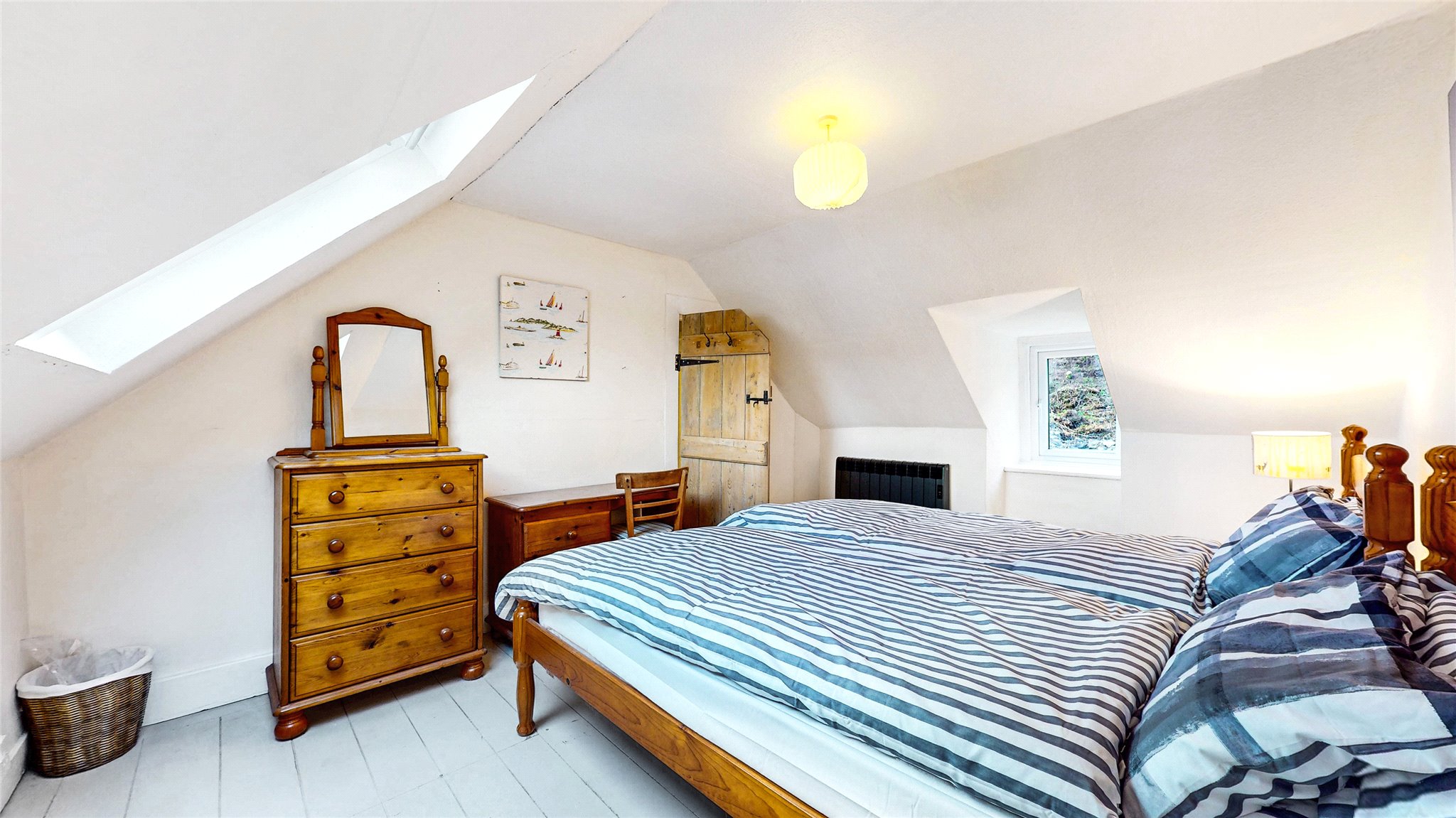 Upstairs, you'll find two further double bedrooms, each with vaulted ceilings and skylights that flood the rooms with natural light. A family bathroom with both bath and separate shower completes this level.