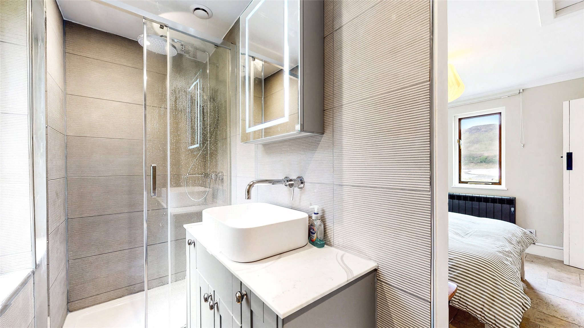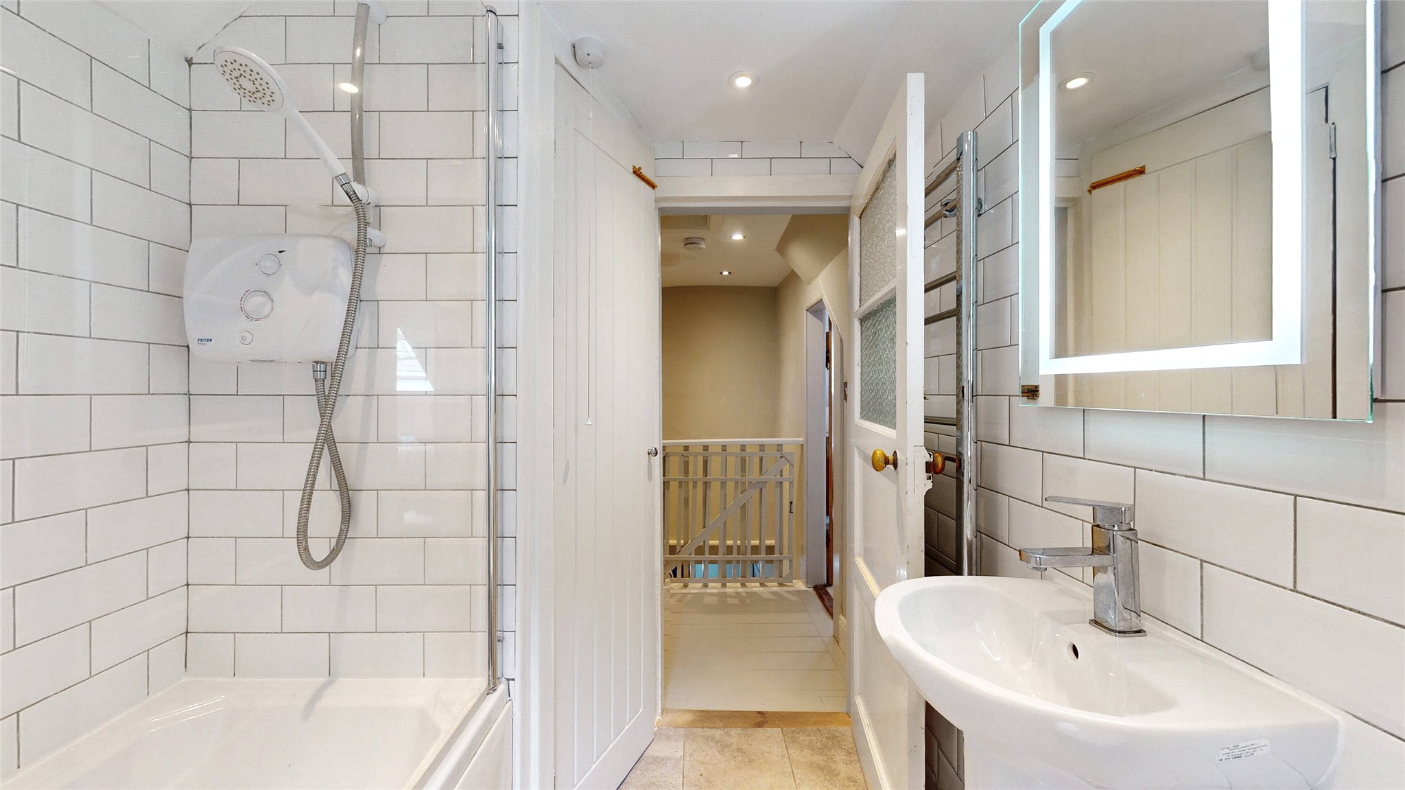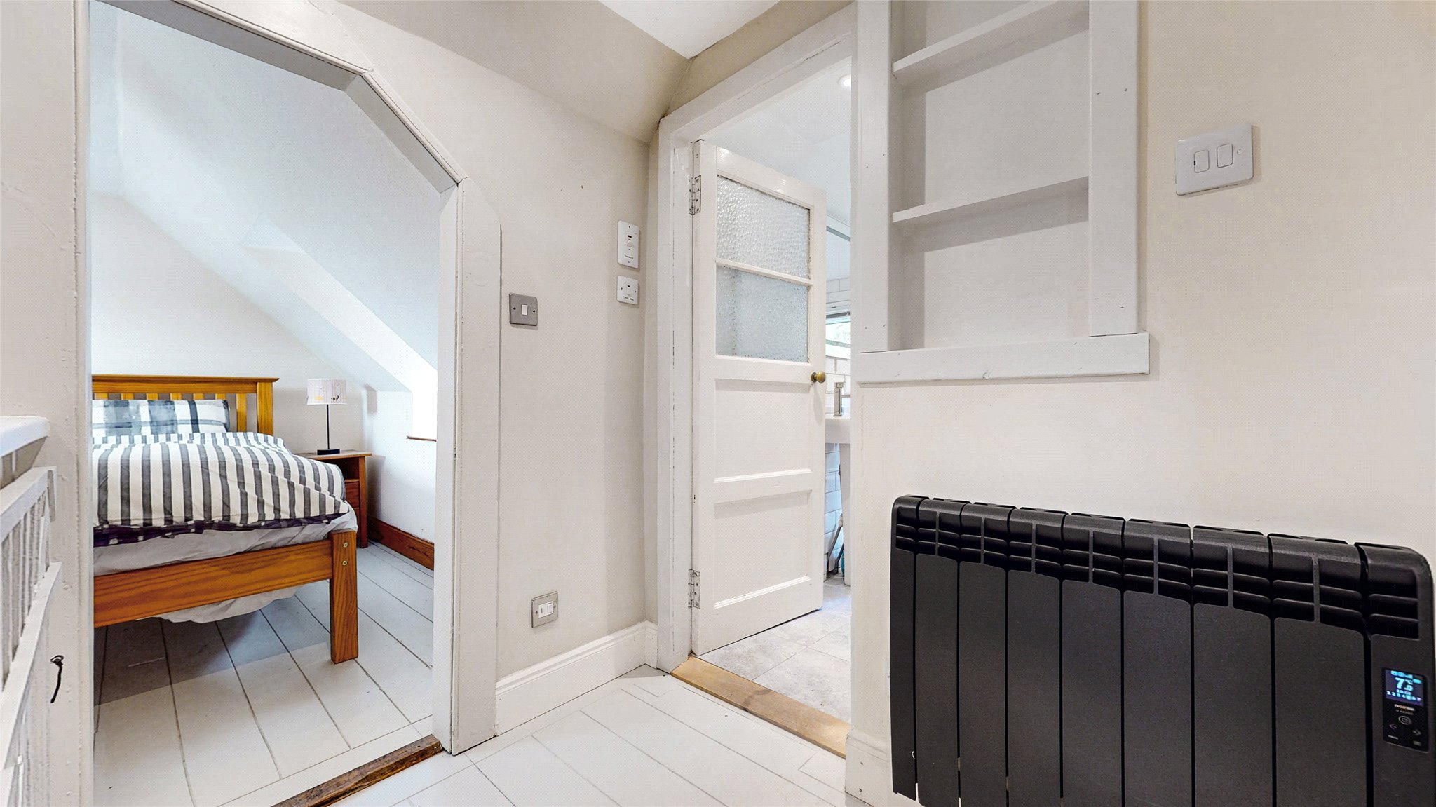 Upstairs, you'll find two further double bedrooms, each with vaulted ceilings and skylights that flood the rooms with natural light. A family bathroom with both bath and separate shower completes this level.
