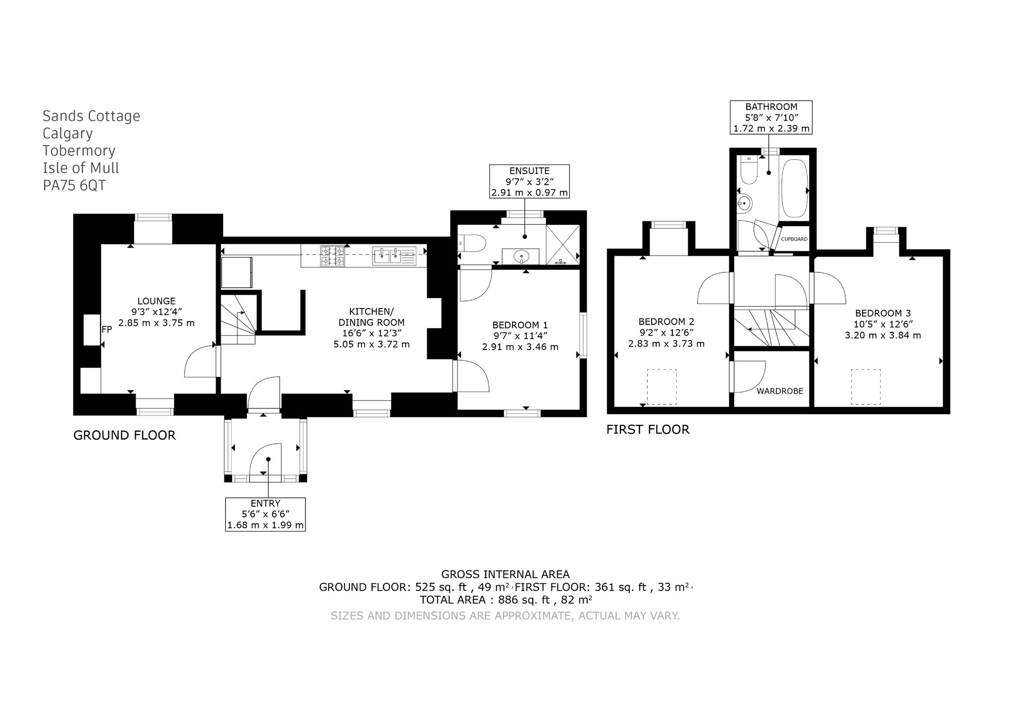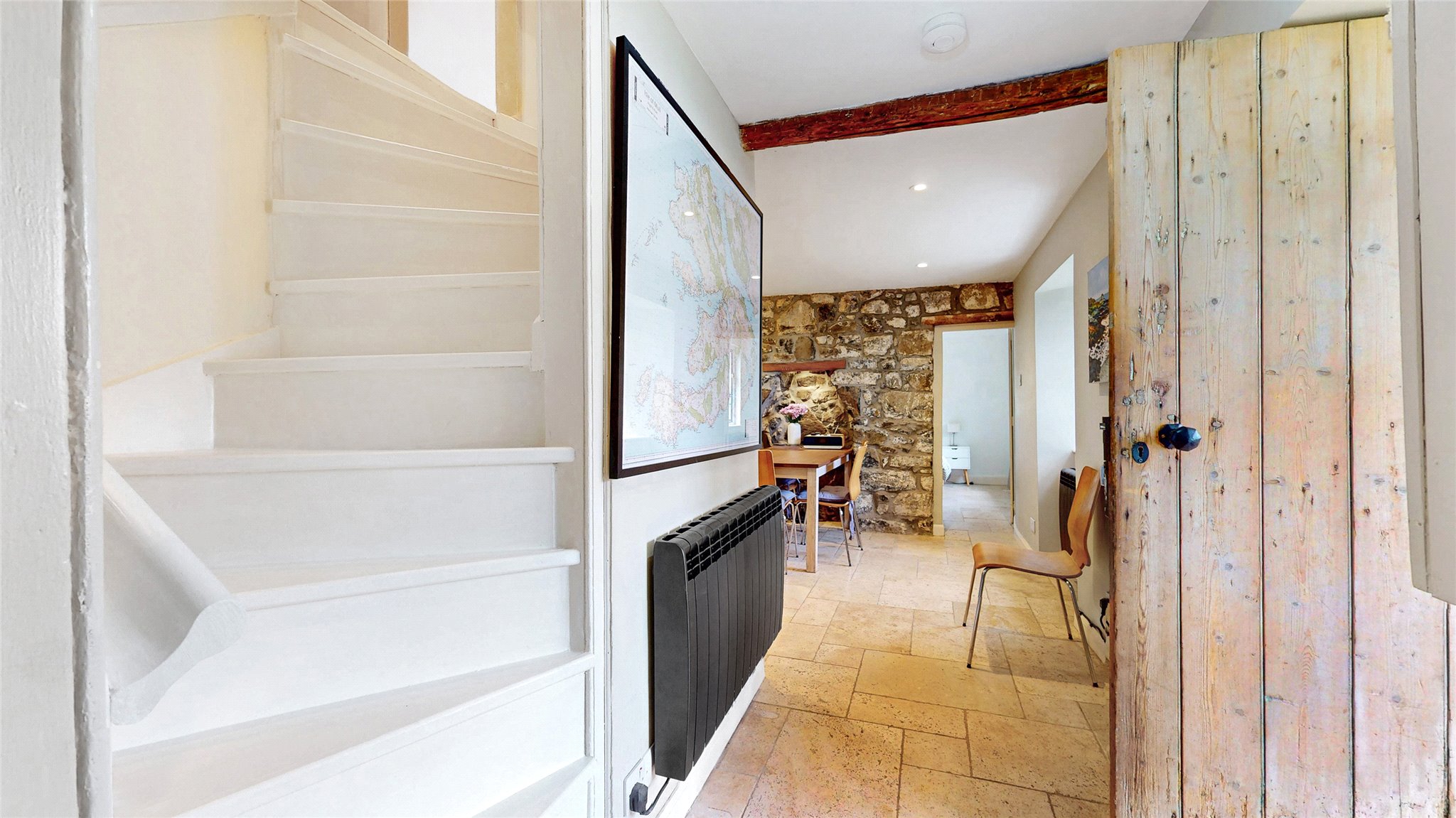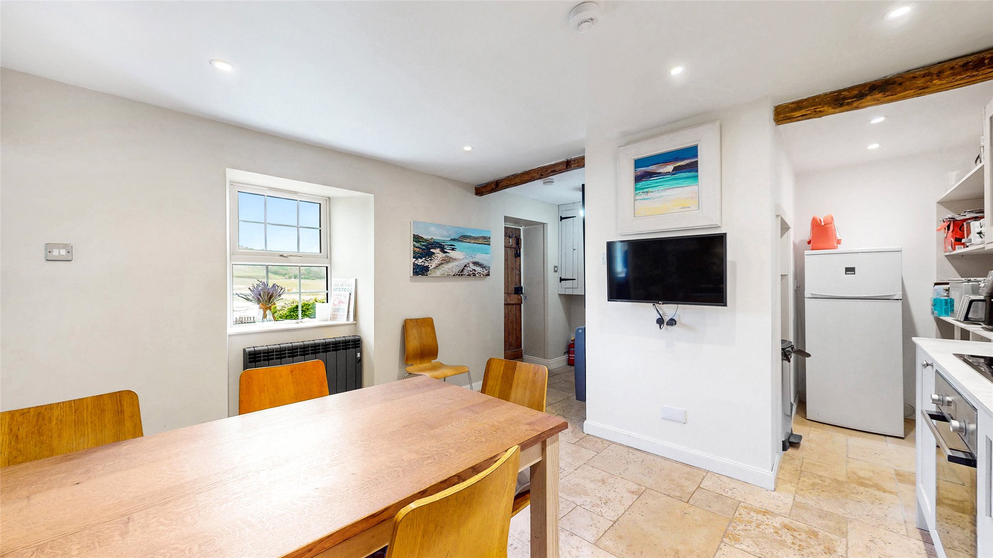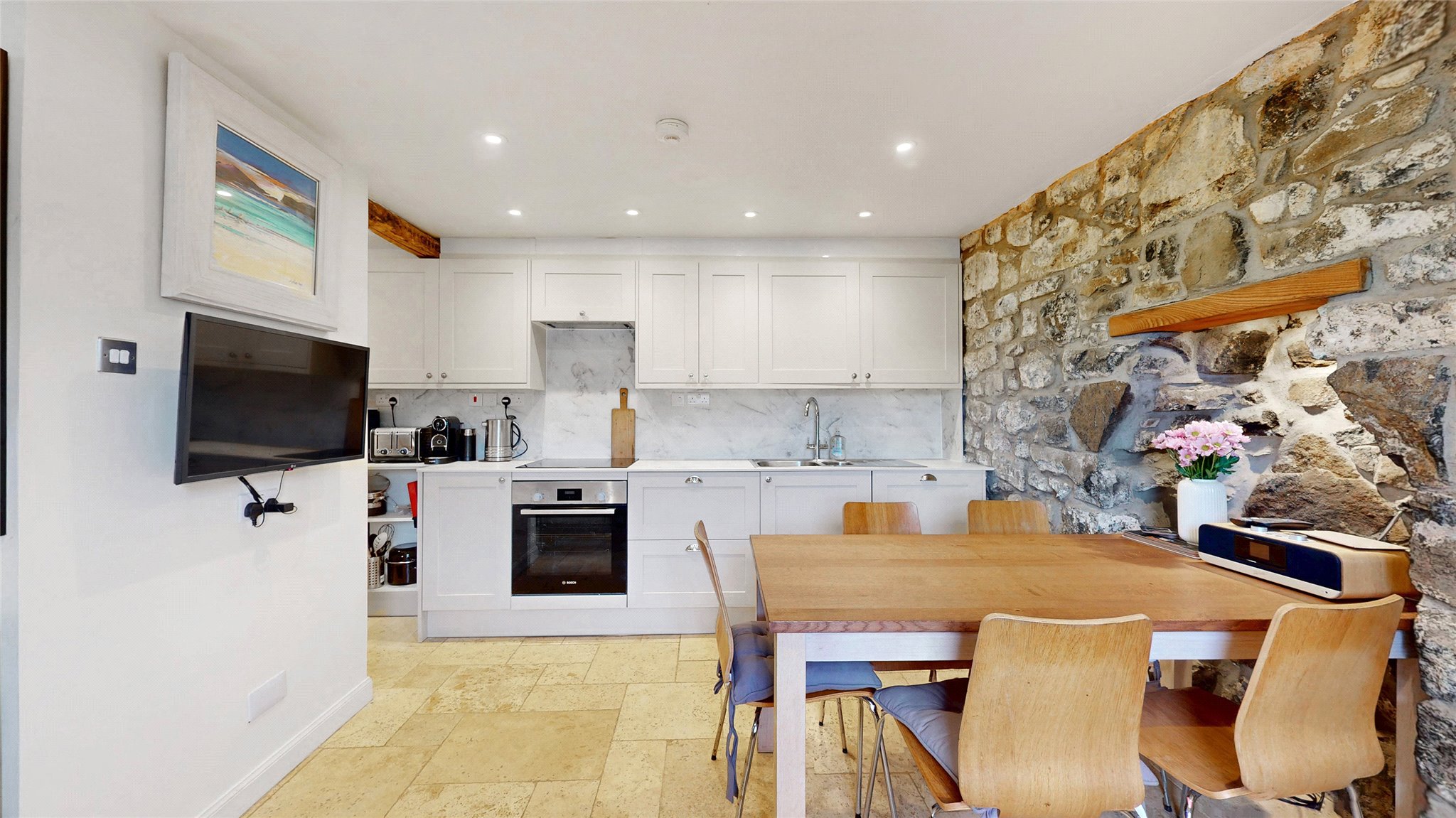 This delightful cottage is arranged over one and a half storeys and features three spacious double bedrooms, including a ground-floor principal suite with en suite shower room. Entry is via a welcoming porch leading into a central hallway, with a characterful dining kitchen featuring a stone accent wall and a range of fitted cabinetry.