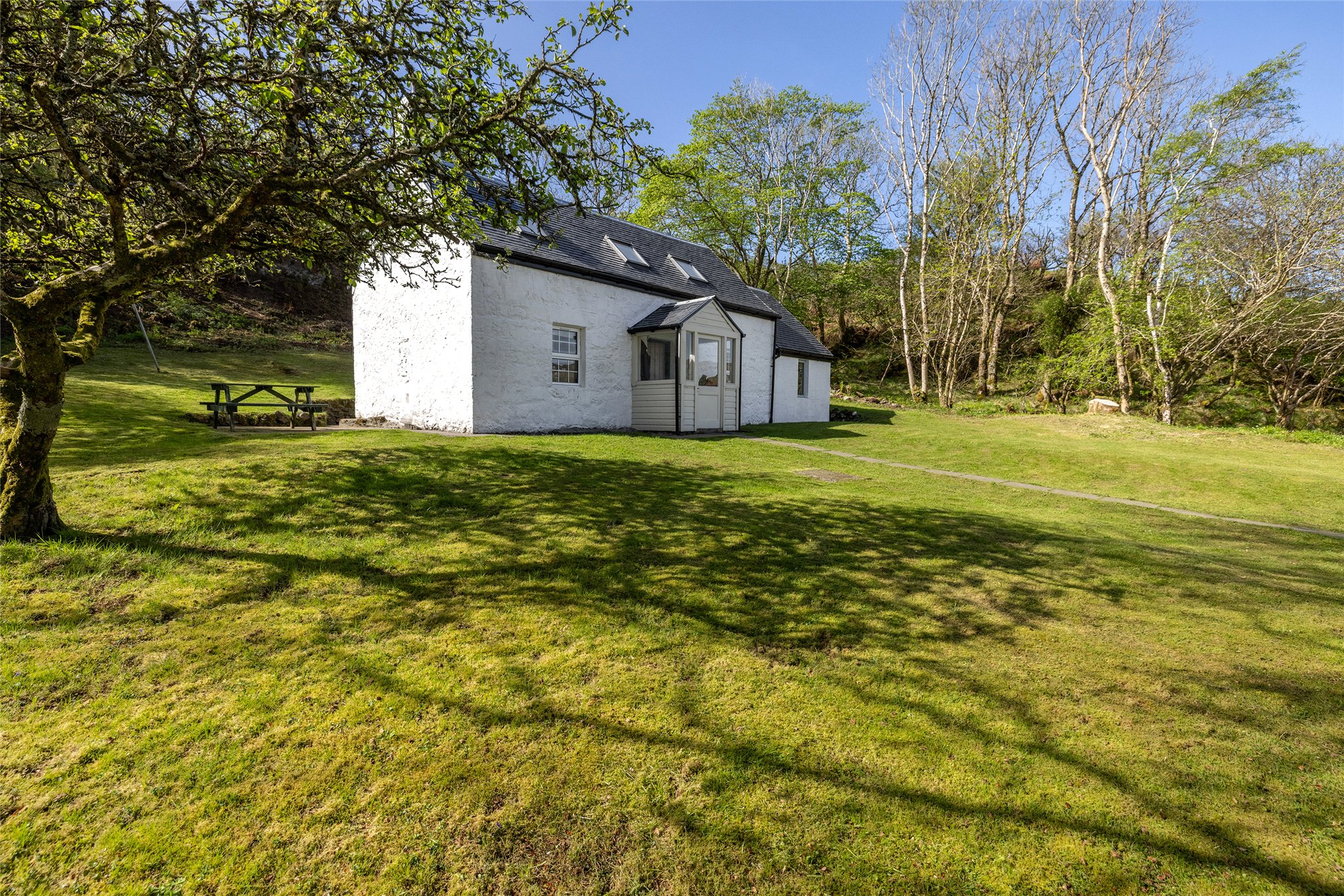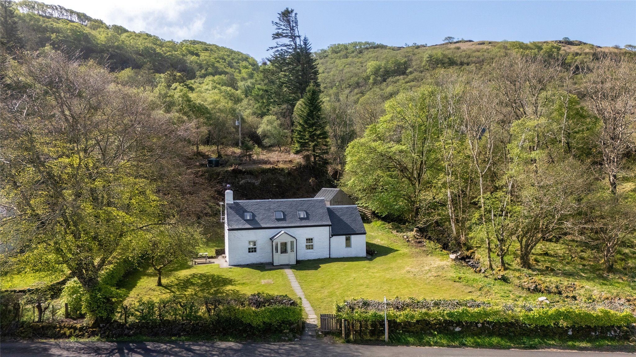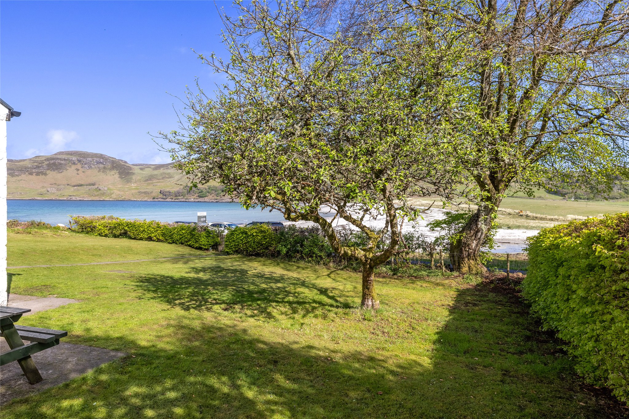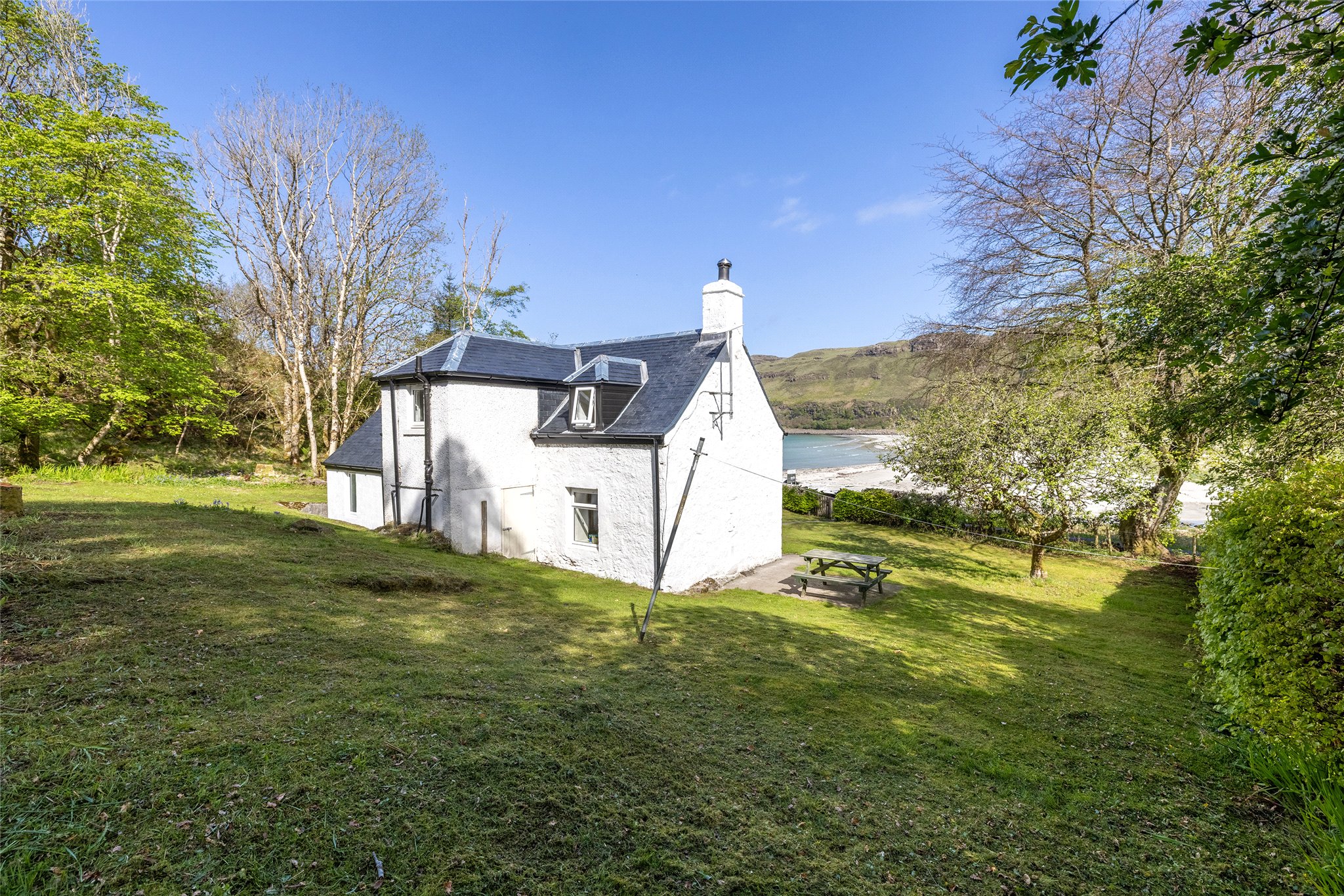 Surrounded by well-maintained gardens, mainly laid to lawn and bordered by neat hedging, the exterior is as charming as the interior. A patio with picnic bench makes the most of the scenic setting. There is also an external laundry/store room, a garden shed, and a wood store—perfect for island living.