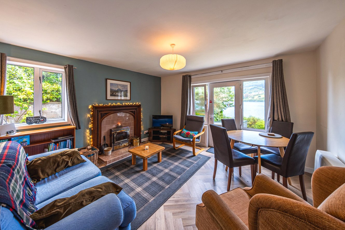 There are 3 bedrooms, two of which enjoy views over Loch Ness, ensuring you wake up to the tranquil beauty of the water each morning. The modern bathroom has a shower over the bath and WC, and the upgraded contemporary kitchen is fully equipped with integrated appliances and plenty of storage space.