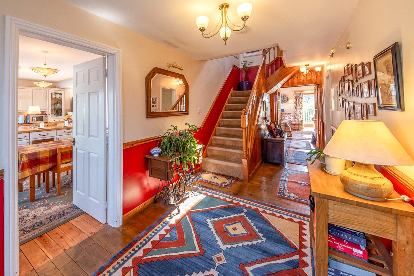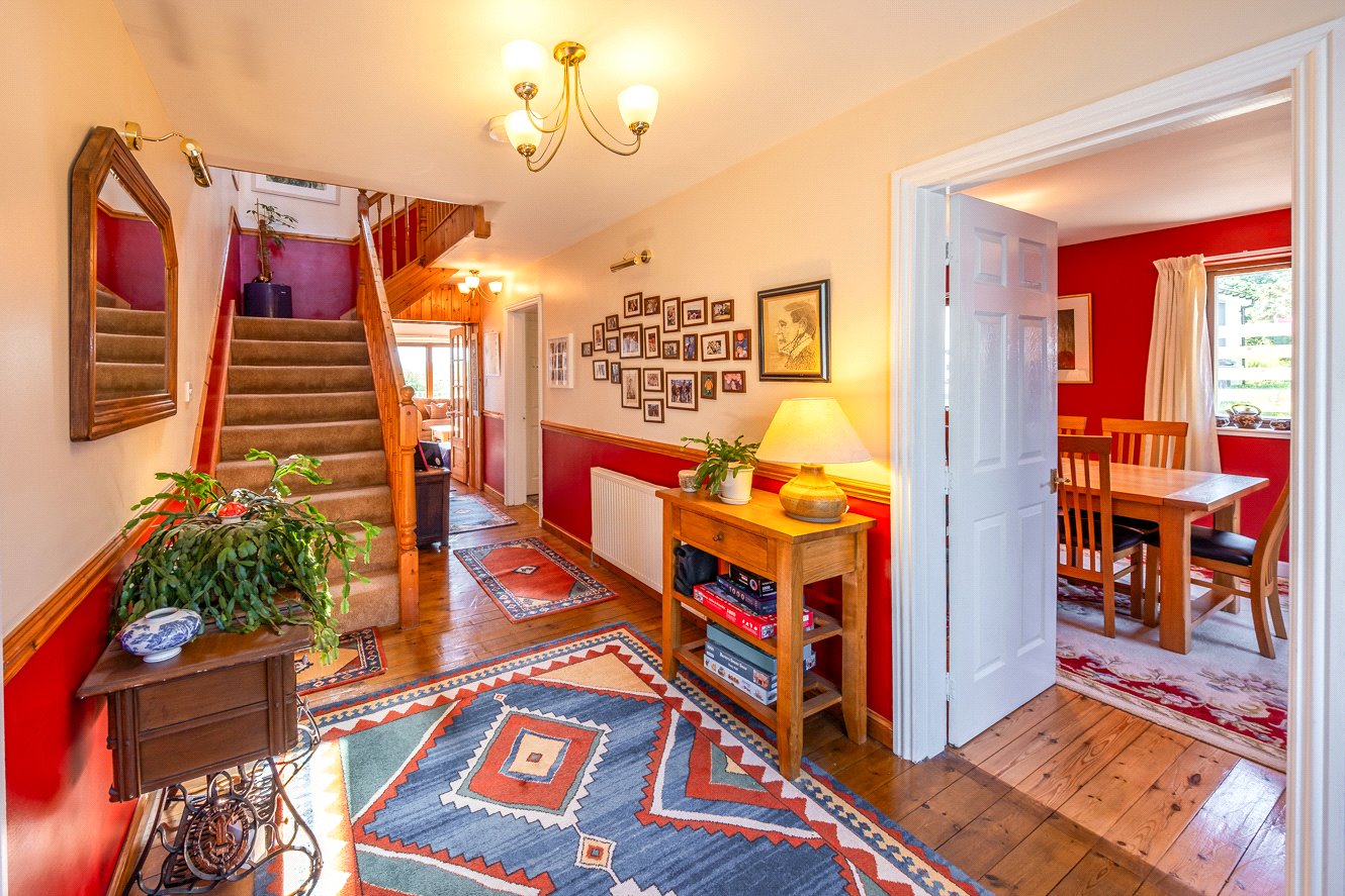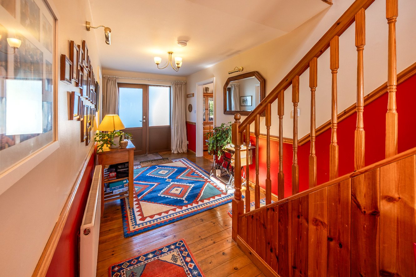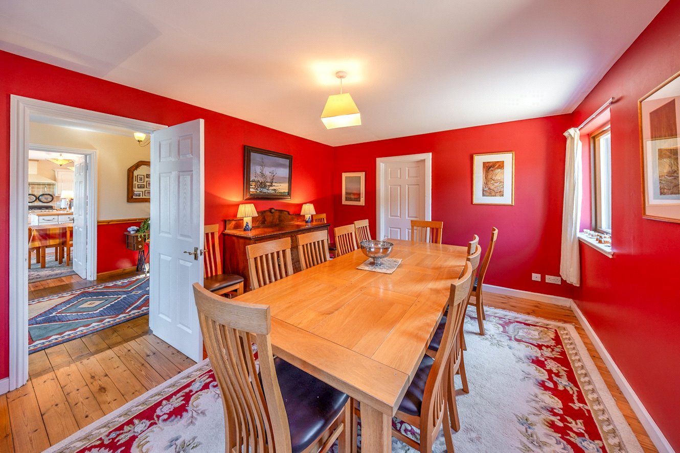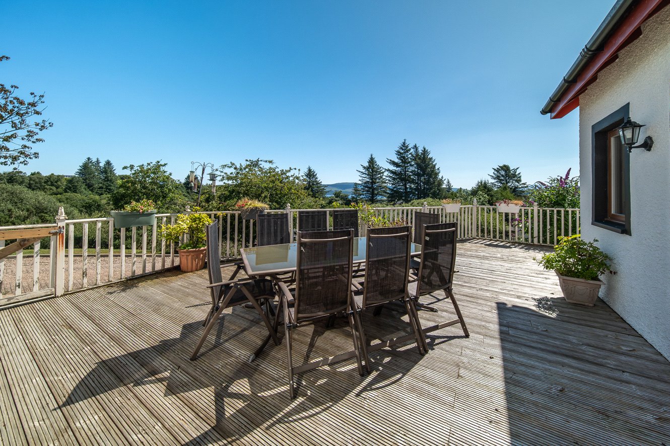 The entrance hallway is bright and spacious with doors leading off to the ground floor rooms which include a very large, bright lounge with high ceilings, extensive book shelves, a free standing multi fuel stove with large hearth and windows to the side. Patio doors open on to the wraparound deck which is ideal for alfresco dining, and taking in the dramatic, sweeping views.