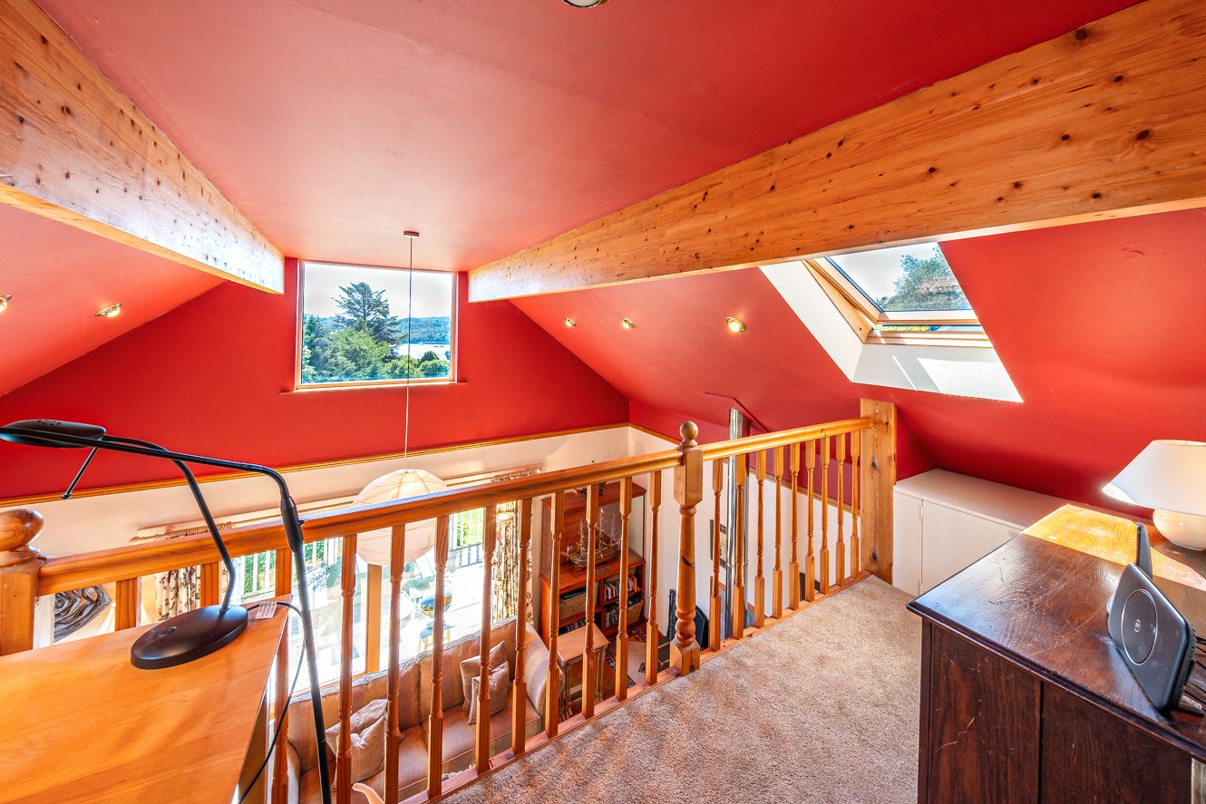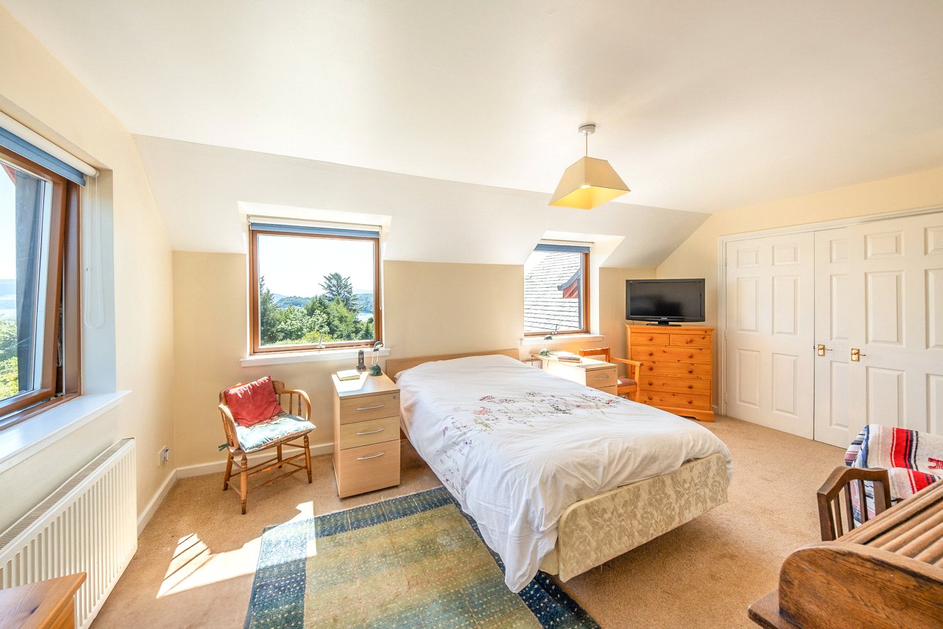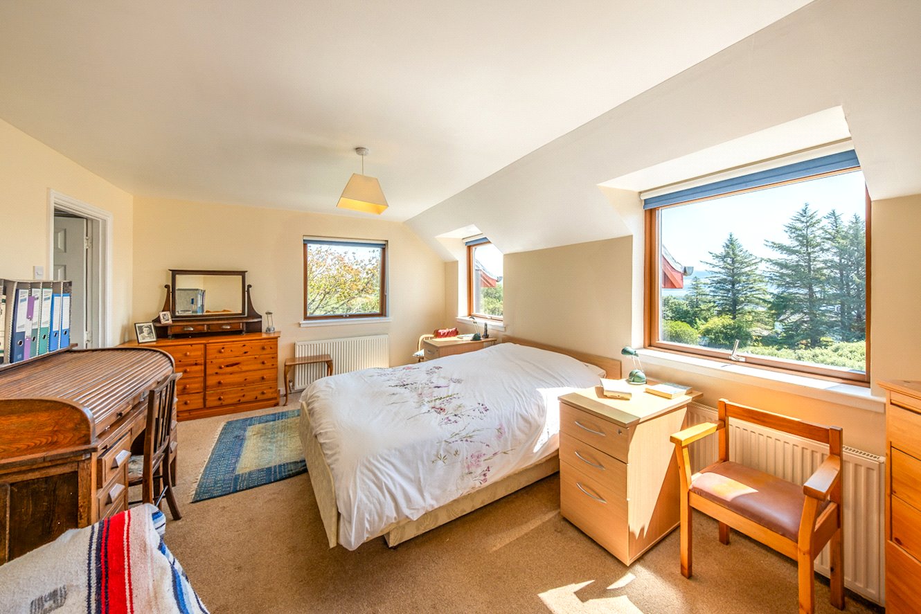 On the upper level the galleried landing overlooks the living room and has views over Tobermory Bay and Sound of Mull. Velux windows provide an abundance of natural light. There are three double bedrooms, all with built in wardrobes, and a single bedroom. The Jack and Jill family bathroom has an electric shower over the bath, wash hand basin and wc, and a door gives access to the adjacent large double bedroom. The large Master bedroom has dual aspect widows to the front and side, and a large en suite with bath, electric shower cubicle, a wash hand basin, and a side window. A large hatch with a substantial pull down ladder offers access to a full lined loft space running the length of the property