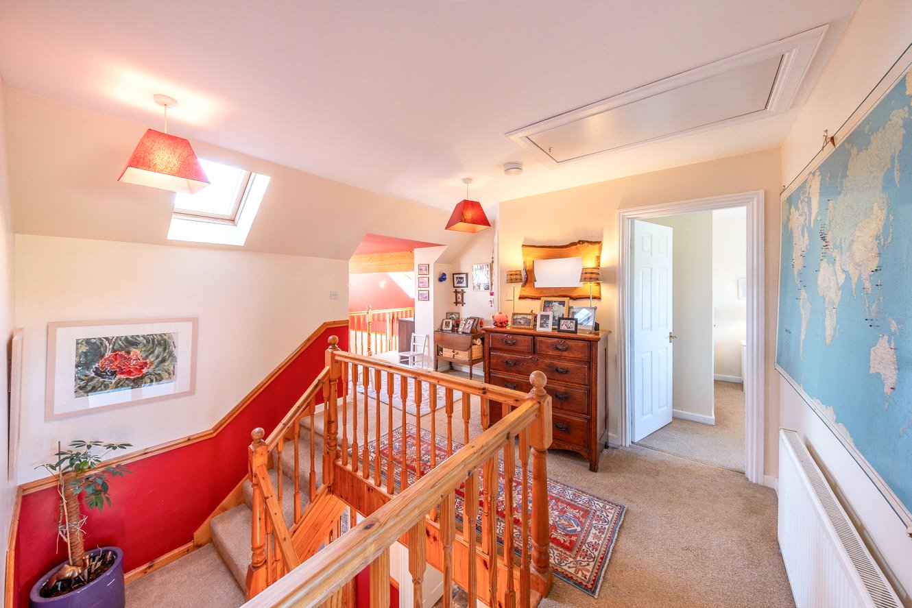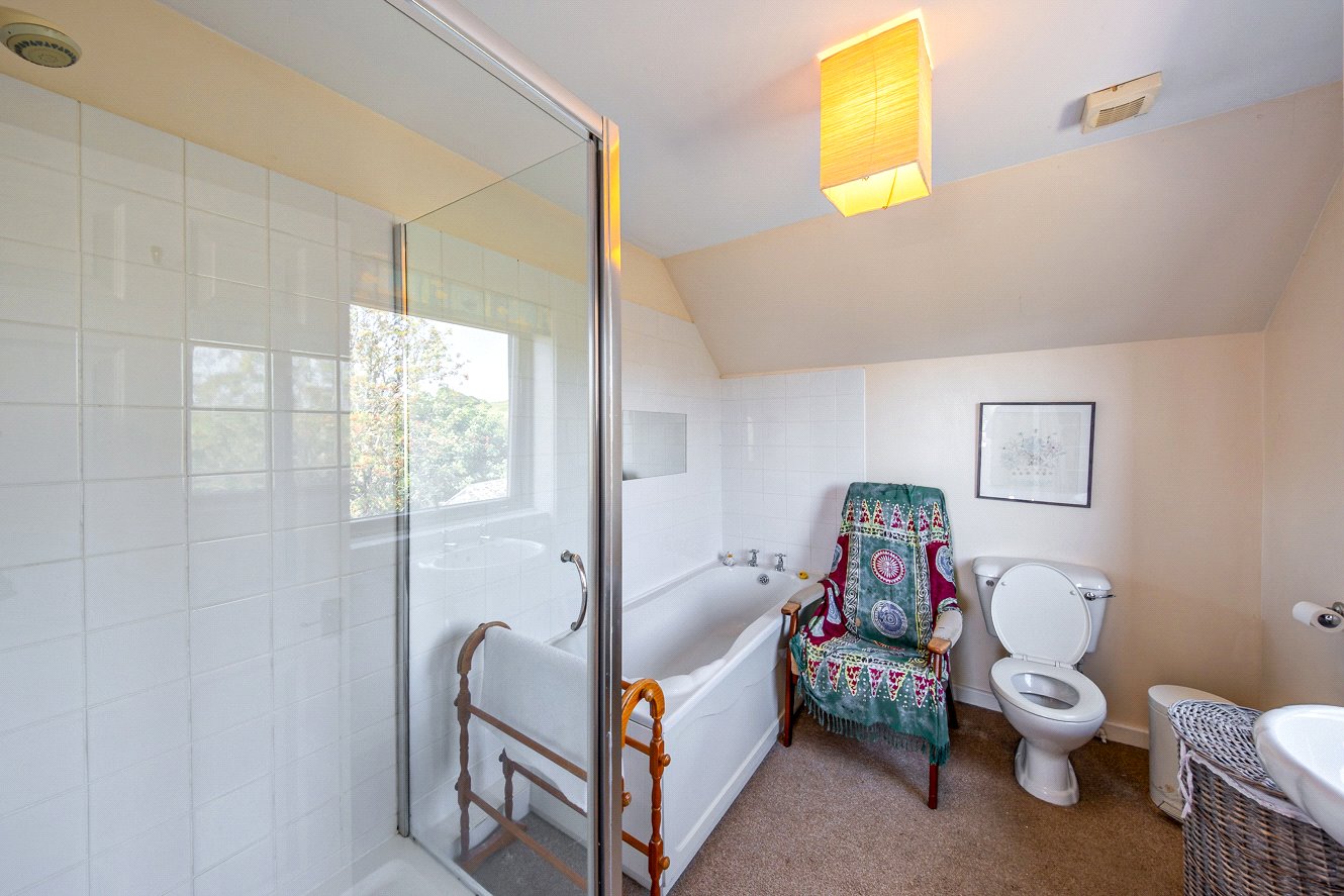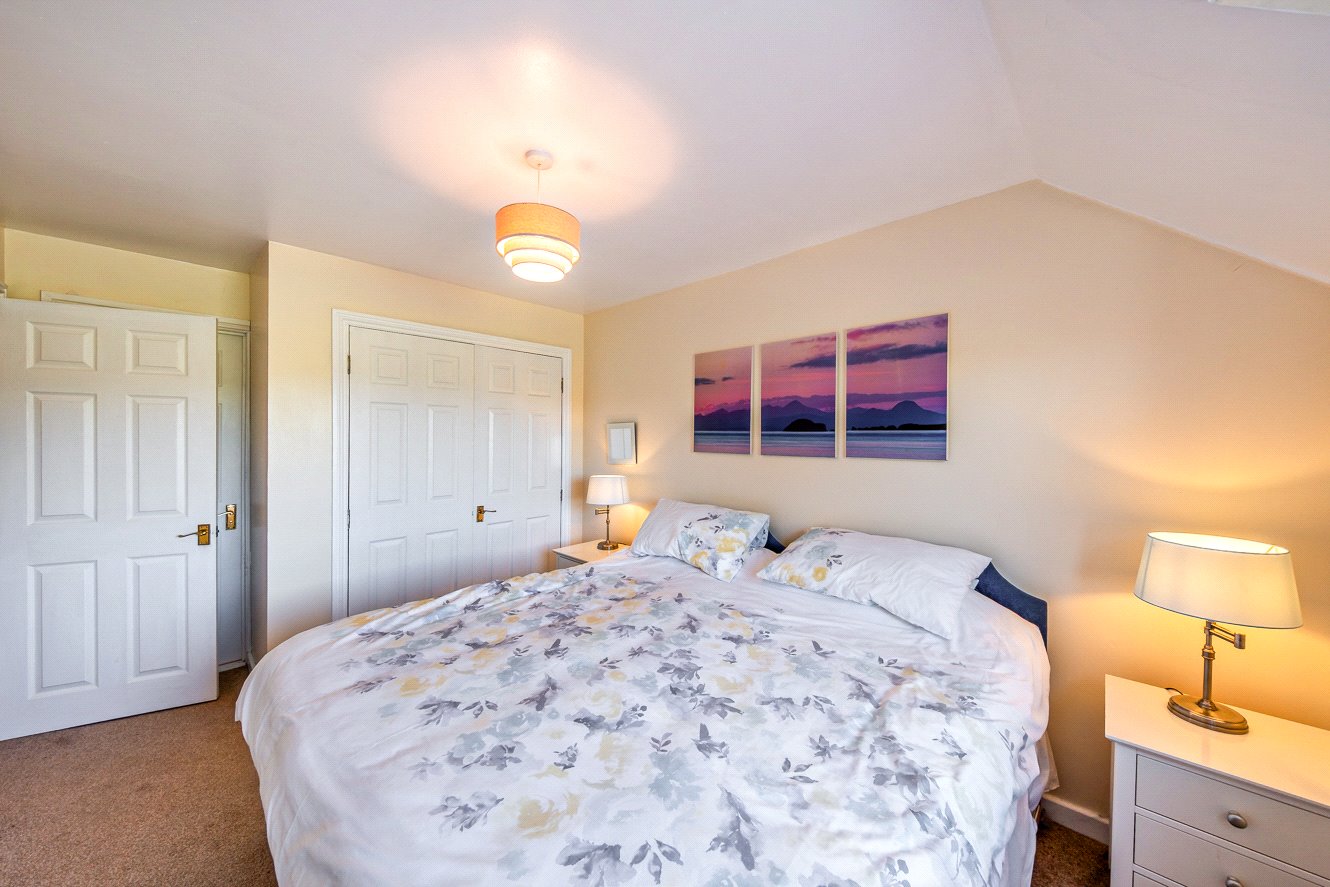 On the upper level the galleried landing overlooks the living room and has views over Tobermory Bay and Sound of Mull. Velux windows provide an abundance of natural light. There are three double bedrooms, all with built in wardrobes, and a single bedroom. The Jack and Jill family bathroom has an electric shower over the bath, wash hand basin and wc, and a door gives access to the adjacent large double bedroom. The large Master bedroom has dual aspect widows to the front and side, and a large en suite with bath, electric shower cubicle, a wash hand basin, and a side window. A large hatch with a substantial pull down ladder offers access to a full lined loft space running the length of the property