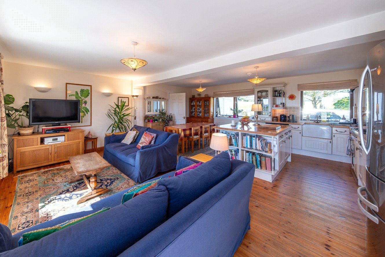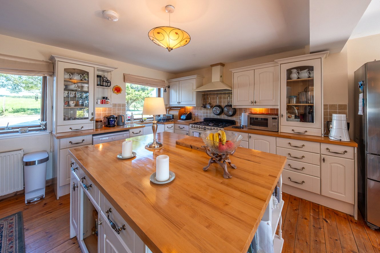 A large central island provides additional storage including a wine rack, shelving and workspace. Windows with views to both the front and to the rear make this an exceptionally bright room throughout the day. A fully glazed door gives easy access to the large deck.