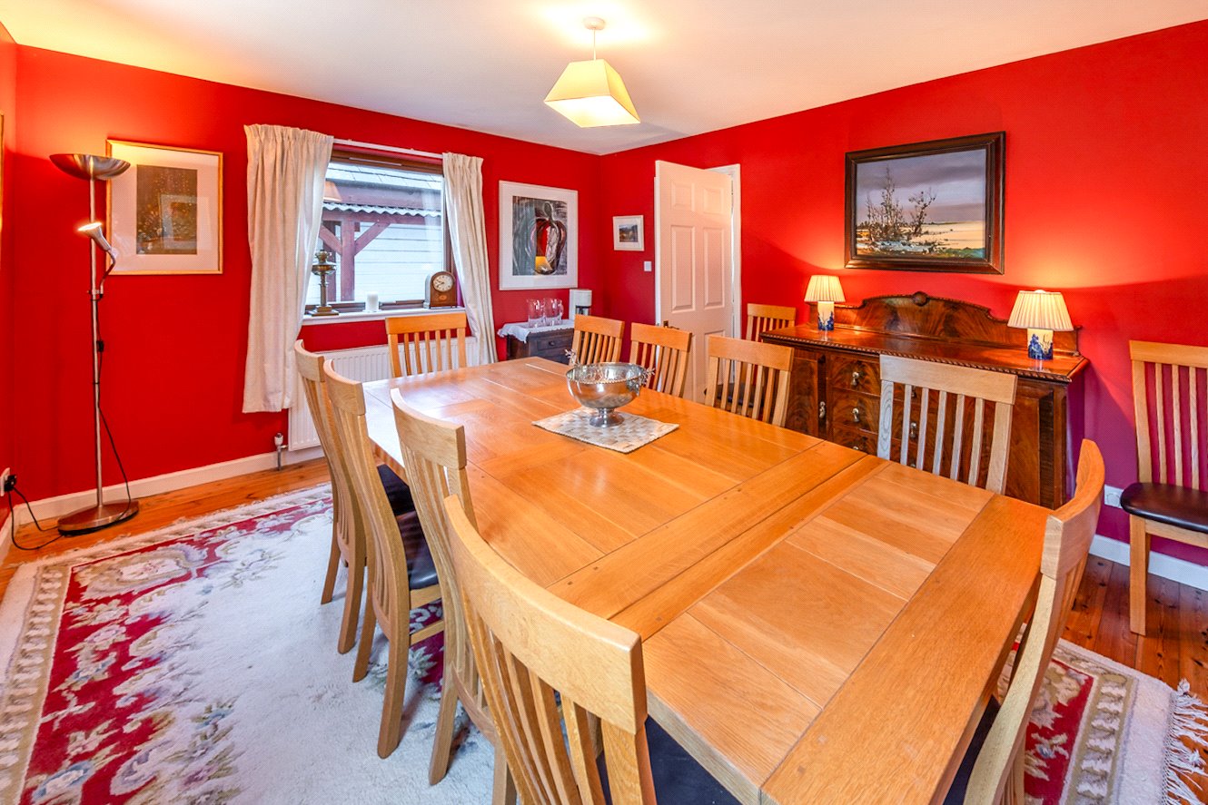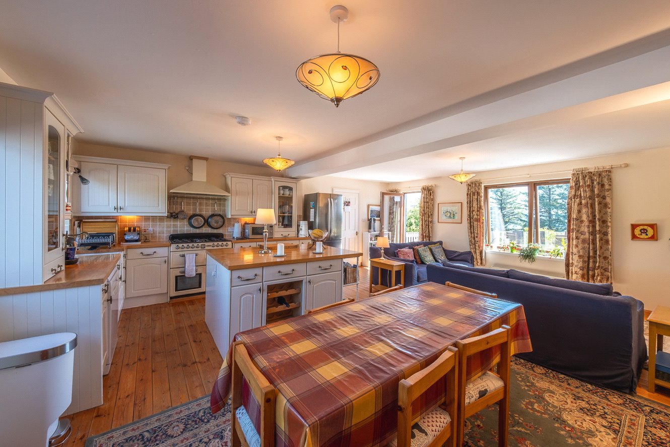 The dining room / 5th bedroom has dual aspect windows, and a door leading to a shower room. An open-plan living area seamlessly combines a fully fitted kitchen, dining space, and lounge—an ideal setting for family life and informal entertaining. The kitchen has a dishwasher, Belfast sink, free standing combination stove with electric ovens and gas hob, and an array of wall and base units, complemented by wooden worktops.