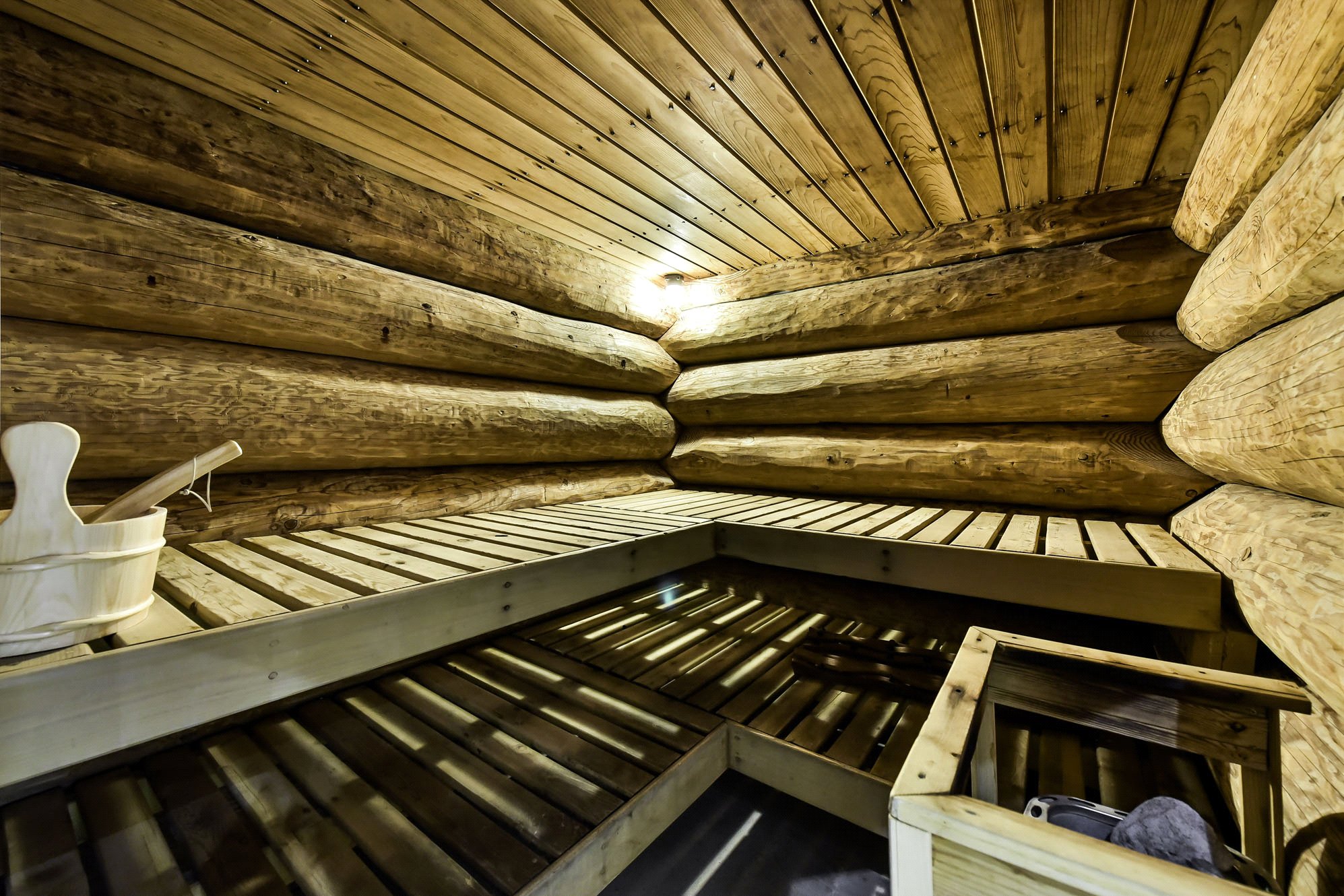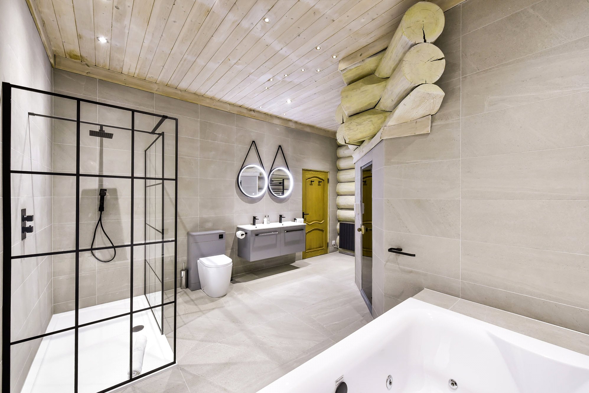 Large spa bathroom with a double Jacuzzi, walk-in shower, dual wash hand basins and a sauna.