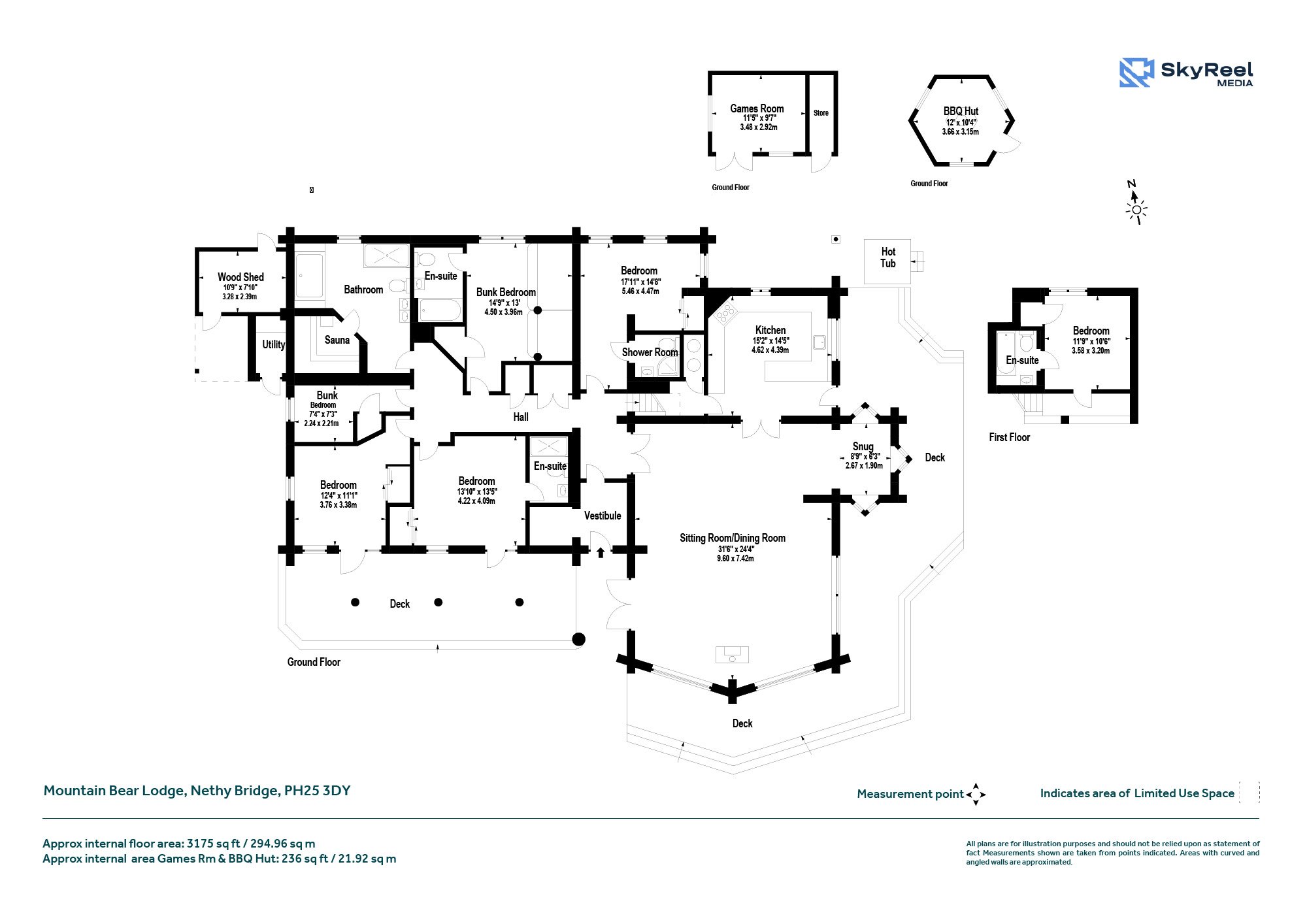 The lodge sits in almost 0.5 acres. To the front of the Lodge is a gravelled area leading to a raised bed planted with heathers and evergreens. Beyond is an undulating grassed area with Scots pine and silver birch trees. To the rear of the Lodge the BBQ hut and owner’s cabin are carefully situated between pine trees. To the west of the house a gravel parking area leads to a tarmacadam drive. The whole garden is enclosed by fencing.