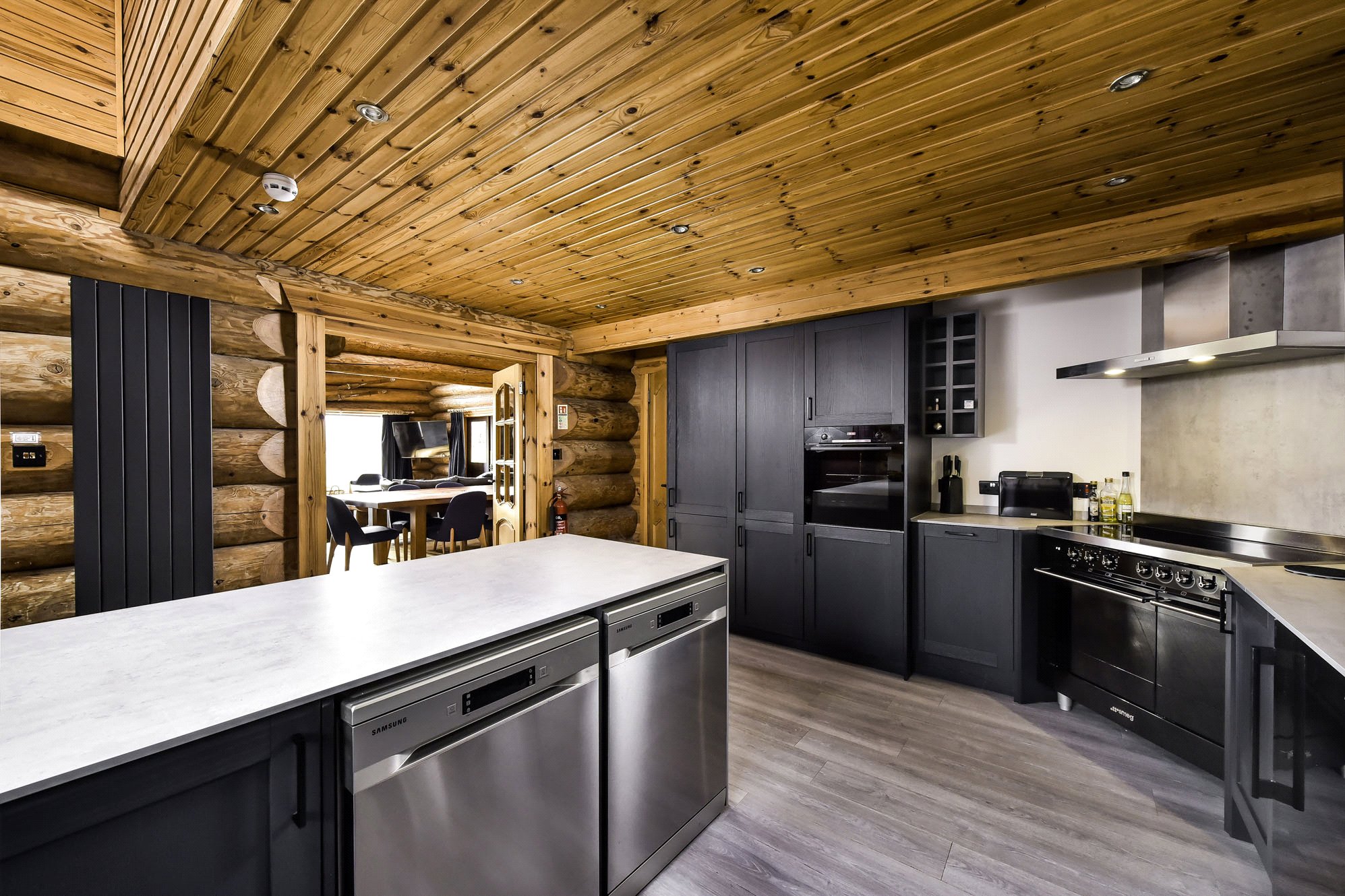 The Lodge has a dedicated parking area to the west from which a path leads to the front door which opens to a spacious boot room/outer hall with under-floor heating and on to the principal hall with a staircase to the first floor gallery and doors to the bedrooms and principal reception room. The huge living room has a Cathedral style vaulted ceiling with exposed beams and large floor to ceiling windows with southerly views to the Cairngorms. A feature of the room is the Tulikivi wood burning stove clad in soapstone which stores and radiates the heat throughout the day. The adjoining dining area is of Alpine design and allows guests to sit round one large table and enjoy a fantastic dining experience. The adjoining kitchen is wonderfully equipped with a range cooker, two dishwashers, wine fridge, fridge freezer and quality units and work surfaces. There is a small utility cupboard off the kitchen plumbed for a washing machine.
