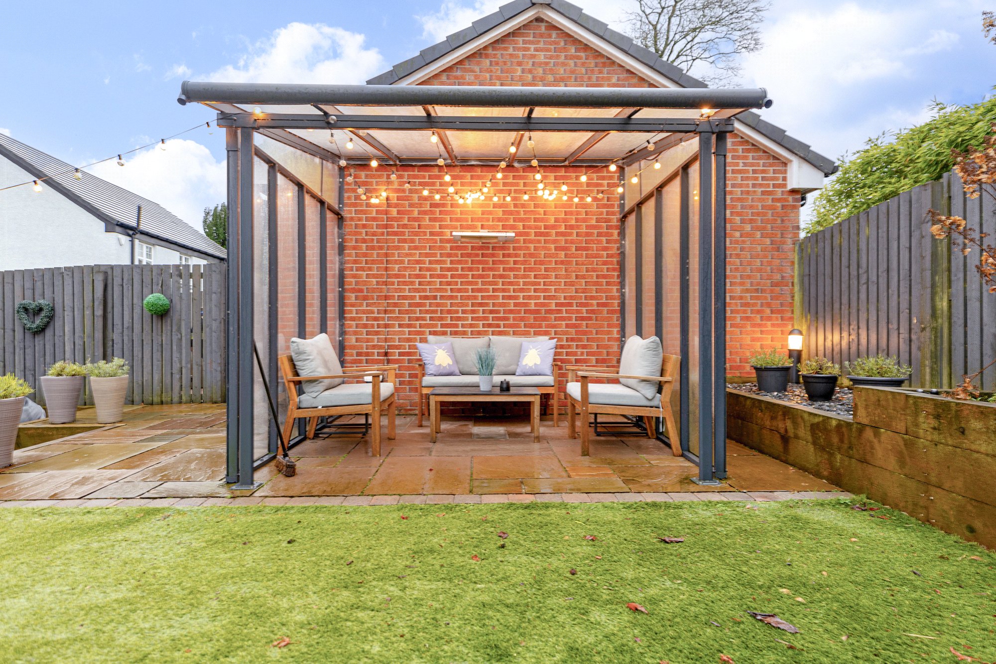The rear gardens have been professionally landscaped and include a large flagstone terrace, astroturf and a cleverly designed glass pergola attached to the garage, ideal for BBQ and outdoor entertainment.