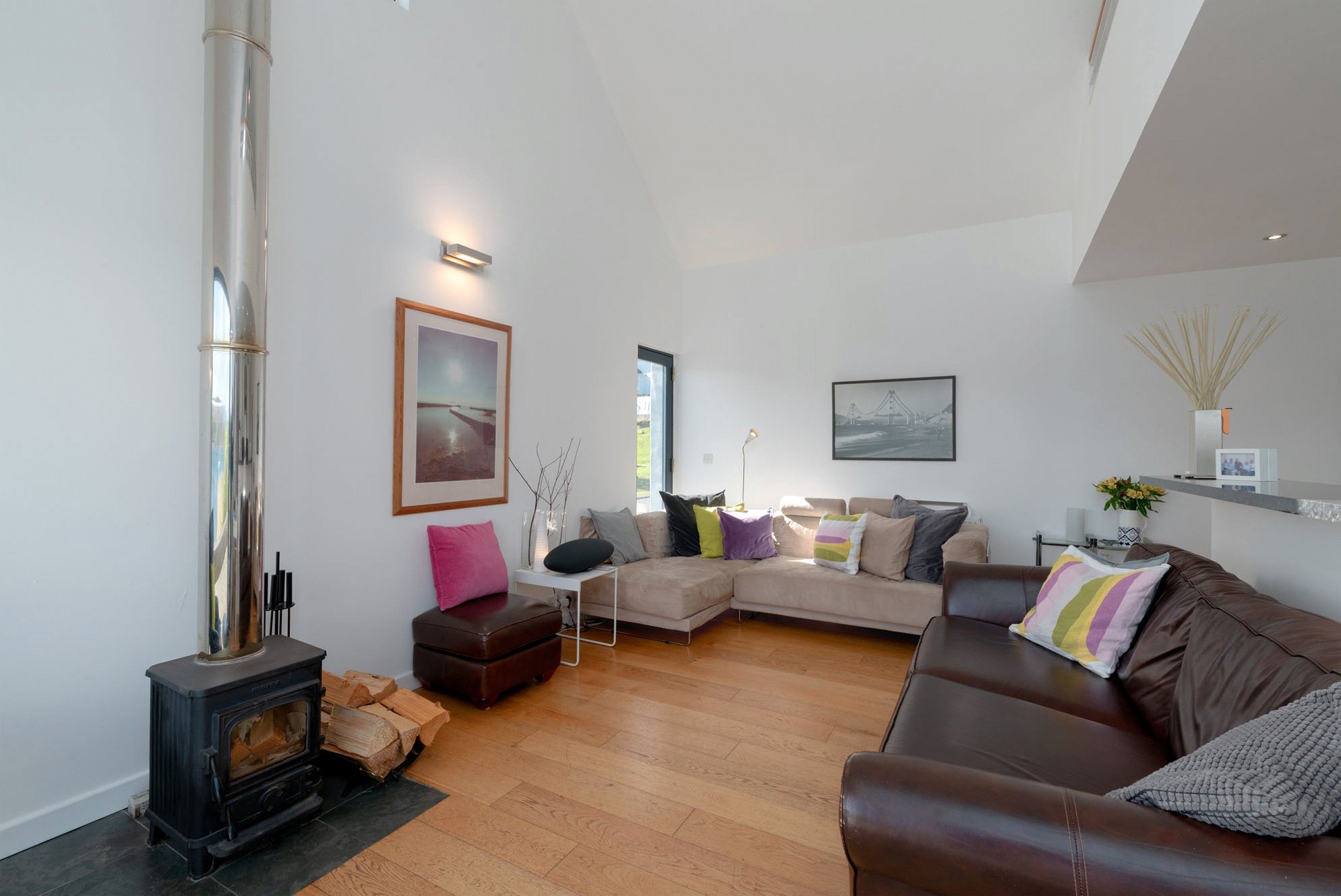 This stunning architect designed home sits in the most breathtaking of locations on Scotland’s west coast, close to the village of Tighnabruiach, a hugely popular sailing destination within the Kyles of Bute. Situated on the site of the Kames Pier, once a busy stop off point for passengers on the numerous pleasure steamers that were so popular in the 19th and first half of the 20th century, the house has a pleasing contemporary exterior which fits well into its surroundings. It has been architect designed by Studio KAP to showcase the spectacular views and to make clever use of the space within.