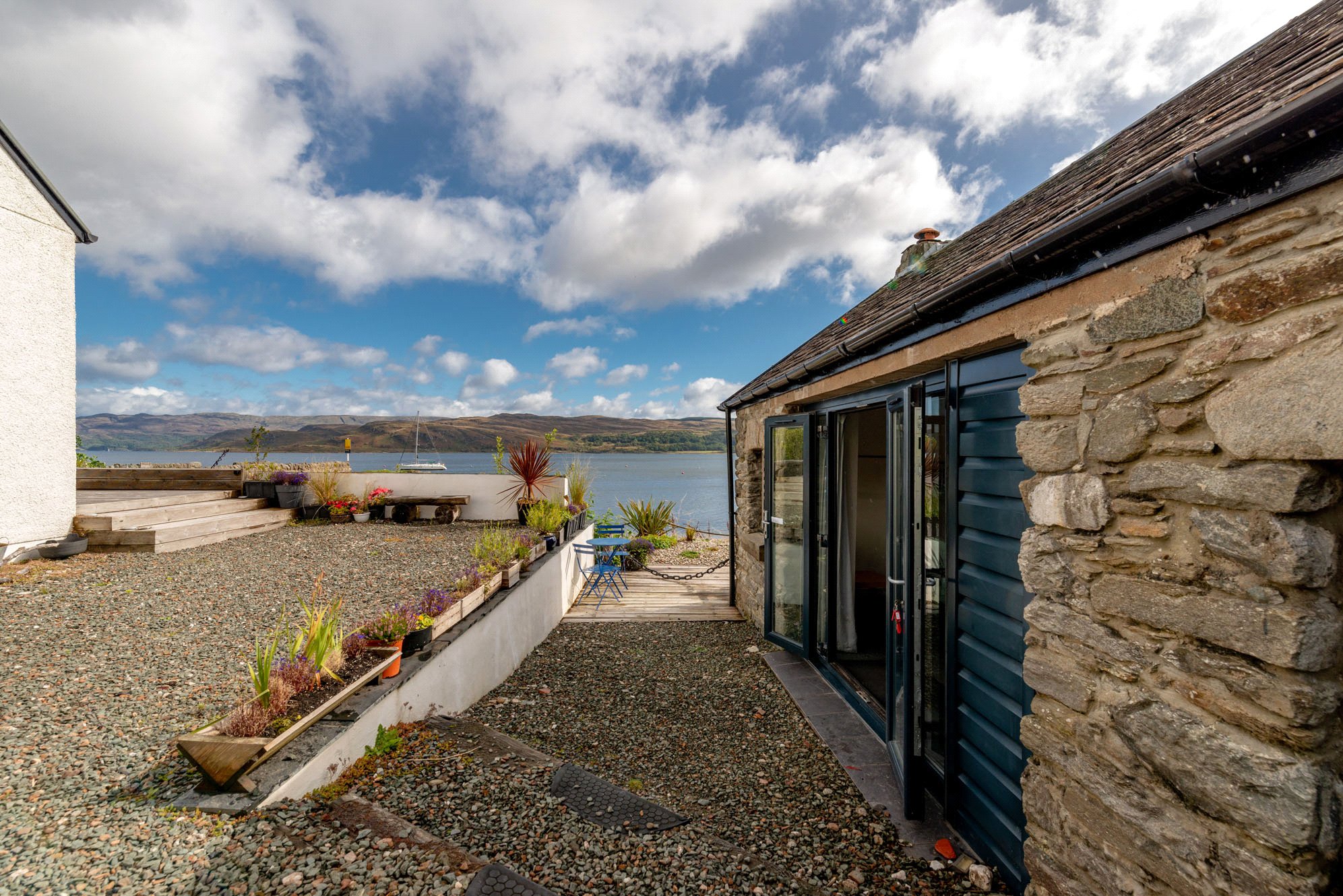 Outside, the decked terrace is a fabulous suntrap and the ideal place to sit out and take in the mesmerising views, with plenty of space for entertaining. The remains of the original pier now forms a private grassed pier which makes another wonderful alfresco spot and leads down to the water. Pier House also owns a stretch of the beach in front and adjacent to the cottage to the south of the property.