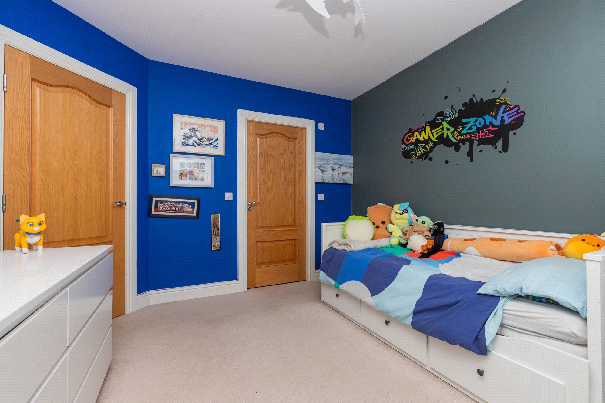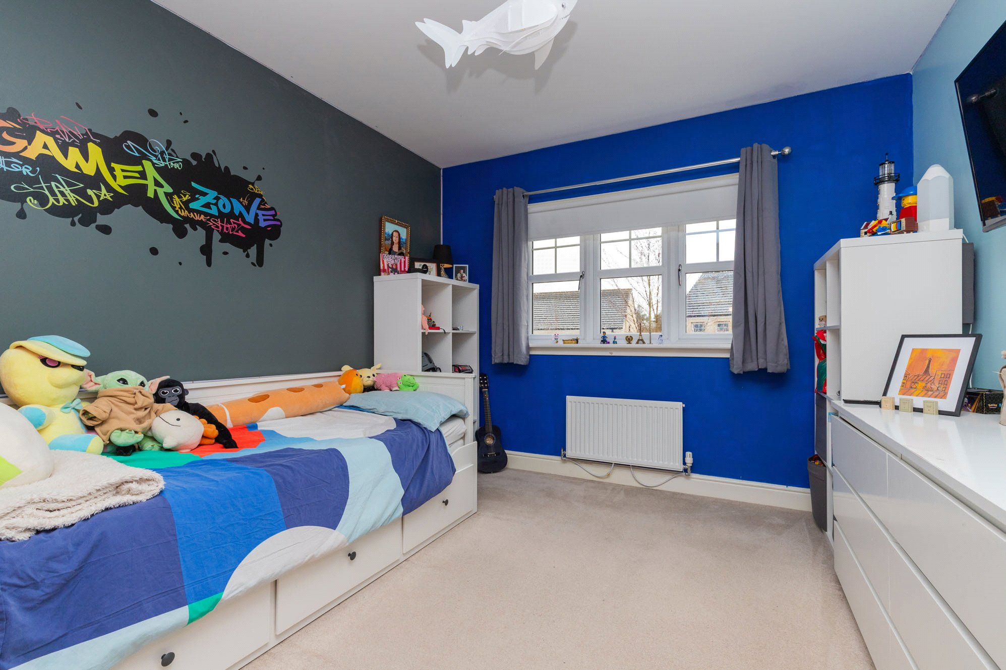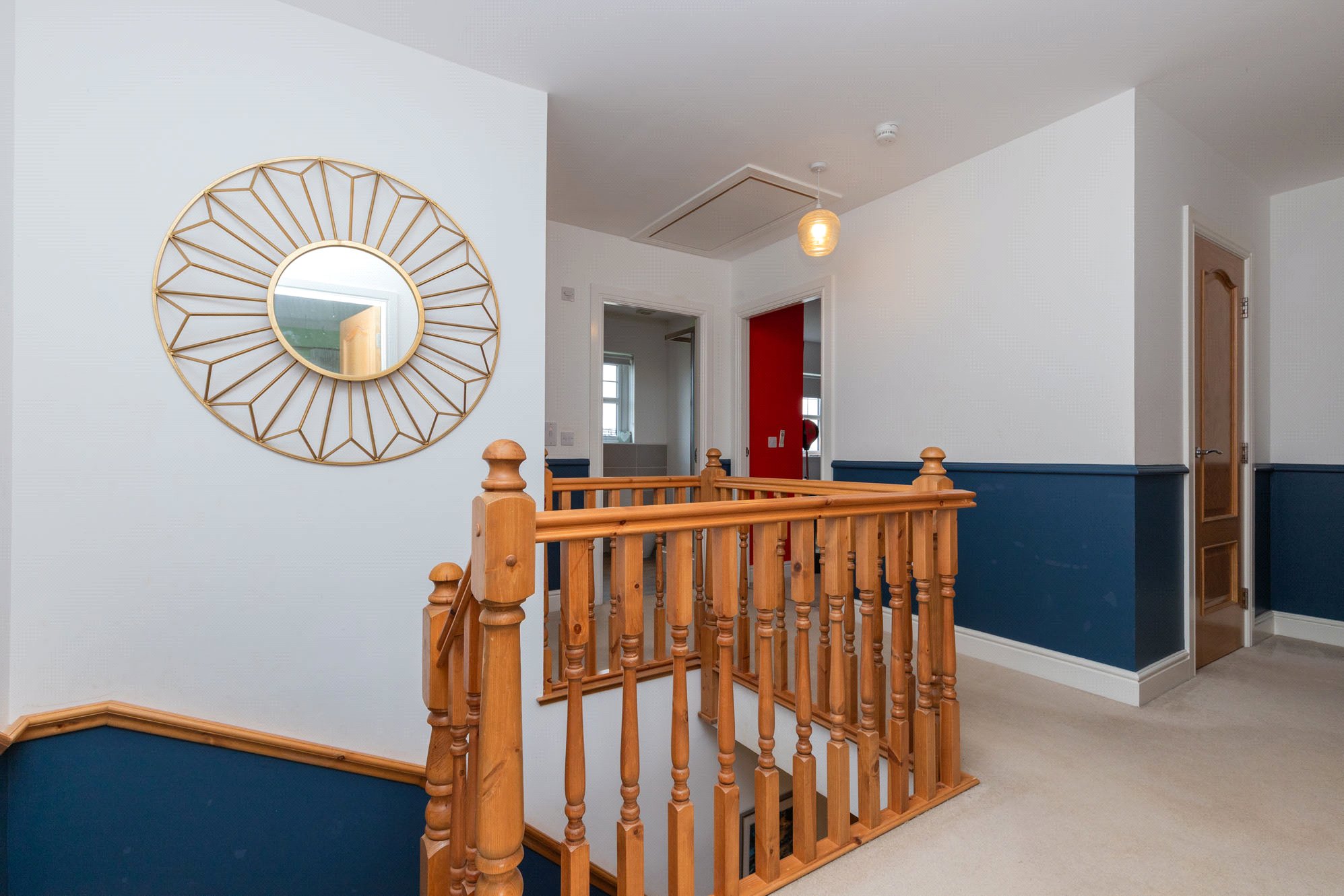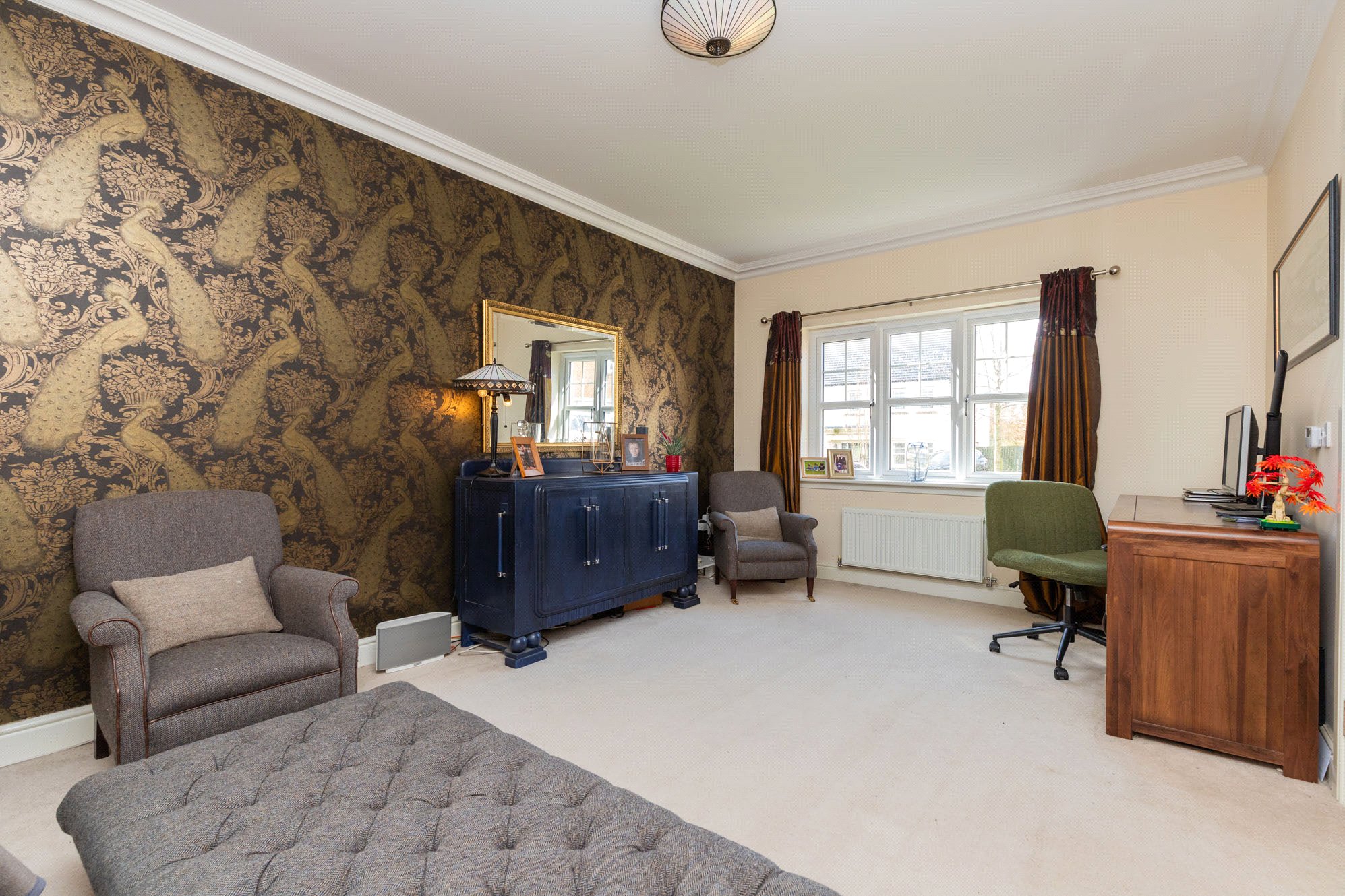 On the upper level, there are five well-proportioned bedrooms. The principal bedroom enjoys a front-facing position and benefits from an en suite bathroom. A further four bedrooms are served by a stylish family bathroom, and there is a Jack and Jill en-suite. The upper hall also has a hatch to a lined and floor loft space with lighting and ample sockets.