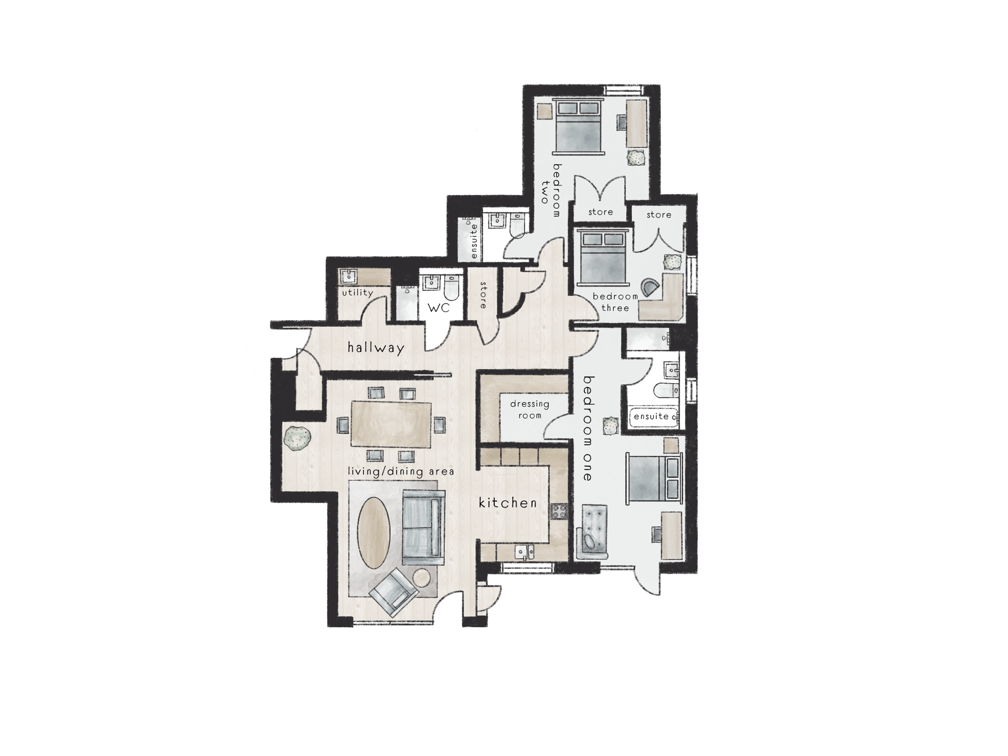 This home features a sizable principal bedroom, with a seperate dressing room and an en-suite, as well as two additional bedrooms, both with storage space and one further en-suite.