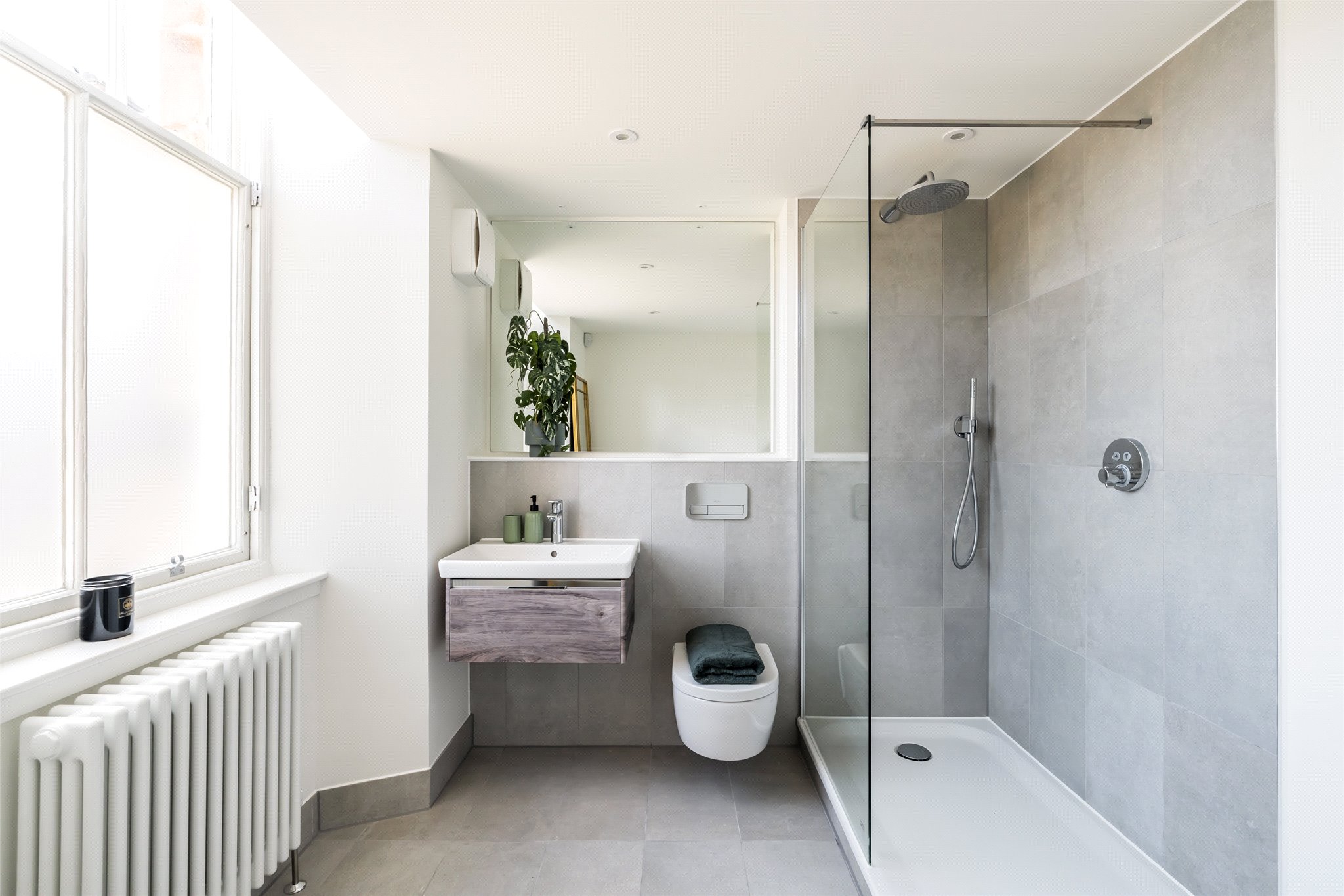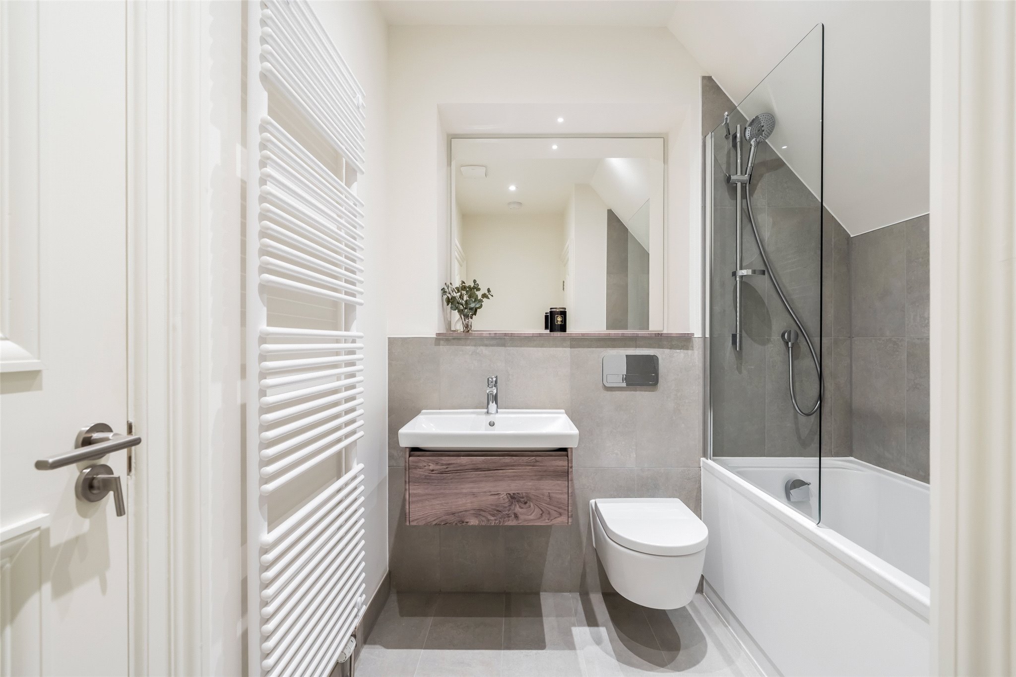 Internally, the property benefits from the most fabulous main living space comprising of the kitchen, living room and dining space. The large, private terrace is perfectly accessed from this room, providing indoor/ outdoor living. On the same floor is the principle bedroom with dressing area and en suite, and a handy WC. Upstairs, there are two further double bedrooms, one with en suite, as well as the family bathroom.