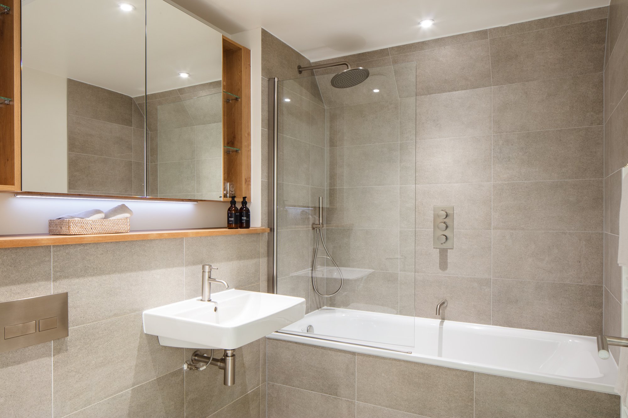 The four bedrooms are accompanied by two family bathrooms and an en-suite to the principal bedroom, plus ample storage space across all three floors. Designed and built to the highest standard, the house features a sustainable highly efficient heating system (ASHP).