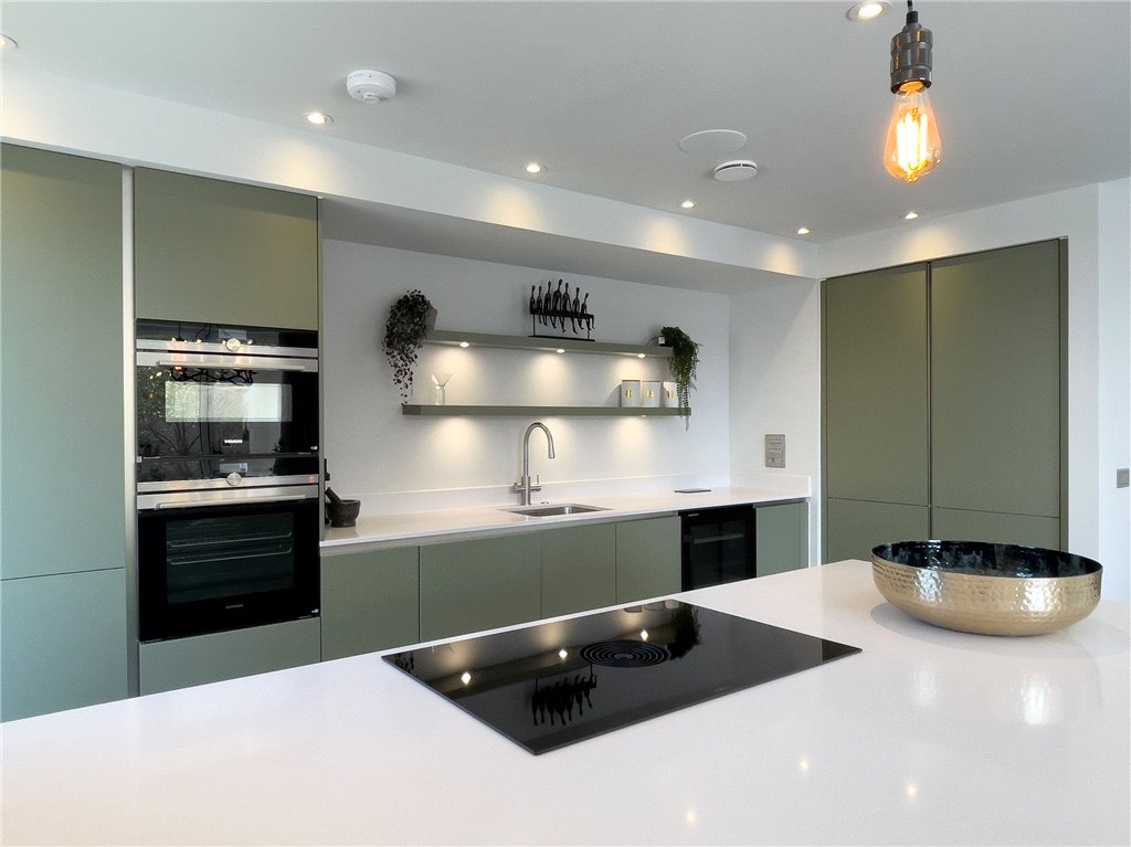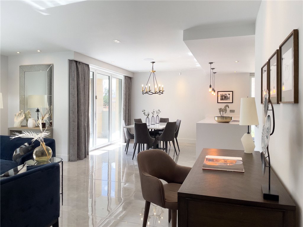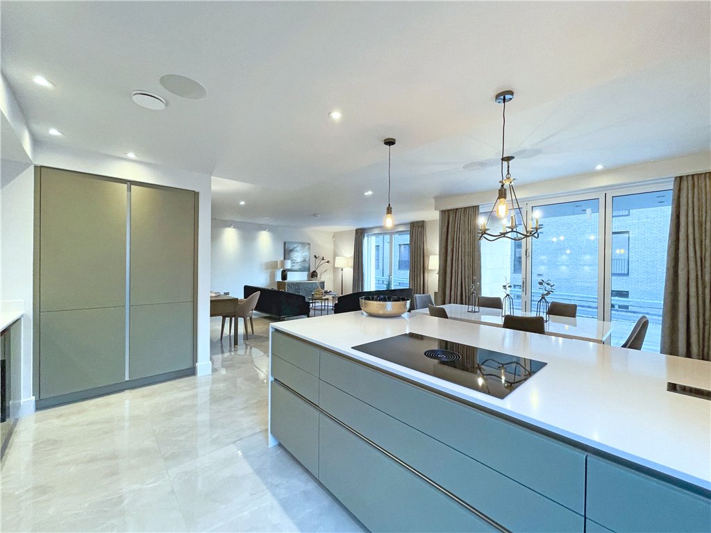 The living, dining, and kitchen area is a beautiful open-plan space with a large kitchen island and balcony, making it the perfect place to entertain. The kitchen includes highly desirable features such as a full freezer unit, boiling water tap, and integrated brand-name appliances.