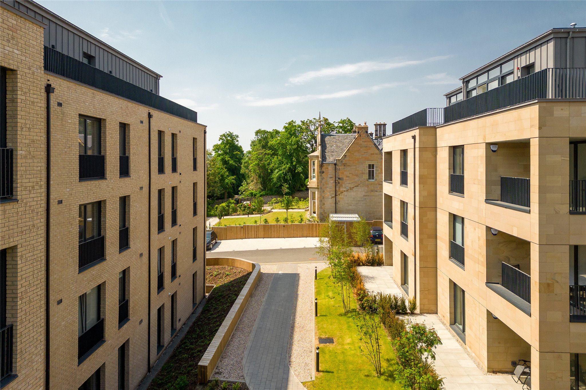 The new apartment blocks sit within the beautifully landscaped grounds and are finished in crisp sandstone, chosen to match the warm tones of the original buildings. All the homes benefit from allocated car parking and a curtain of mature trees shelters the development from the bustle of Corstorphine Road. Plots 1 and 2 also have their own private gardens and double garages.