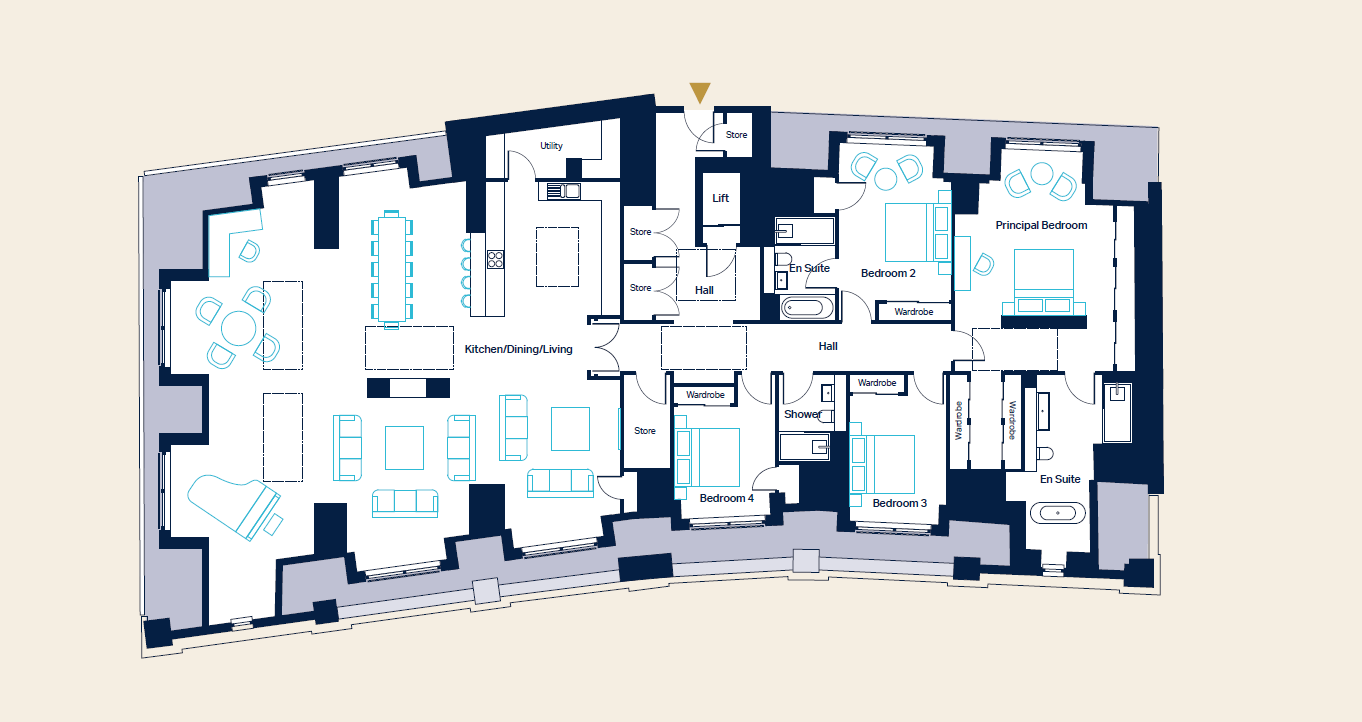 Continuing left from the hall, you are met by the four bedroom spaces, including the principal bedroom with it’s own en-suite and walk-in wardrobes. Bedroom 2 also has an en-suite, and there is a further bathroom inbetween bedroom 3 and 4.