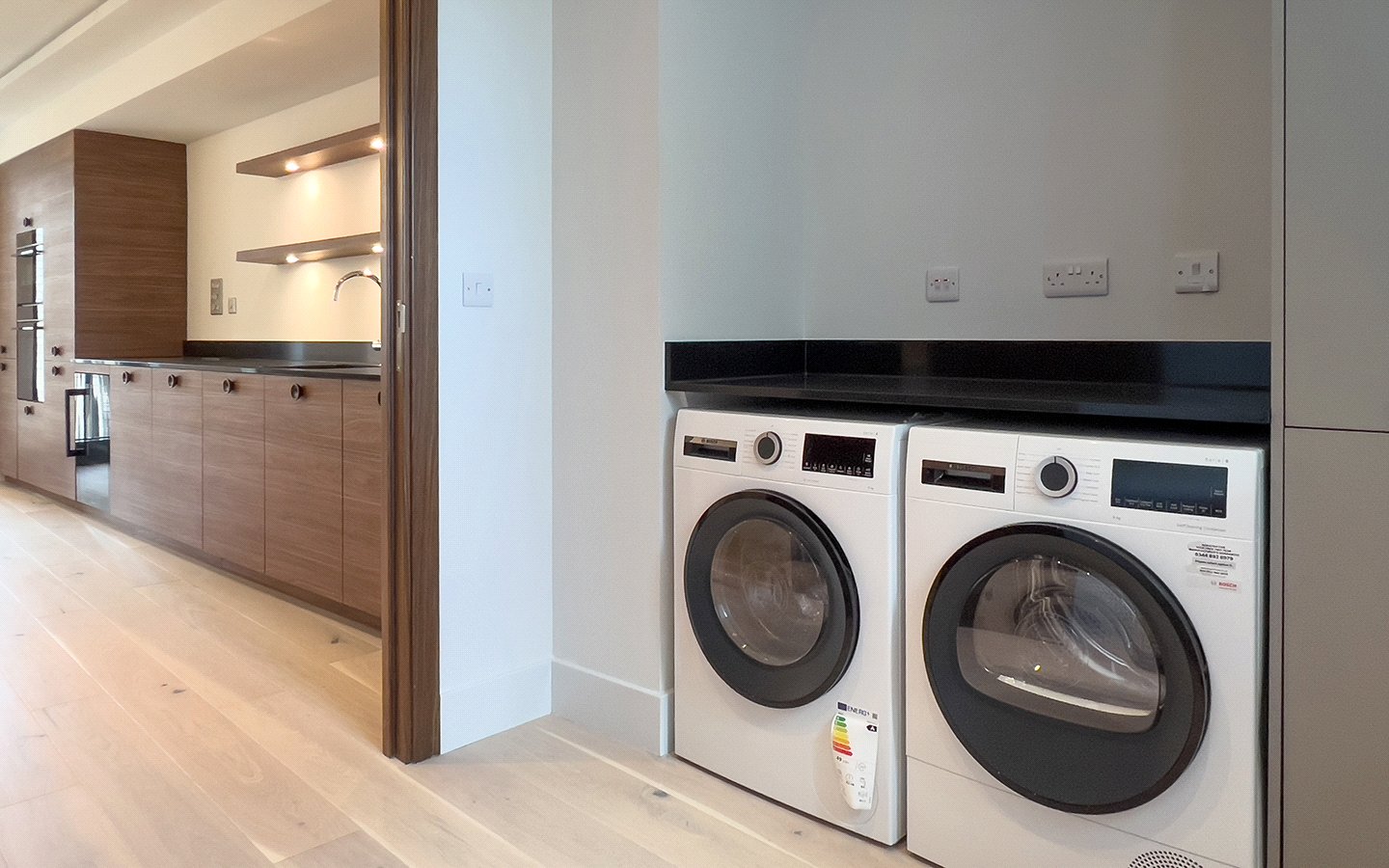 Premium kitchen design featuring bespoke fitted units, a breakfast bar, and integrated high-spec appliances. A utility room / utility cupboard provides space for a washer and tumble dryer, adding convenience and practicality.