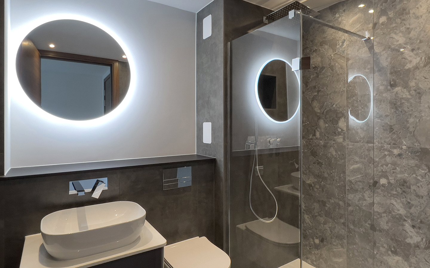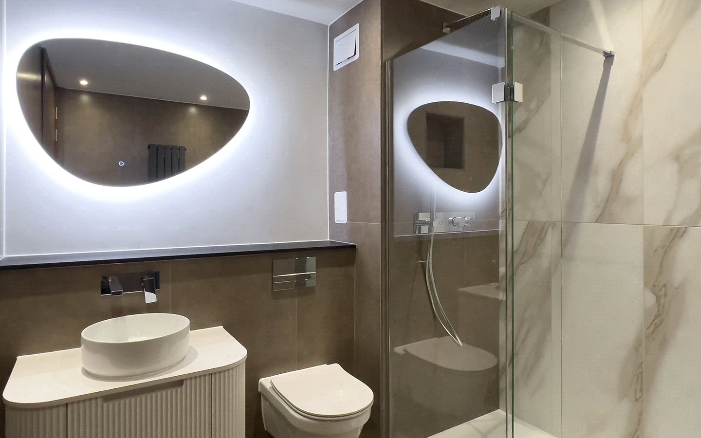 Luxury bathroom and en-suite, finished with large format tiling, designer sanitary ware and high-quality fittings.