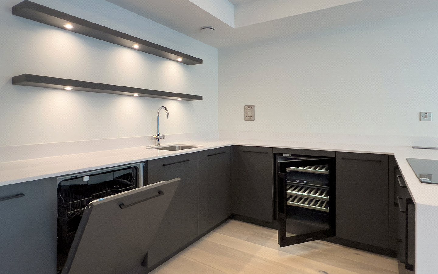 High-specification contemporary kitchen, complete with integrated appliances, sleek cabinetry and ample work surfaces, ideal for hosting or everyday use.
