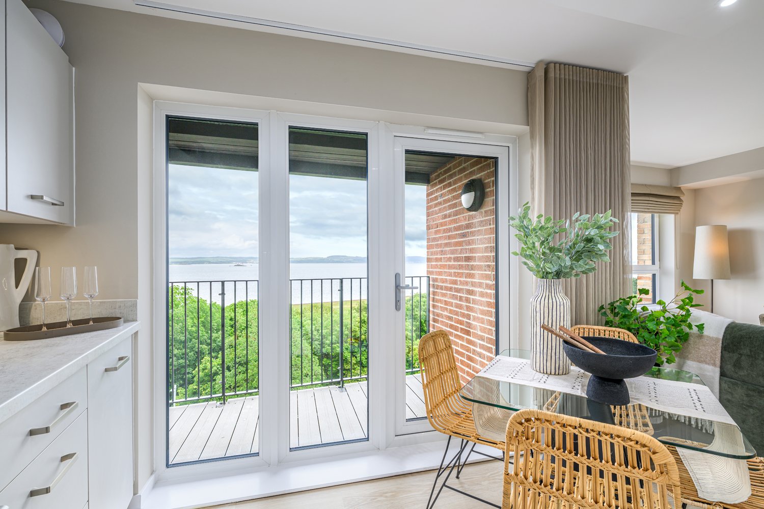 The property benefits from a large open-plan kitchen/living/dining area and a balcony, offering far reaching views towards the Firth of Forth.