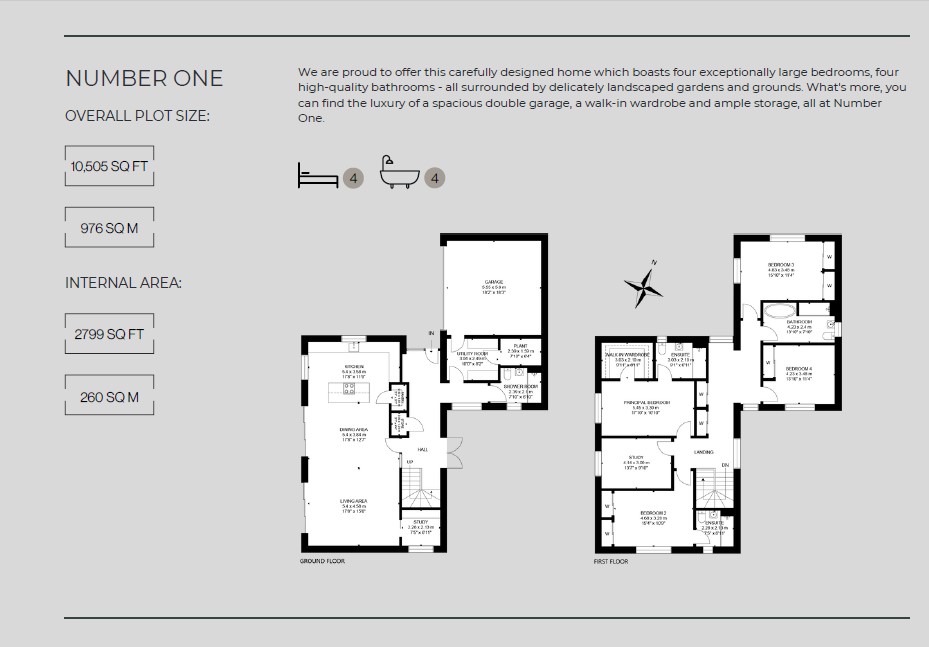 We are proud to offer the carefully designed Number One, a home which boasts four exceptionally large bedrooms, four high-quality bathrooms - all surrounded by delicately landscaped gardens and grounds. What's more, you can find the luxury of a spacious double garage, a walk-in wardrobe and ample storage, all at Number One.